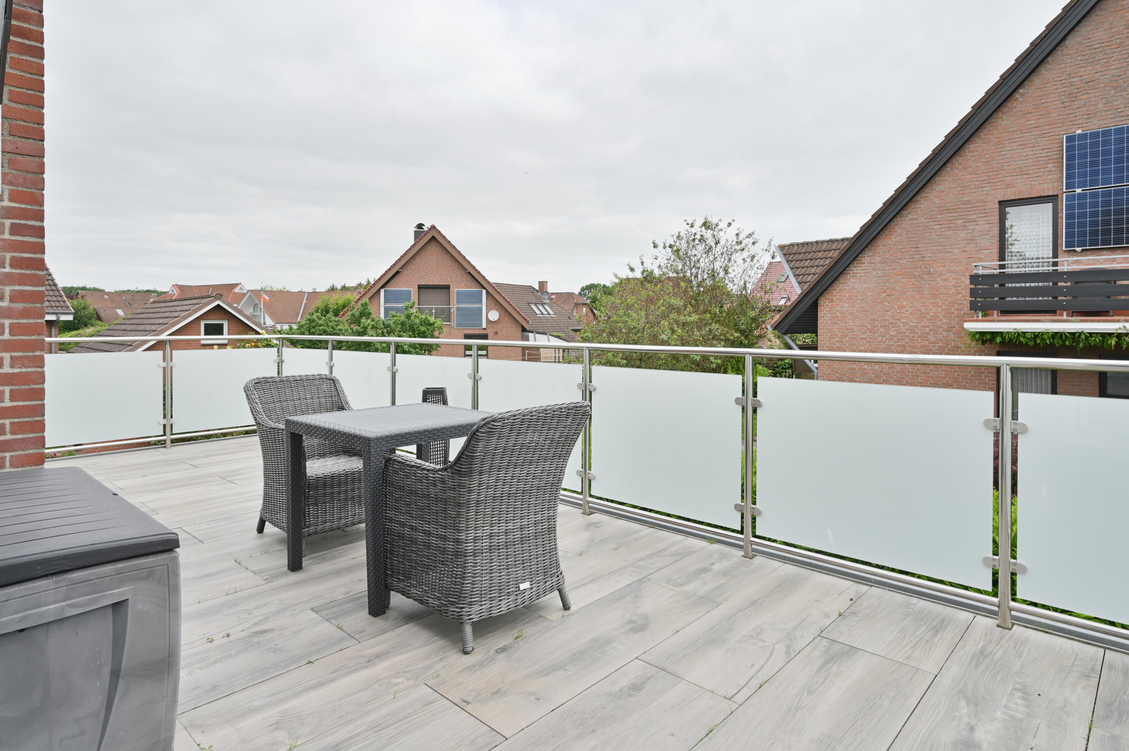 Der Wohnbereich besteht aus einer Couch mit Couchtisch und einem Flachbild-TV. Angrenzend an den Wohnbereich befindet sich der Dachterrassenbereich (ca. 20qm) mit neuen Balkonmöbeln, Liegen und Grillecke was zum Verweilen einlädt.