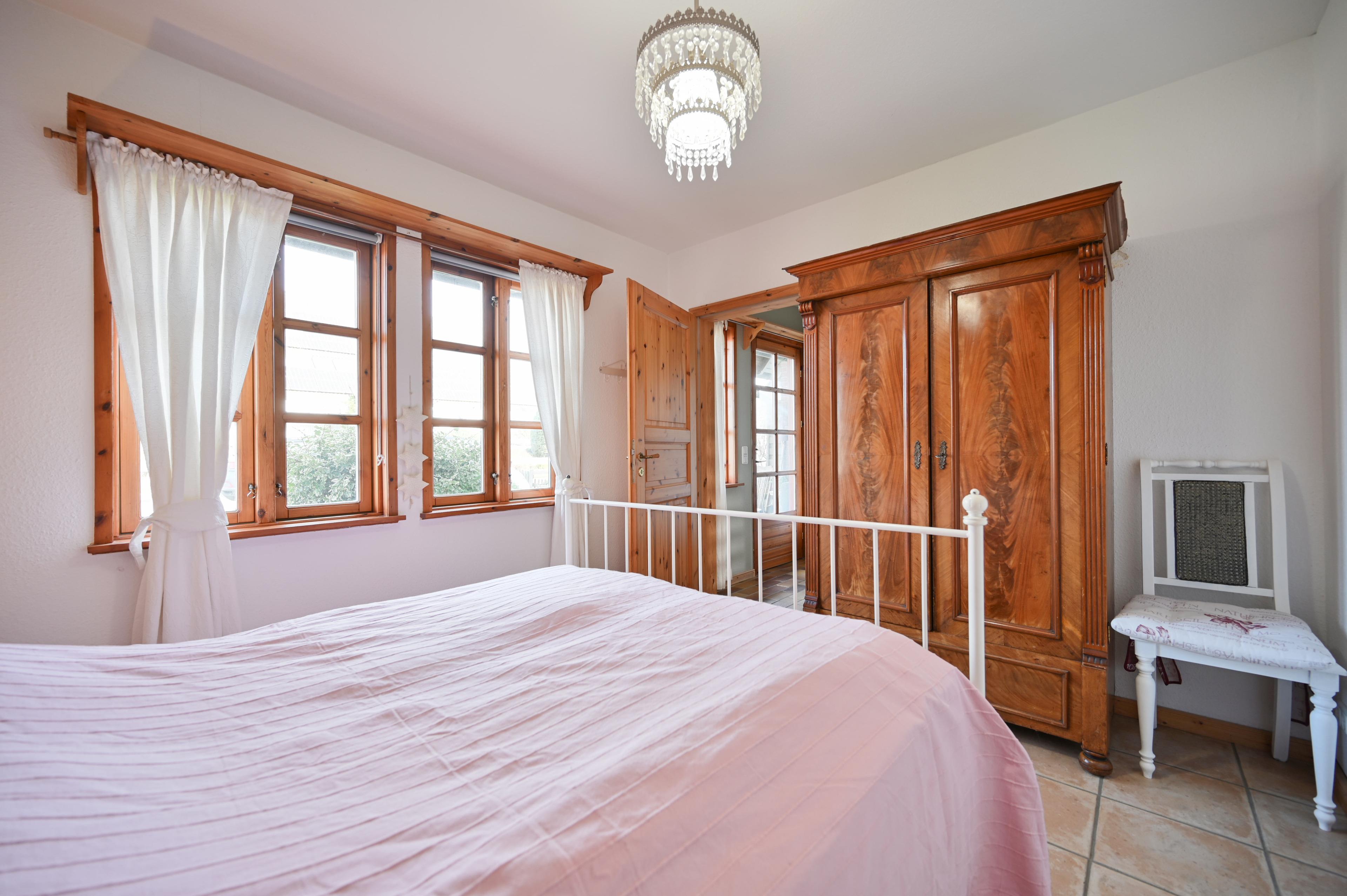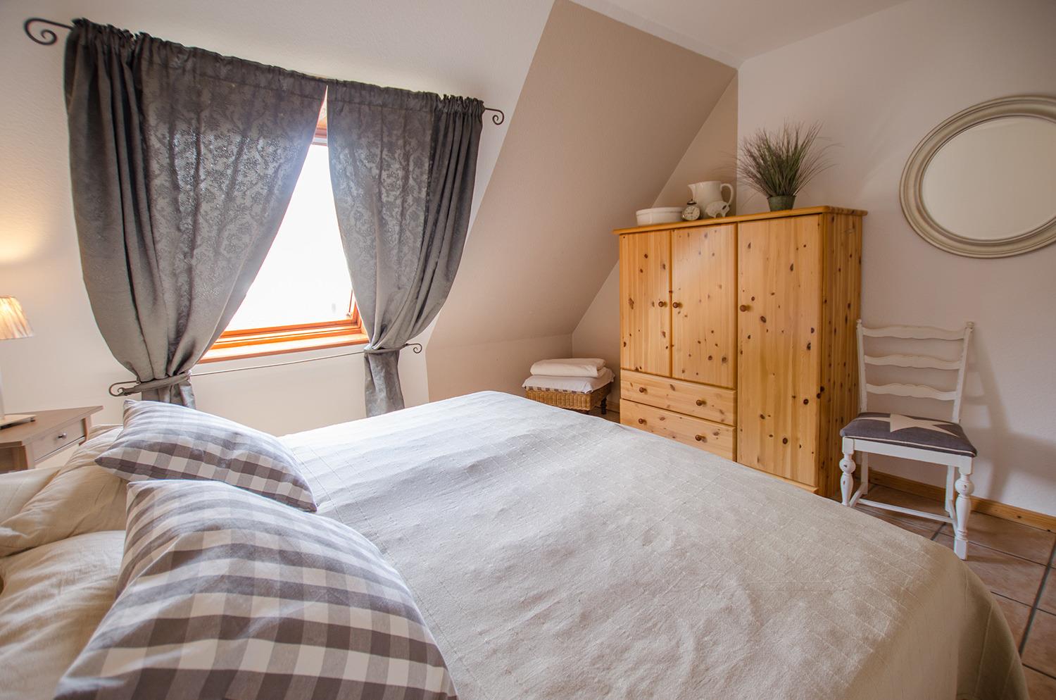 Im Obergeschoss befindet sich das Elternschlafzimmer ausgestattet mit Doppelbett (180 x 200cm 2 Matratzen), Kleiderschrank, Nachttische mit Leselampe.