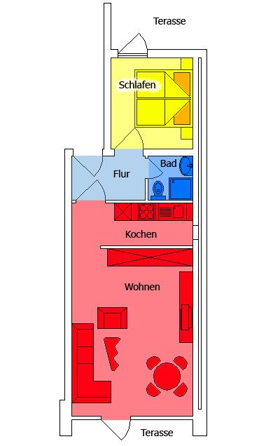 In dieser Ferienwohnung haben bis zu 4 Erwachsene auf 55m² genügend Platz.