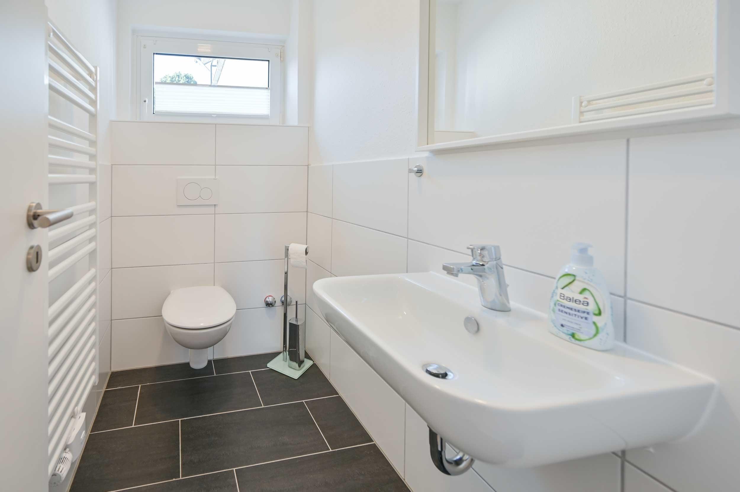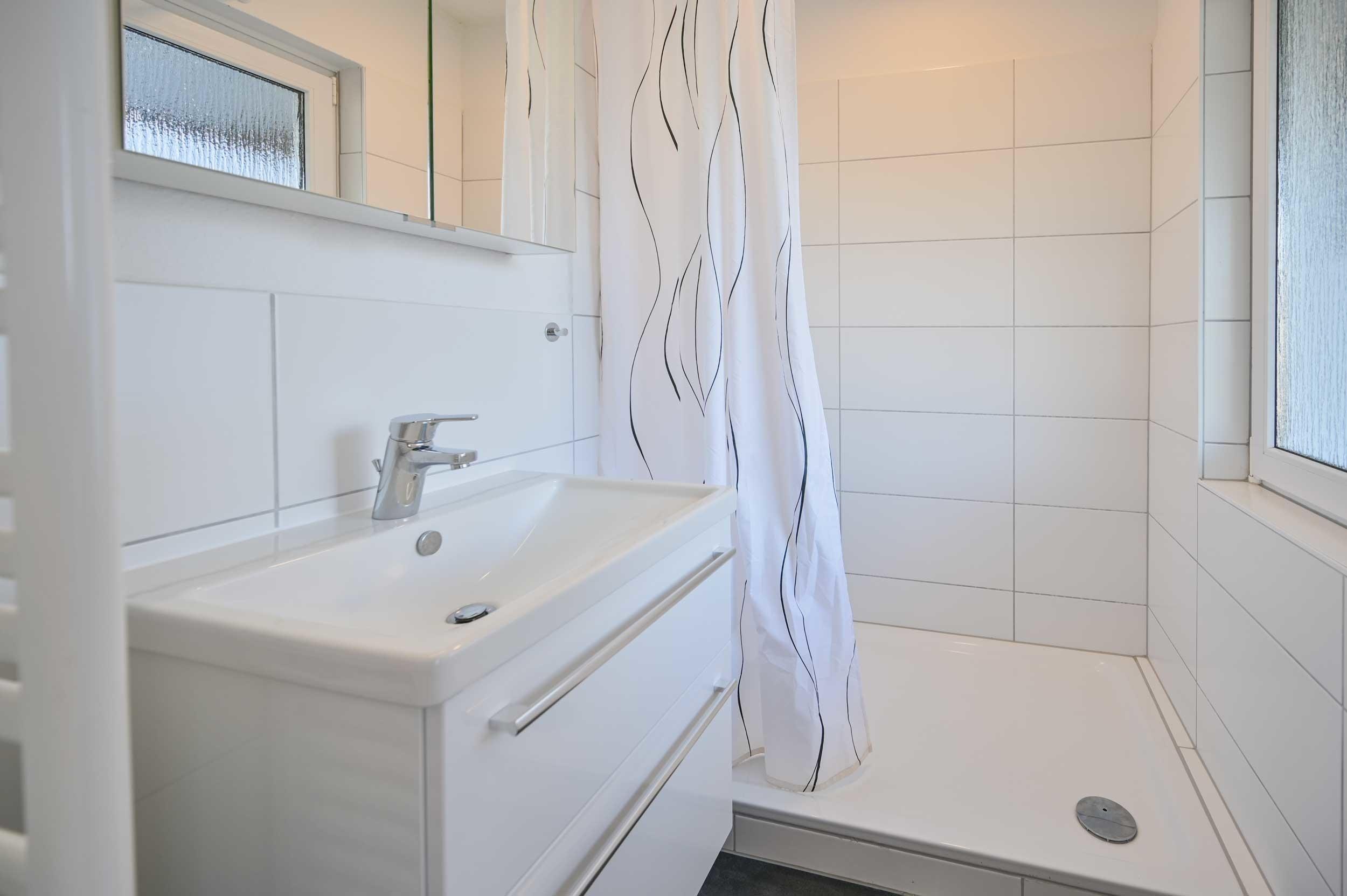 Das Badezimmer ist mit Dusche und Waschtisch ausgestattet. Das WC ist separat.