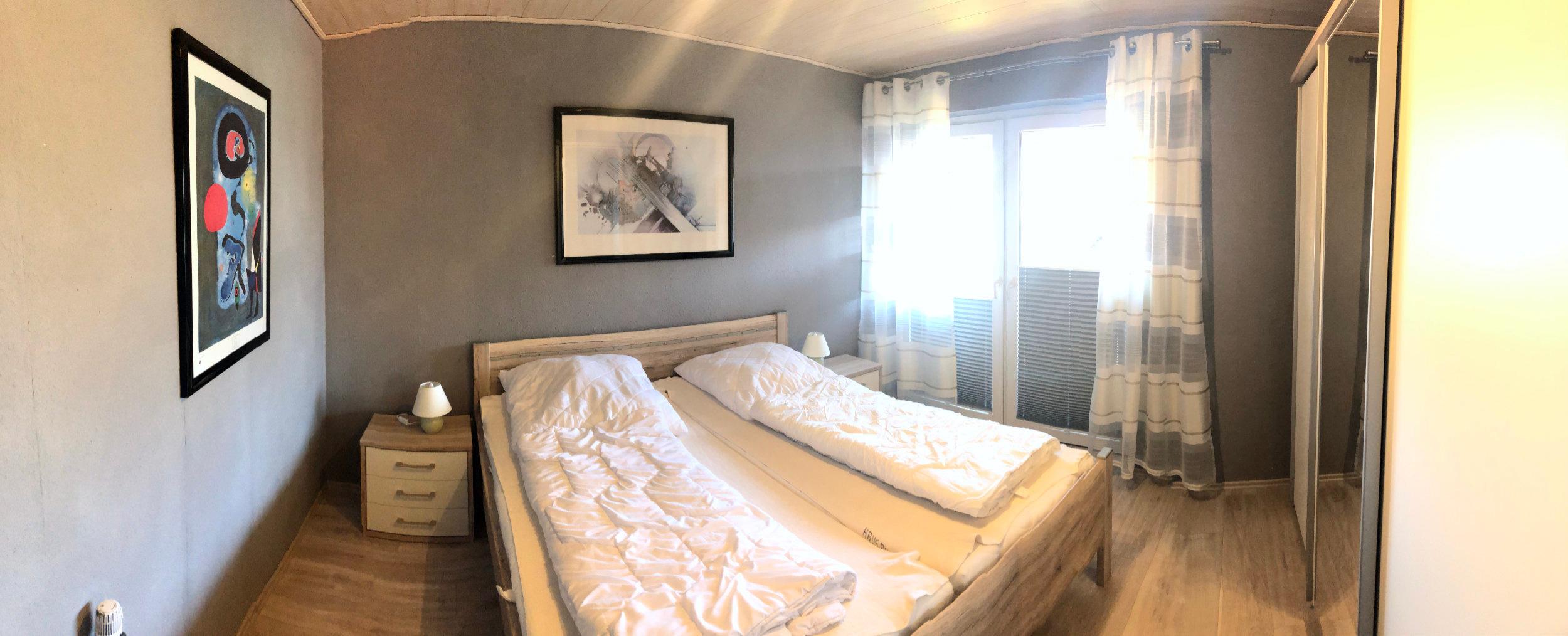 Ein Schlafzimmer ist mit einem Doppelbett mit Nachtschränken, Leselampen und einem großen Kleiderschrank mit großem Spiegel ausgestattet. Von diesem Zimmer ist ein Zugang zu einem zweiten kleinen Balkon.