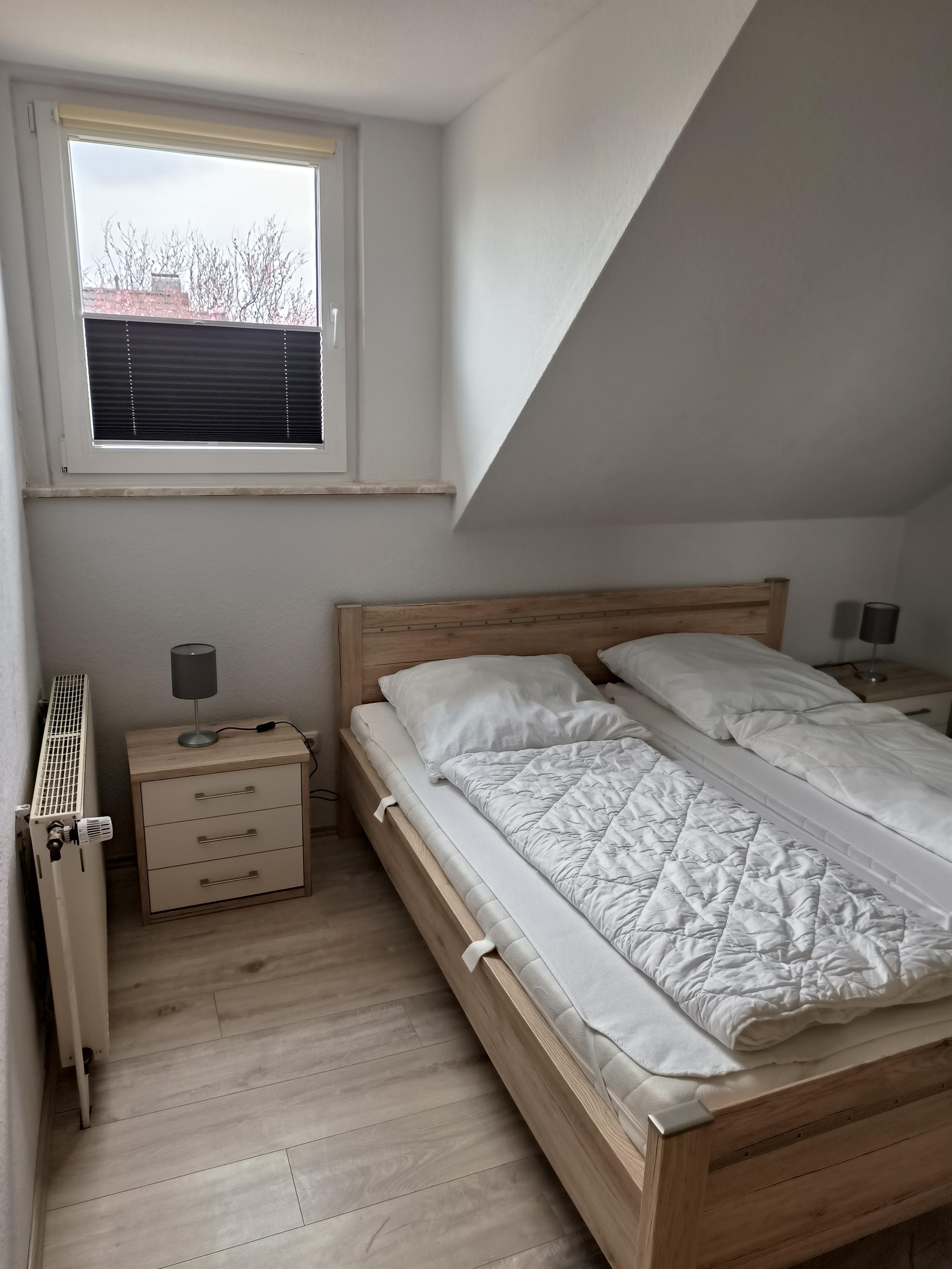 Ein weiteres Schlafzimmer hat ebenfalls zwei Betten, die als Einzelbetten oder als Doppelbett genutzt werden können. Außerdem gibt es zwei Nachtschränkchen und einen Kleiderschrank mit Spiegel.