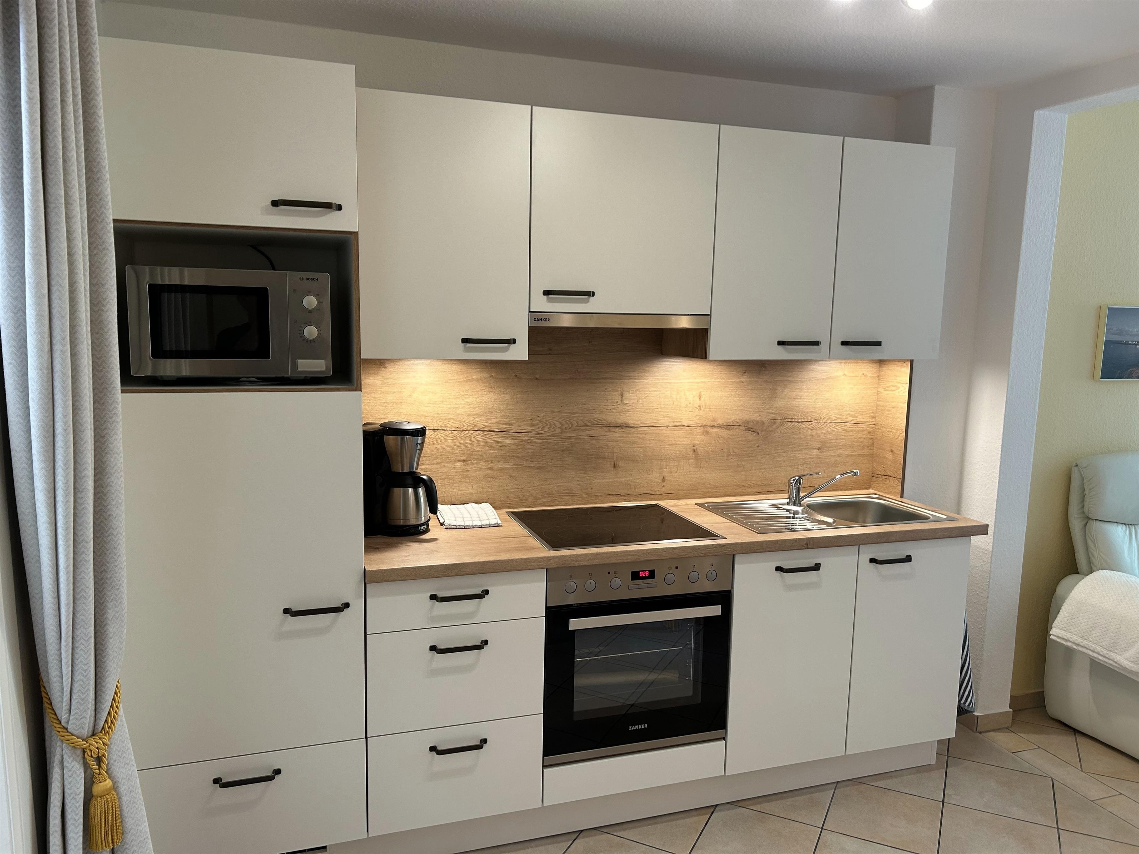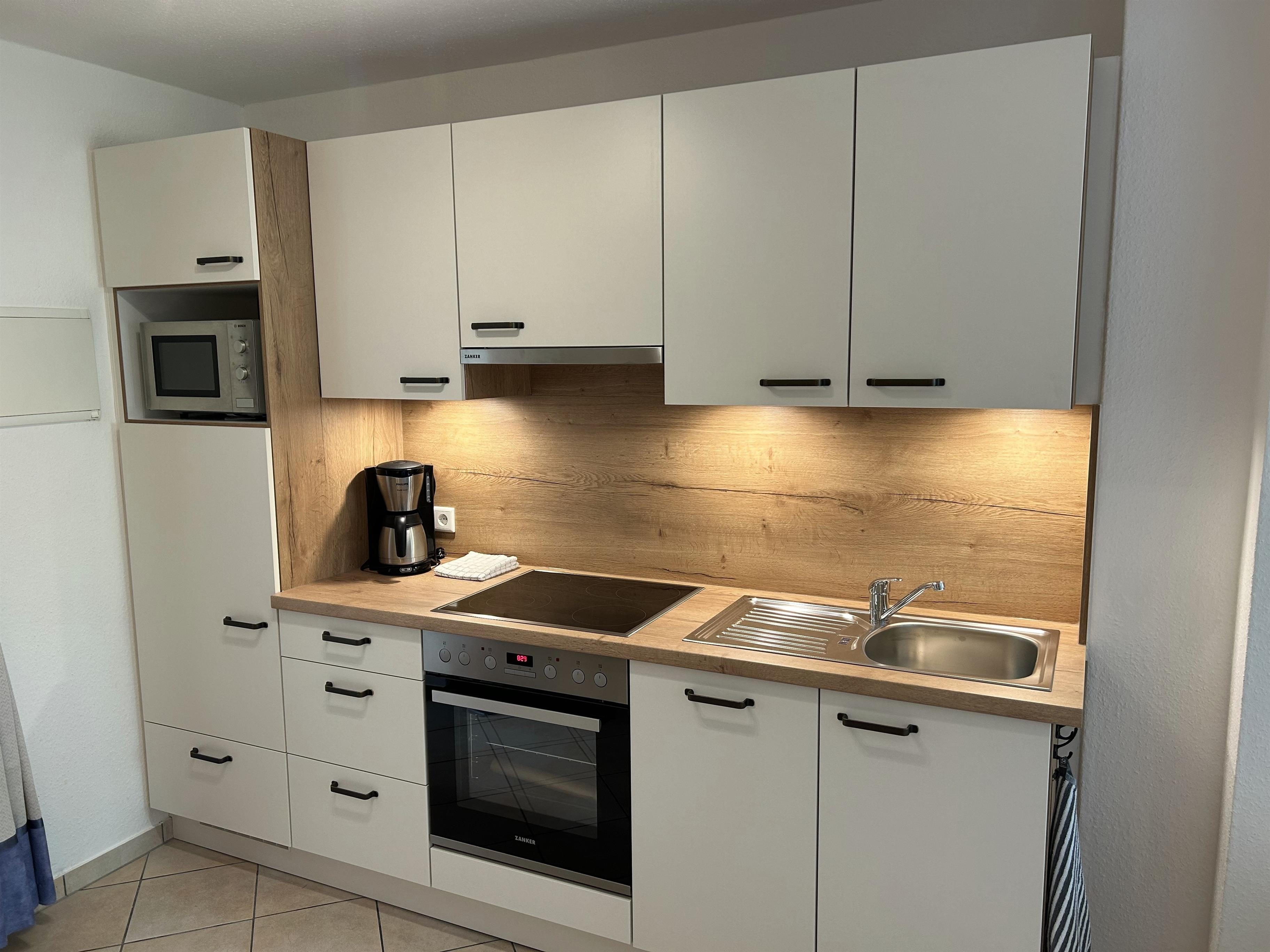 Die Küchenzeile ist mit allem ausgestattet, was zum Kochen benötigt wird.