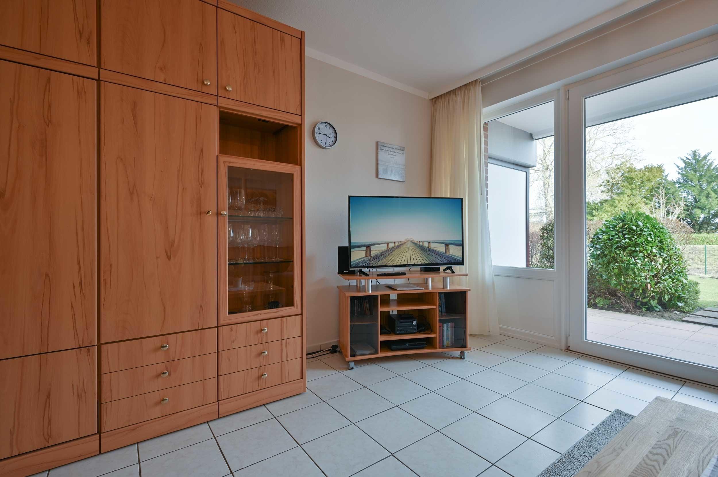 Der kombinierte Wohn- Schlafraum ist in eine Ess- und eine Couchecke aufgeteilt. Hier steht ein Schrankwandbett für Sie bereit. Die Fensterfront lässt sich mit den Außen-Rollläden verdunkeln. Unterhaltung bietet der SAT-TV-Flachbildschirm und eine Stereoanlage. Auf Anfrage erhalten Sie kostenlos den Zugang zum WLAN.