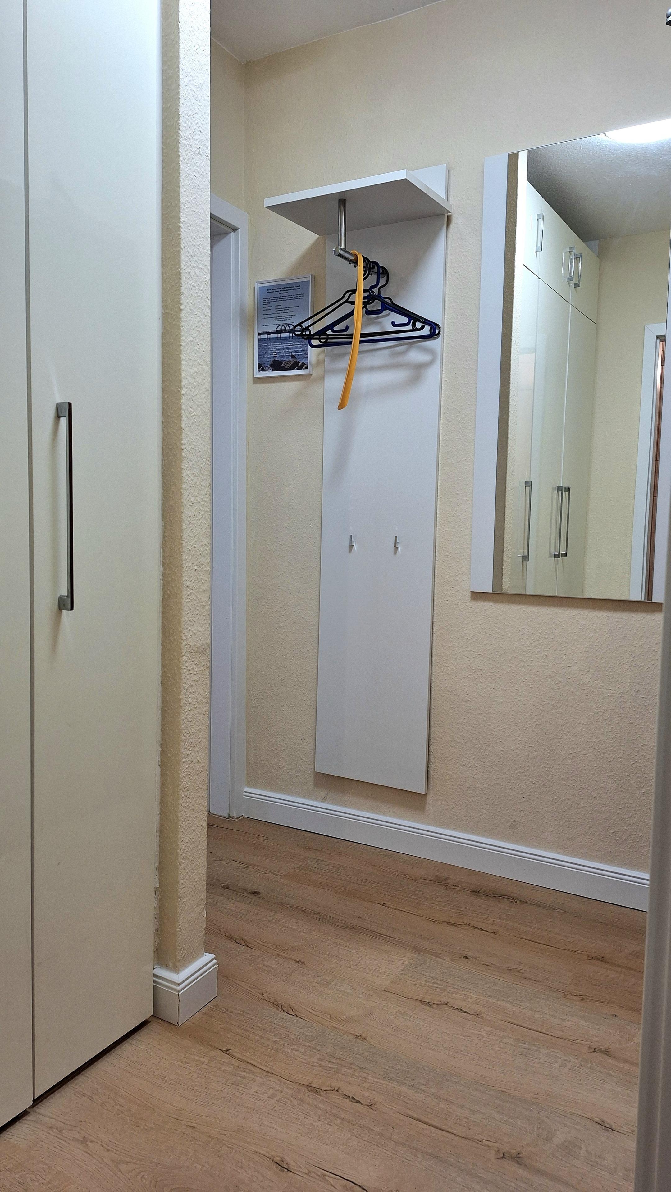 Der Flur verfügt über eine Garderobe und einen großen Einbau-Garderobenschrank.