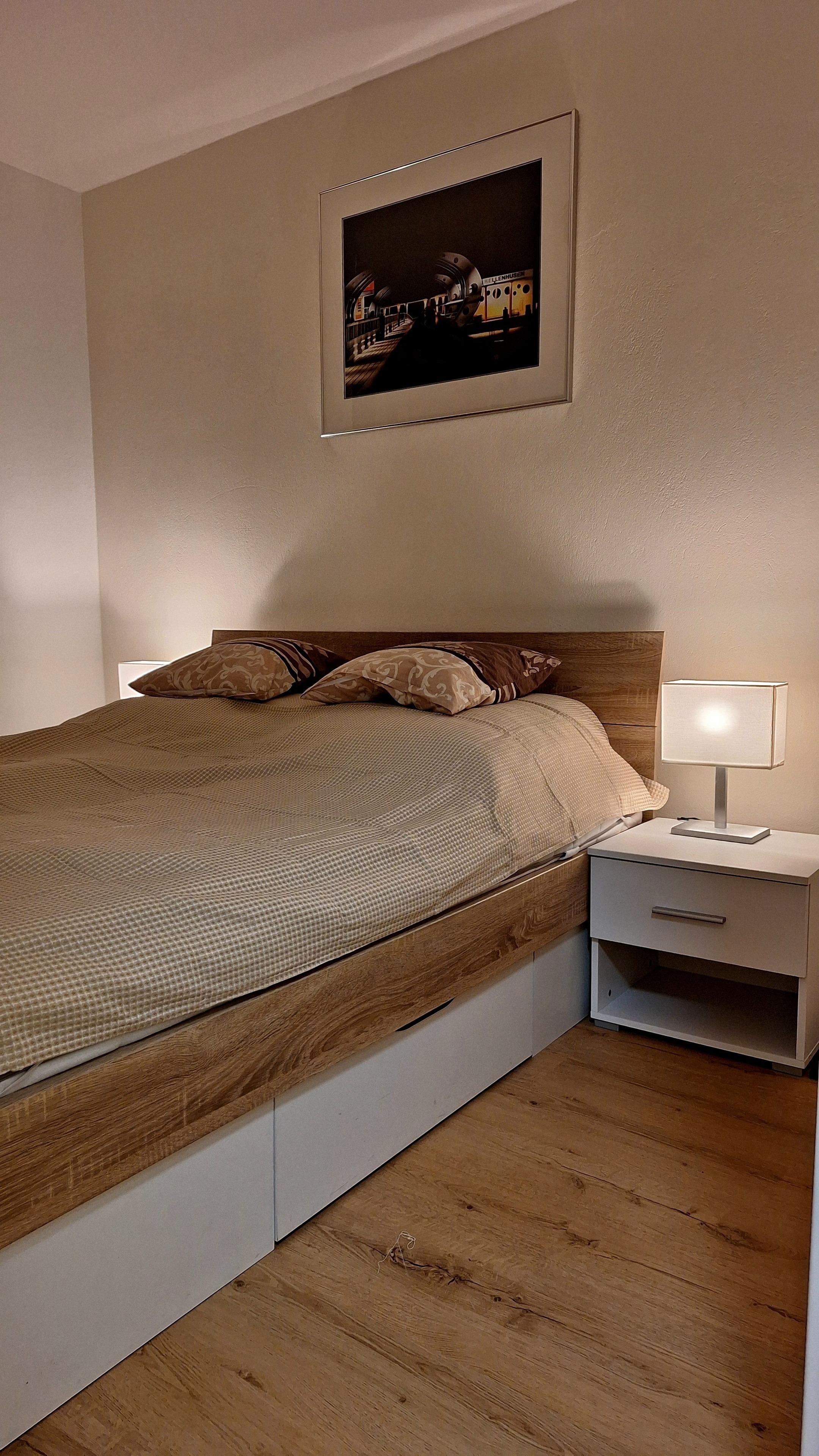 In dem großen kombinierten Wohn-/Schlafraum befindet sich ein Doppel-Schrankwandbett mit Lattenrost. Außerdem steht eine Esstisch für 4 Personen und eine gemütliche Couchecke bestehend aus Sessel, Sofa ( 3-Sitzer ) und Hocker für entspannte Abende zur Verfügung.