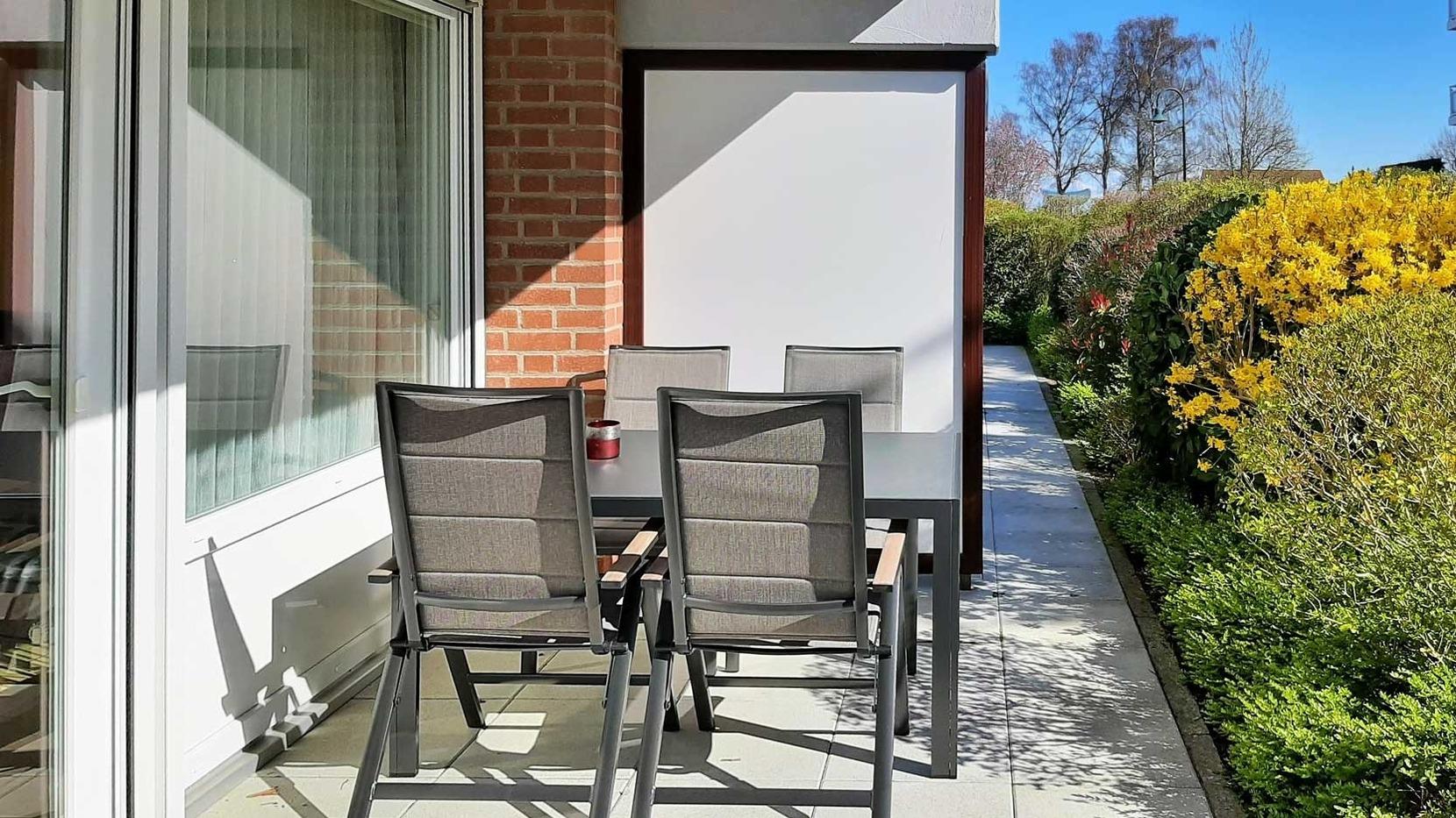 Vor dem Wohnzimmer befindet sich eine wunderschöne Terrasse, die mit Gartenmöbeln bestückt ist. Von hier aus haben Sie Gartenzugang. Die Nähe zum Meer beschert Ihnen vom leisen Plätschern bis hin zum Rauschen der Ostsee von Kellenhusen einen stetigen Ohrenschmaus.