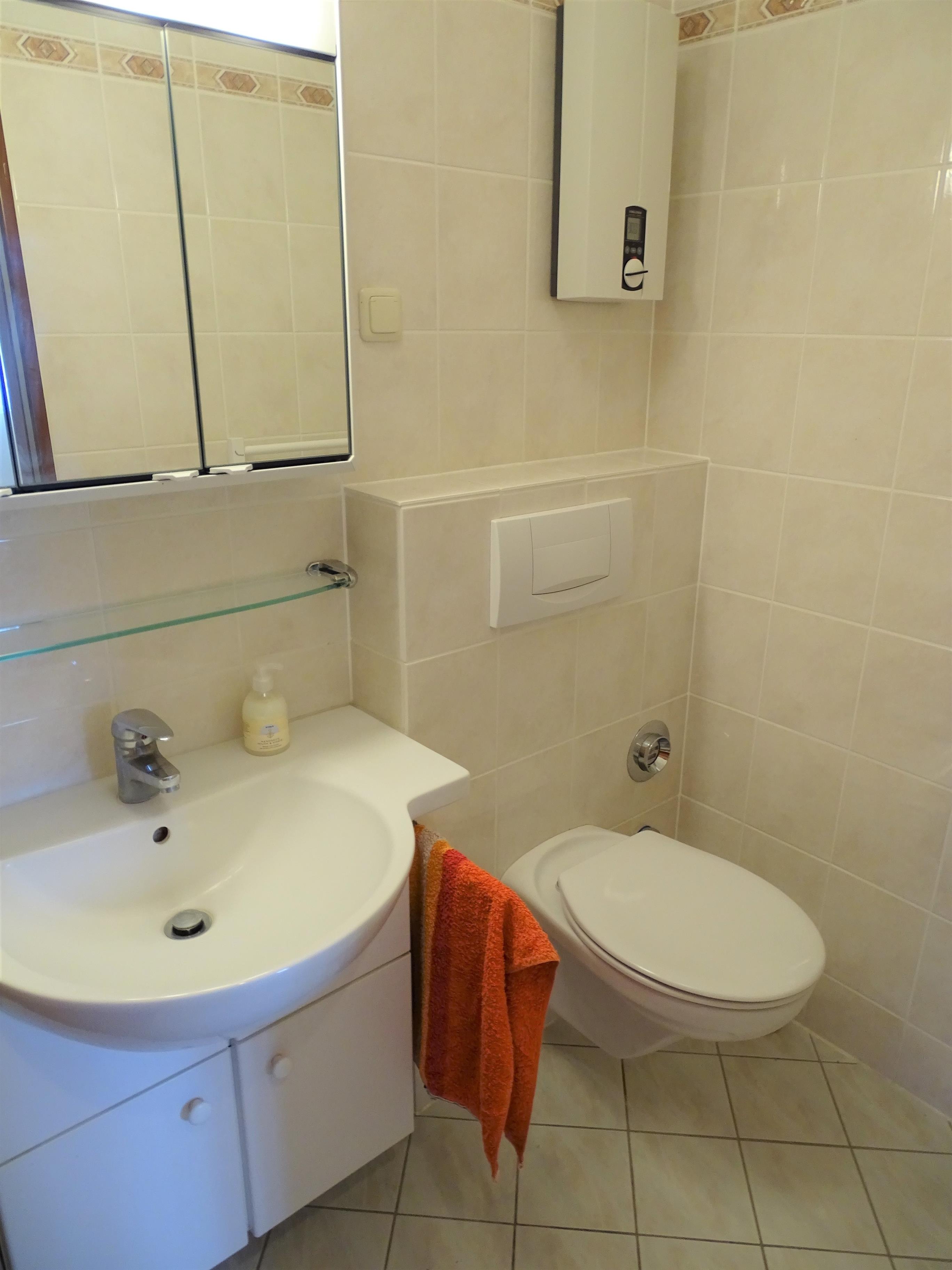Aufgeteilt ist die Ferienwohnung mit einer neuen Küchenzeile, Bad mit Dusche und WC, Wohnzimmer mit Esstisch und Terrassenzugang, einem Schlafzimmer mit Doppelbett ( 140 x 200 ) und einem Kinderschlafzimmer mit einem Einzelbett.