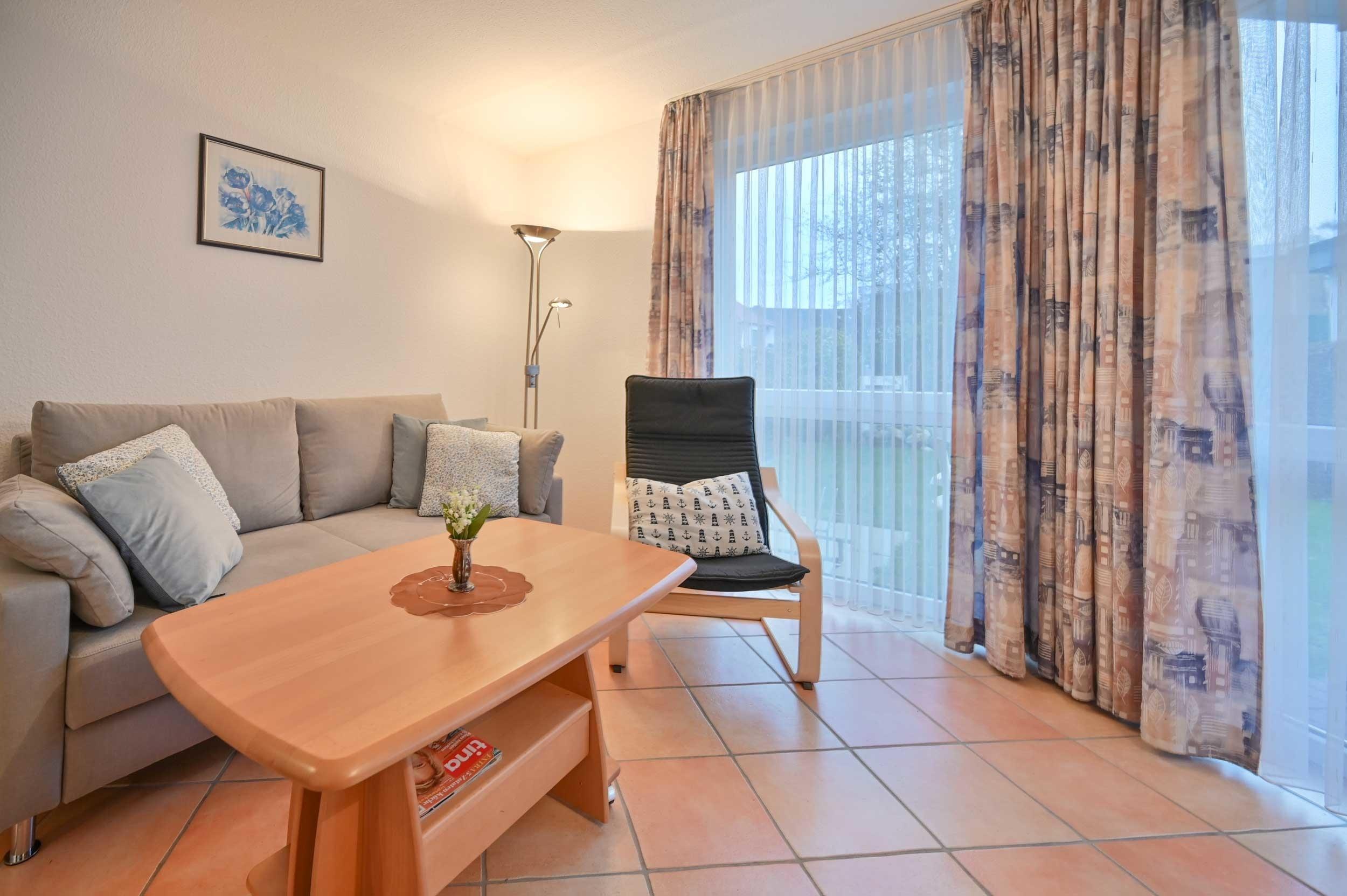 Die Ferienwohnung verfügt über ein neues gemütliches Wohnzimmer mit Schlafcouch, Relax-Sessel, Couchtisch, TV-Möbel mit Flachbild-TV und Esstisch mit 4 Stühlen. Von hier aus haben Sie Zugang zum möblierten Balkon und zum Gartenteil.