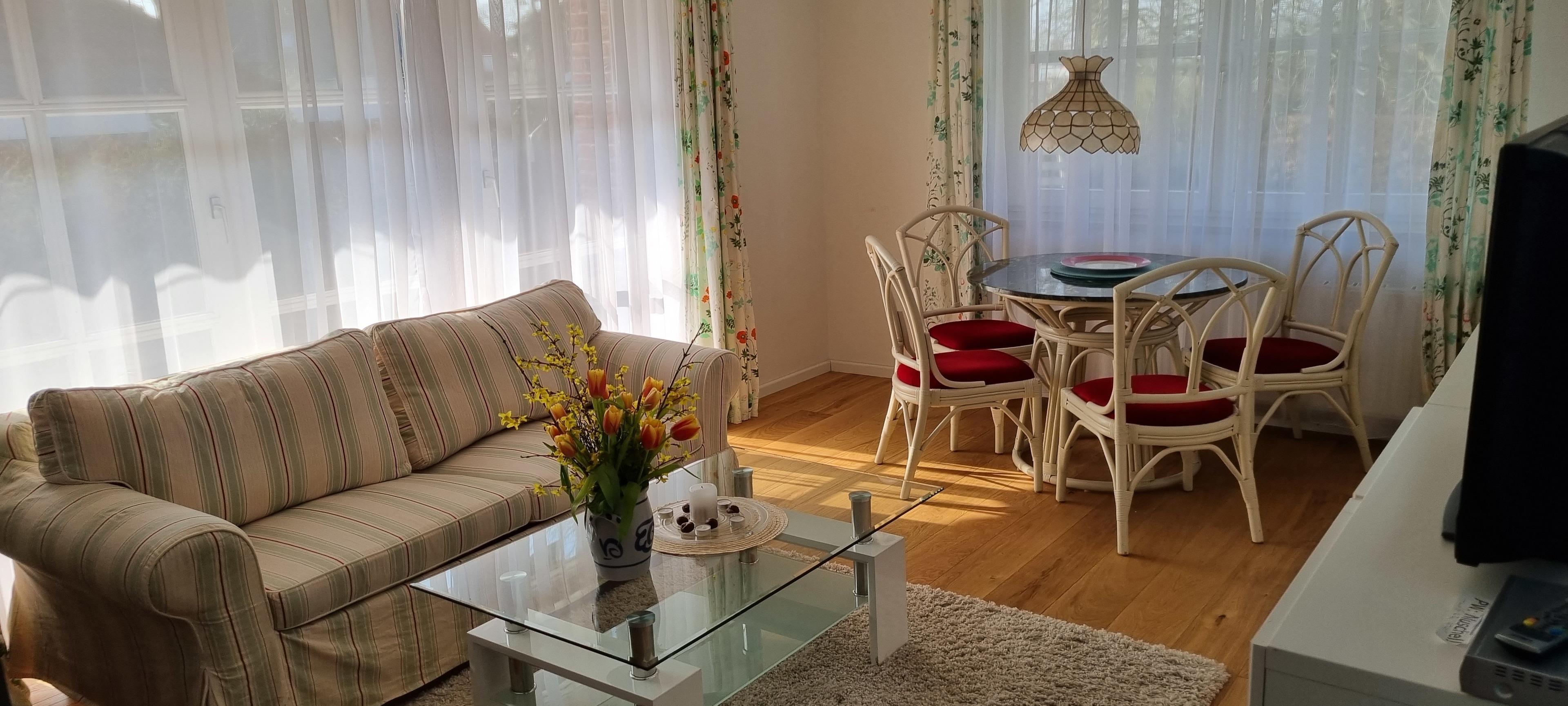 In dieser hellen, mit frischen Weiß- und Bunttönen eingerichteten Erdgeschosswohnung, werden Sie gern häufiger Urlaub machen wollen. Die weißen Sprossenfenster und das große Terrassentürelement, ebenfalls mit Sprossenscheiben, vermitteln eine anheimelnde Atmosphäre und geben den Blick frei in einen Obstbaumgarten mit großer Liegewiese. Dort können Sie ebenso Grillen wie auf der teilüberdachten zusätzlich mit Markise ausgestatteten großen Terrasse. Auf Wunsch stellen wir Ihnen eine Mikrowelle, Kinderbett und Hochstuhl unentgeltlich zur Verfügung. Waschmaschine und Trockner werden über einen Münzautomaten abgerechnet. Über WLAN haben Sie kostenlosen Internetzugang. Unseren Garten können Sie zum Spielen und Entspannen nutzen, Sandkasten und Schaukelgerät, Liegestühle und sonstige Gartenmöbel stehen Ihnen zur Verfügung.