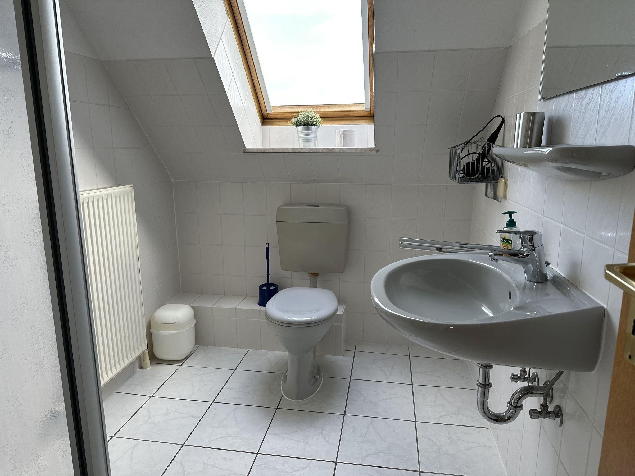 Das Badezimmer ist mit Dusche und WC ausgestattet.