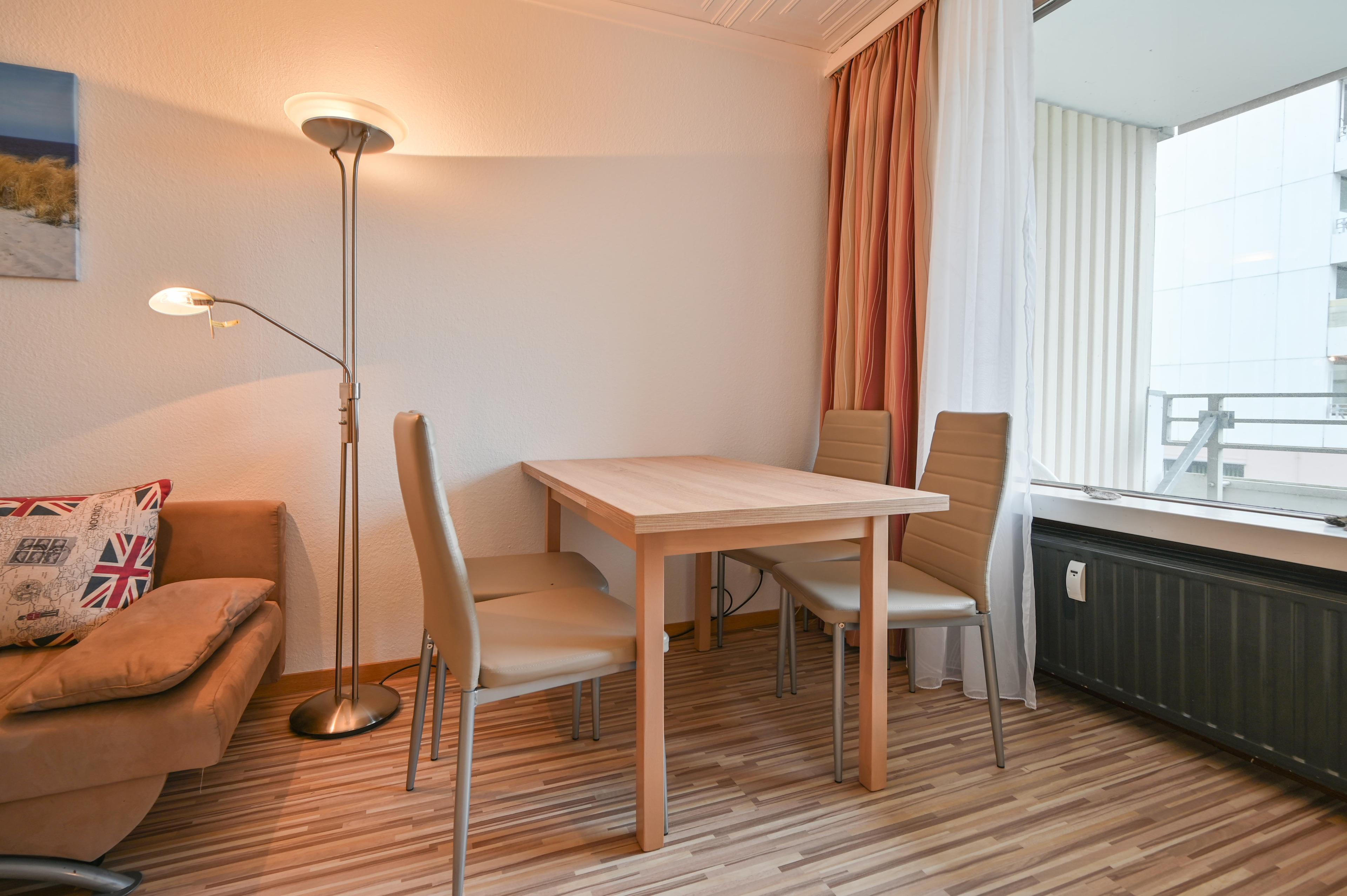 Desweiteren befinden sich hier ein Essbereich mit 4 Stühlen sowie ein großer Flachbildschirm.