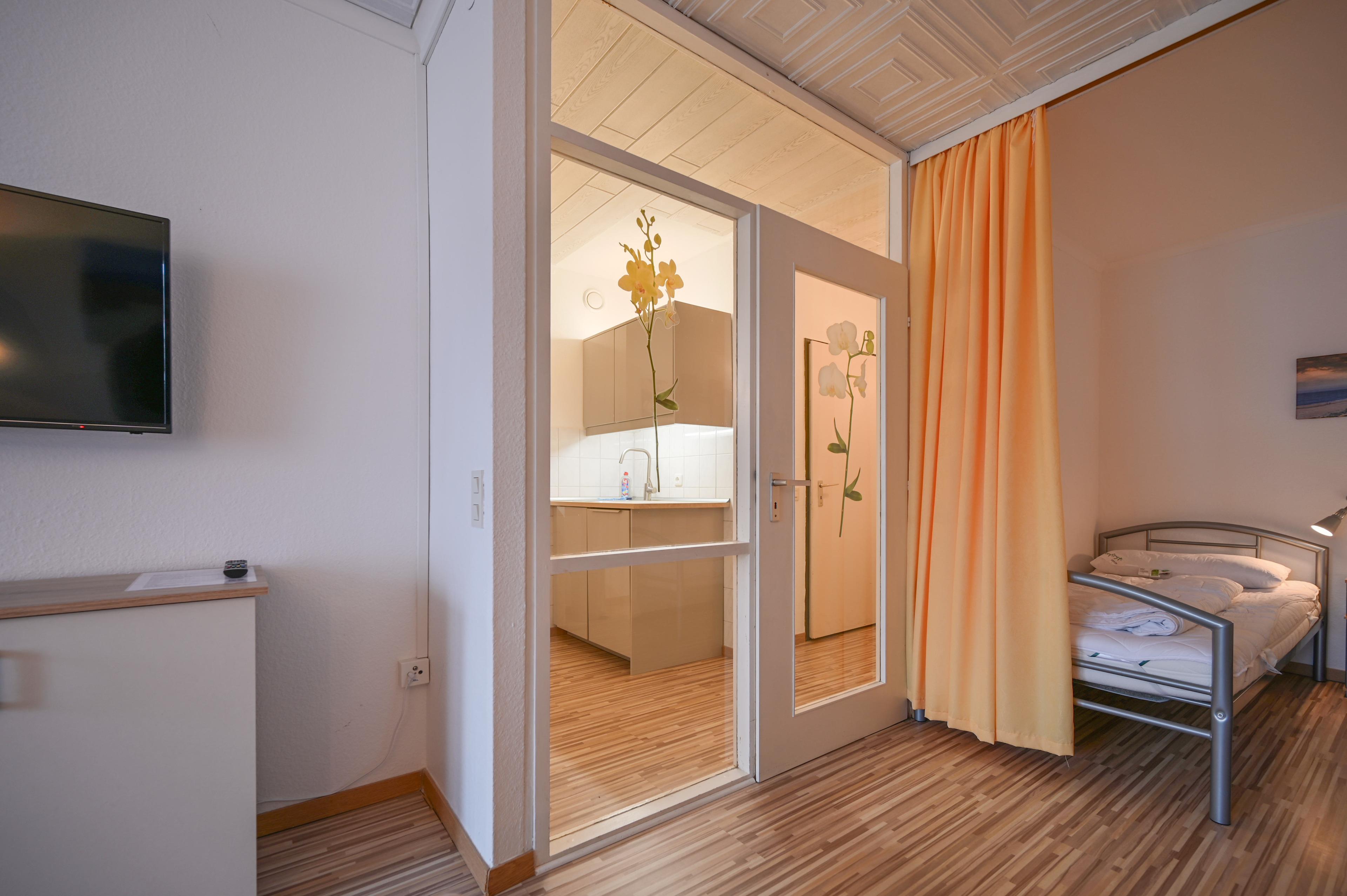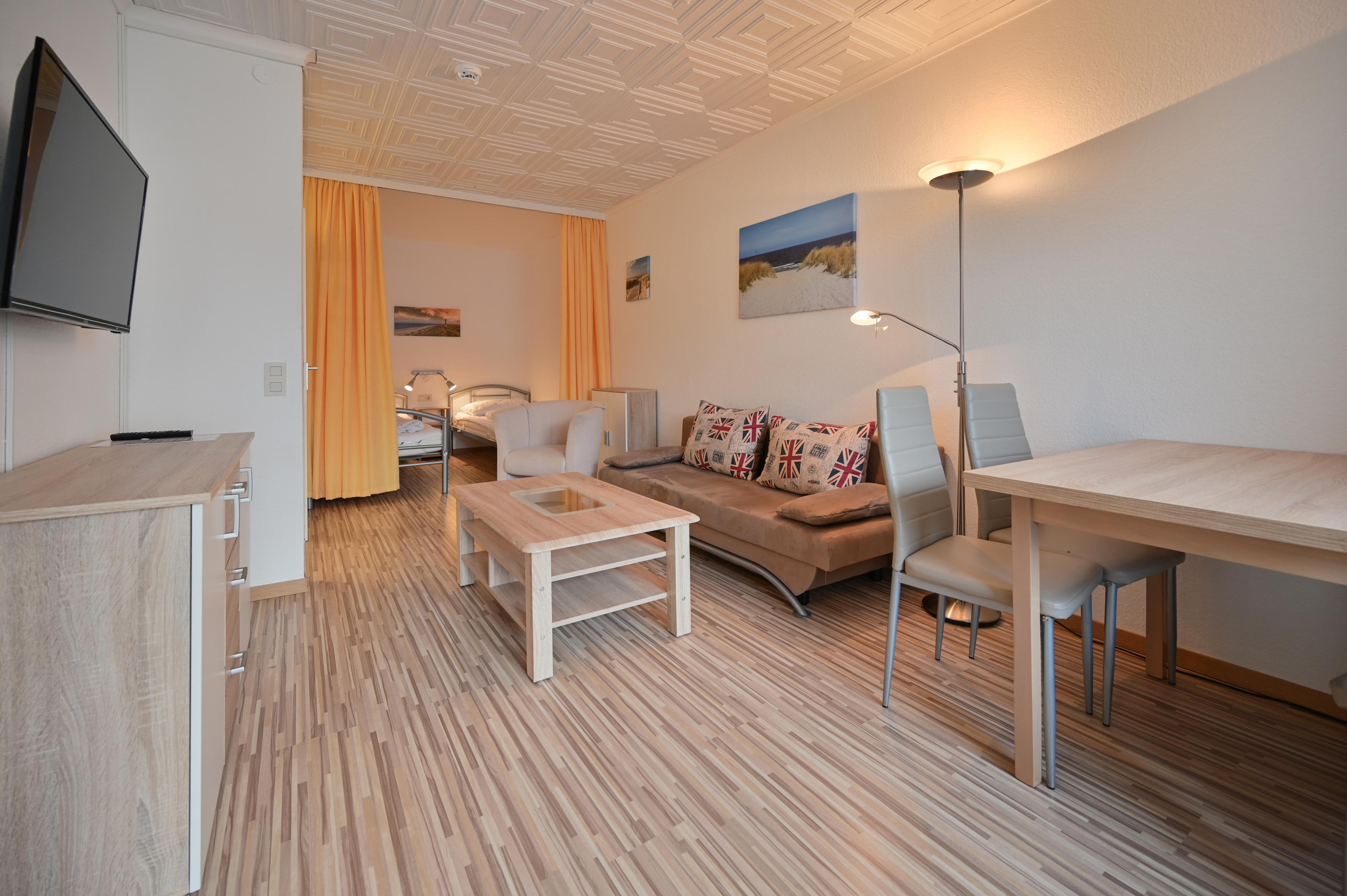 Die Ferienwohnung verfügt über einen kombinierten Wohn- Schlafraum mit 2 feststehenden Einzelbetten, die durch einen Vorhang vom Wohnbereich abgetrennt werden können.