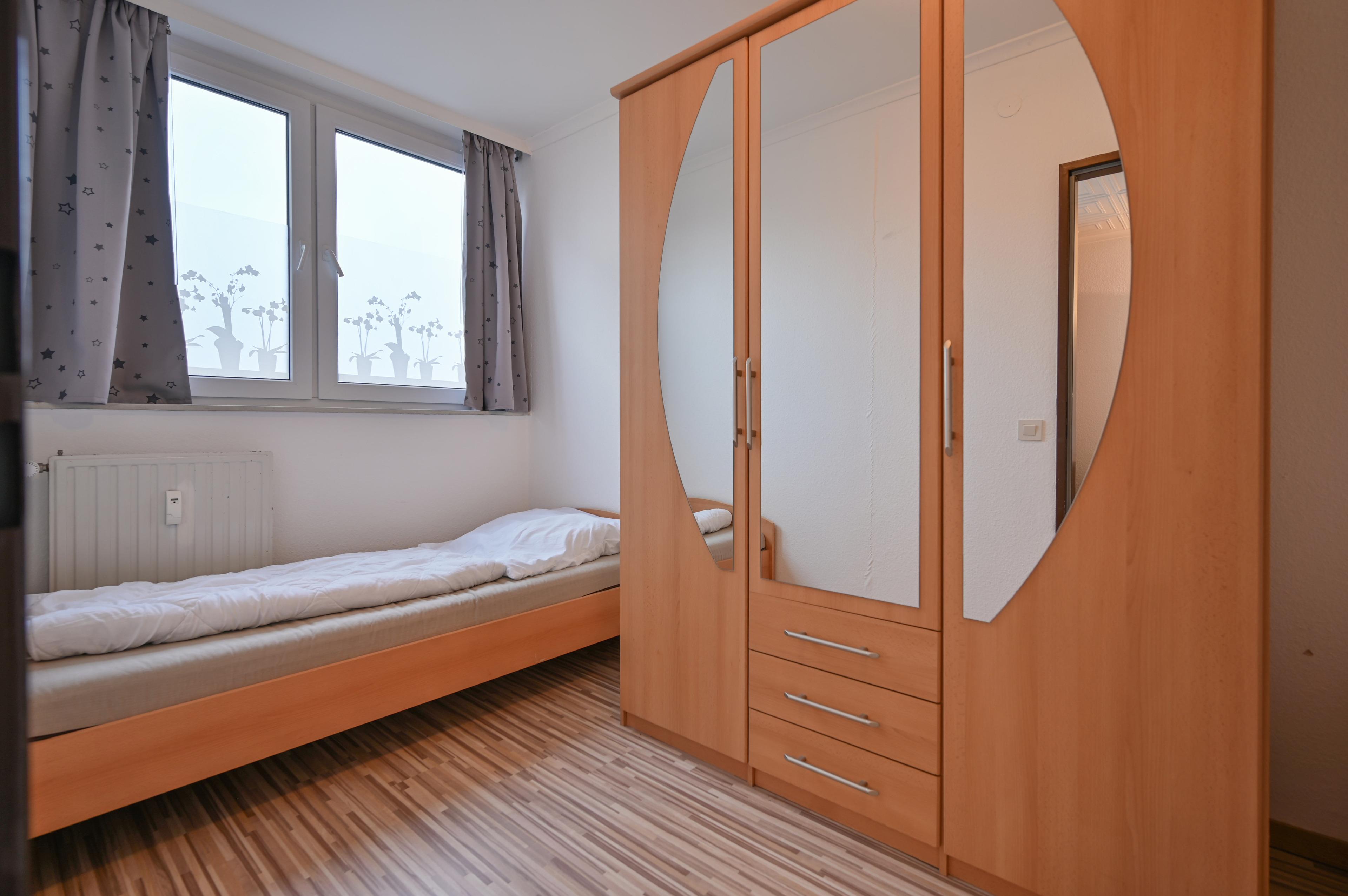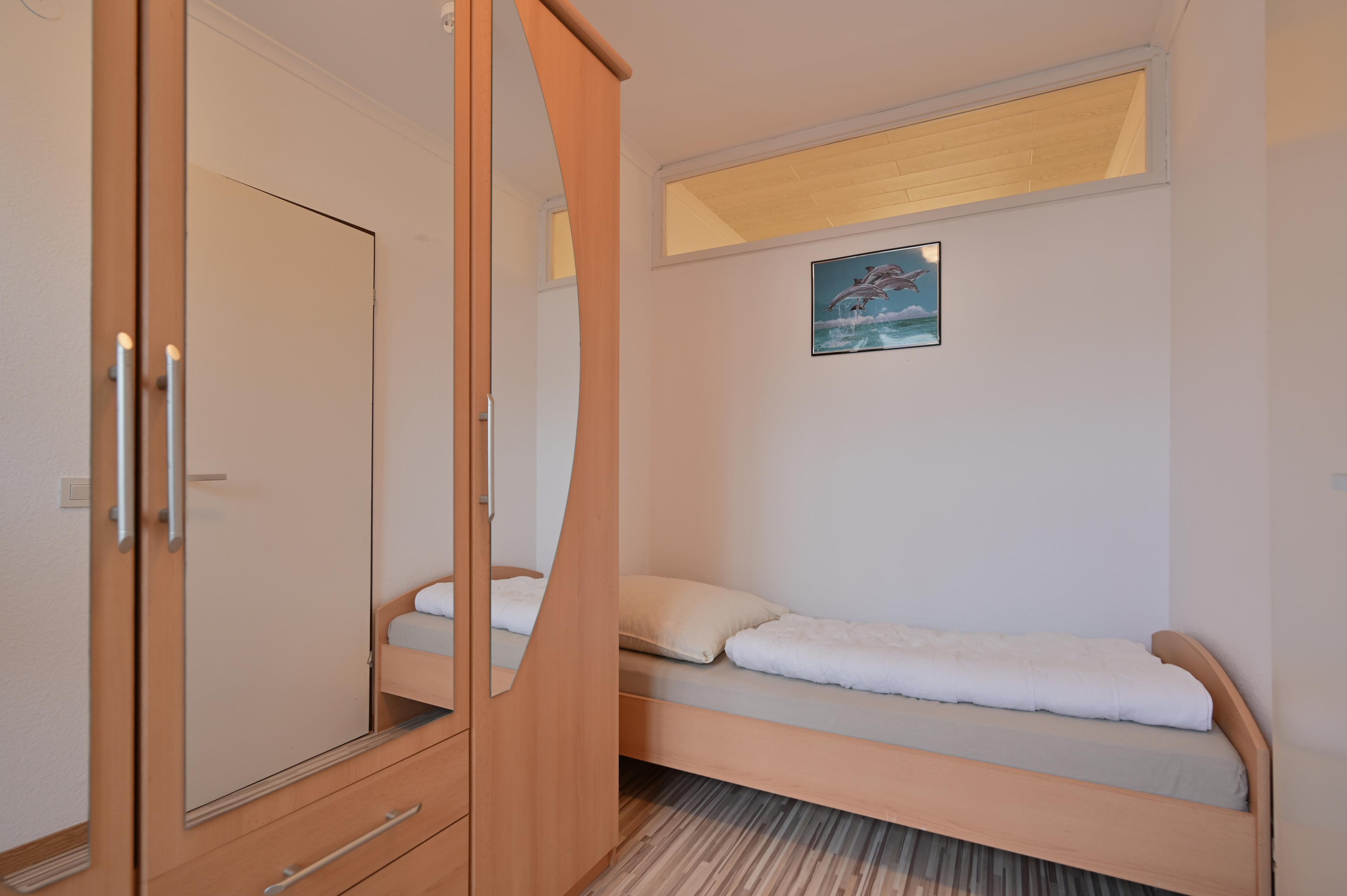 Von hier aus gelangt man in das seperate Schlafzimmer mit einem großen Schrank und 2 Einzelbetten.