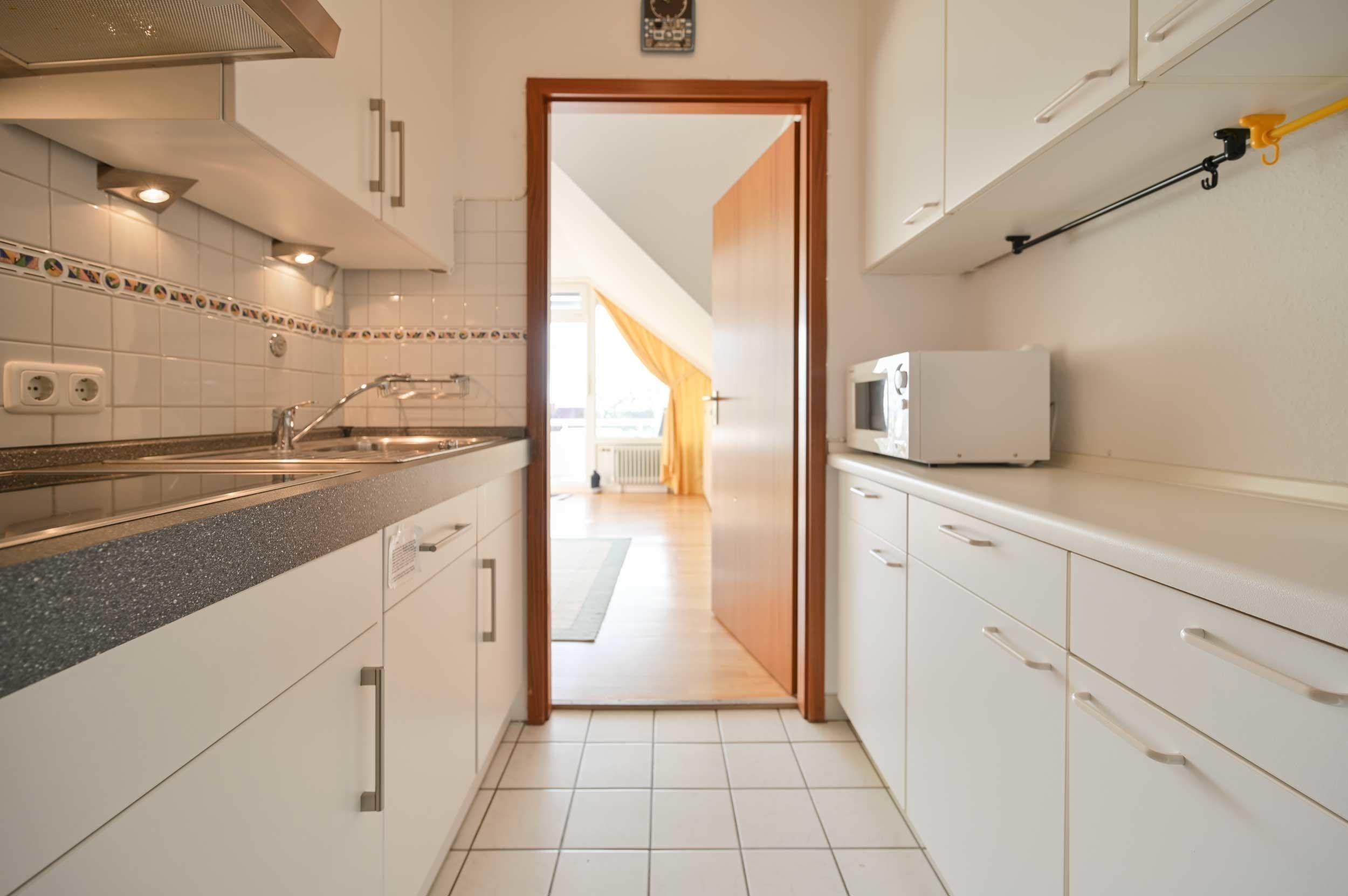 Die separate Einbauküche verfügt über eine Mikrowelle, einen 4-Platten Herd (Ceranfeld), eine kleine Spülmaschine, Toaster, Kaffeemaschine, Wasserkocher und einen Stabmixer. Der Kühlschrank verfügt über ein 3-Sterne-Eisfach.