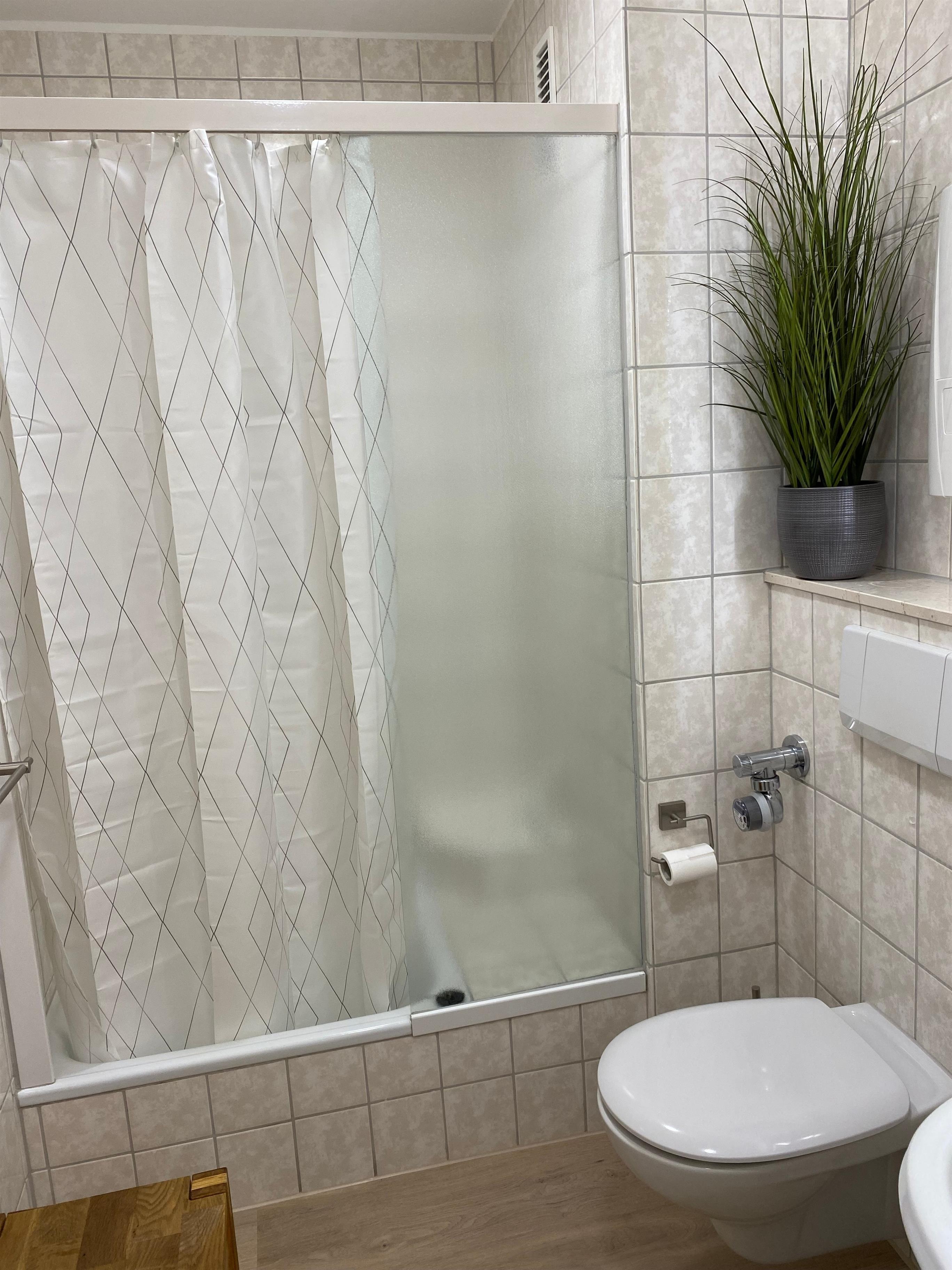 Die Wohnung ist mit einem Dusch- und WC ausgestattet. Dieses bietet eine großzügige Wannen-Dusche und viel Platz für Ihre mitgebrachten Kosmetikartikel.