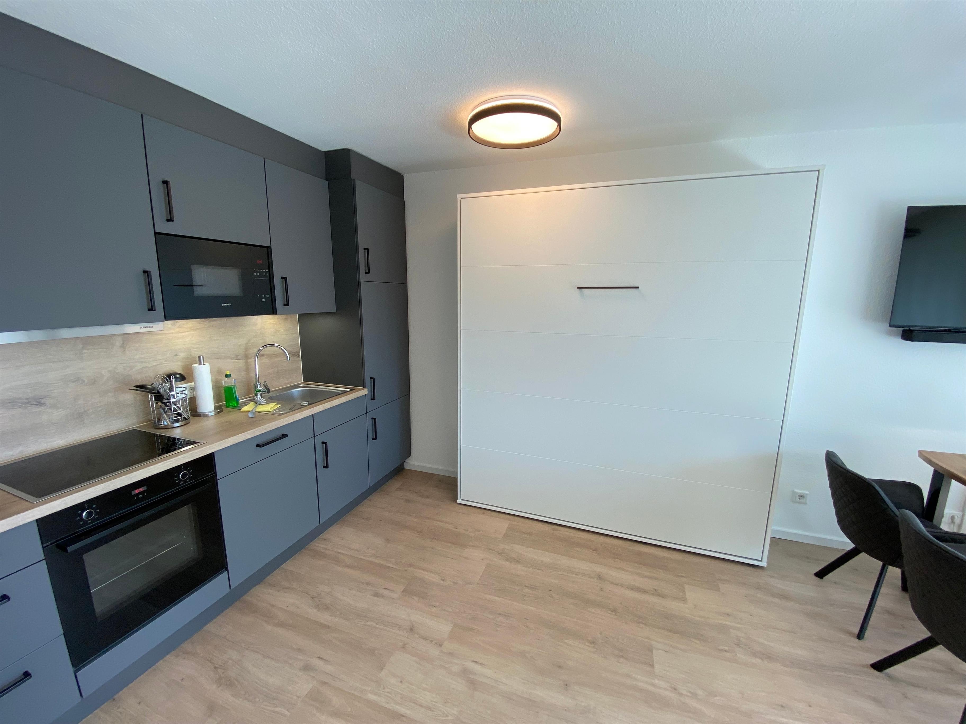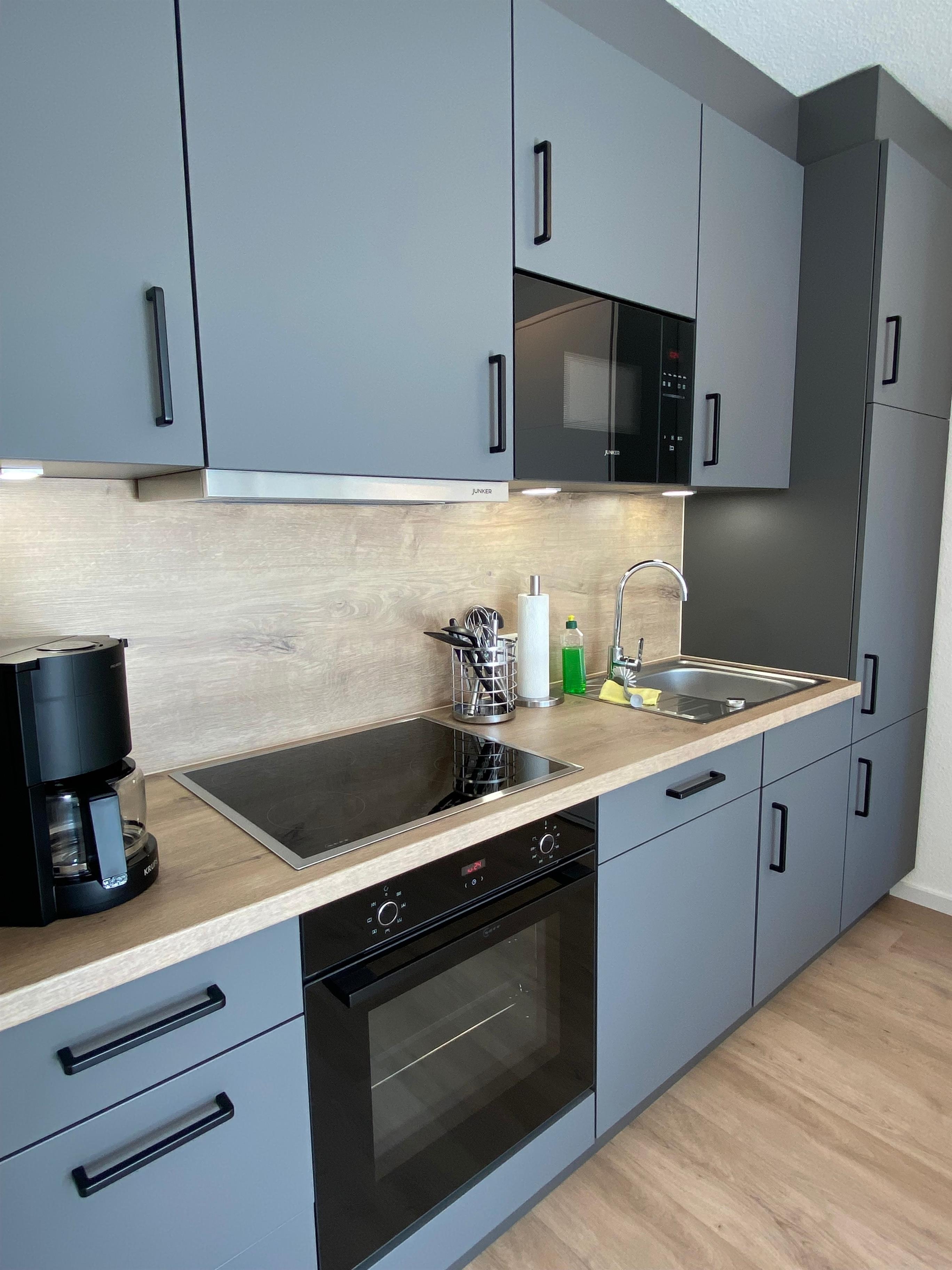 Die Einbauküchenzeile verfügt über ein Ceran-Kochfeld mit Backofen, eine Spülmaschine, einen Kühl- und Gefrierkombi, eine Mikrowelle, eine Kaffeemaschine, einen Toaster, einen Wasserkocher, ein Mixer und viele weiteren Extras.