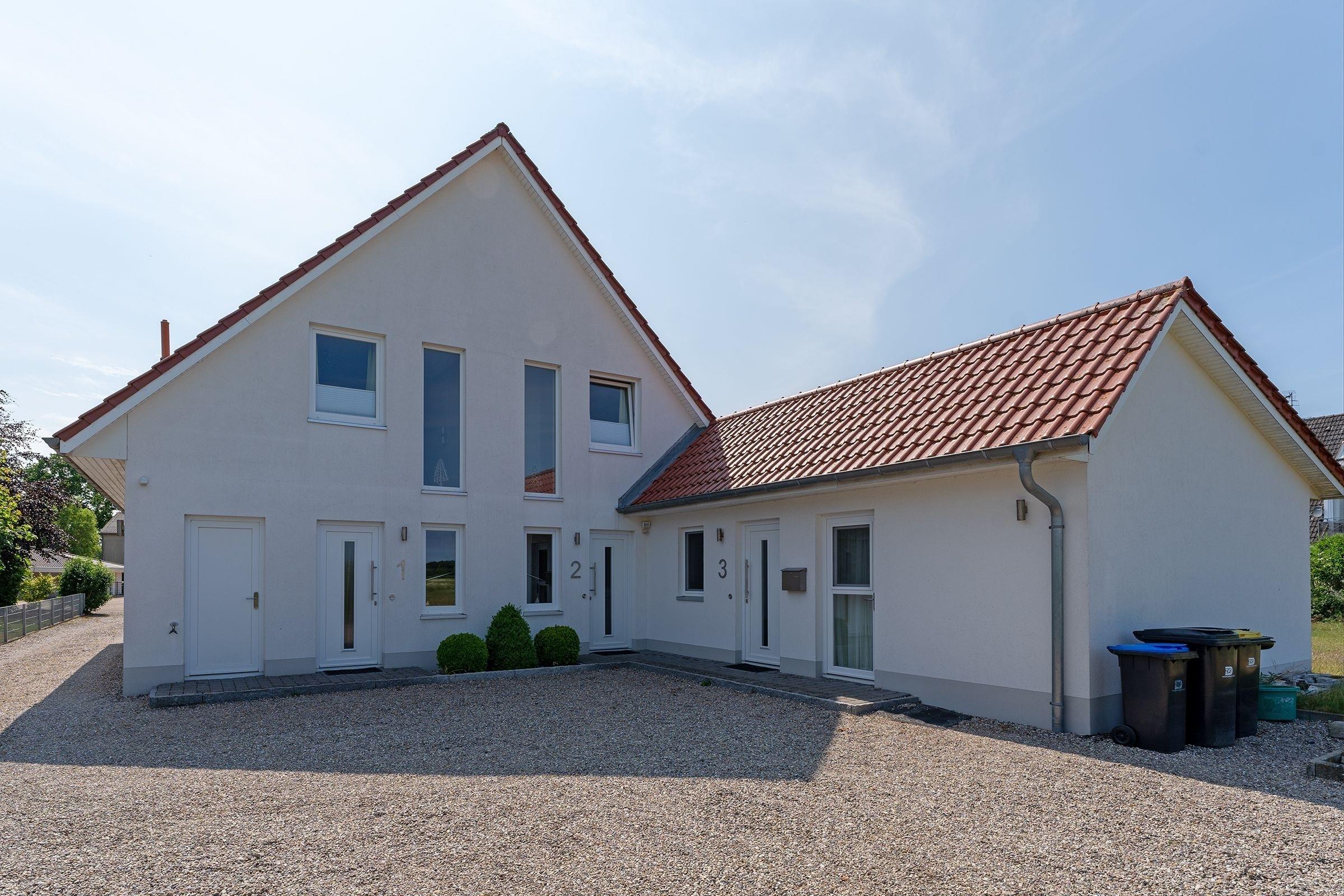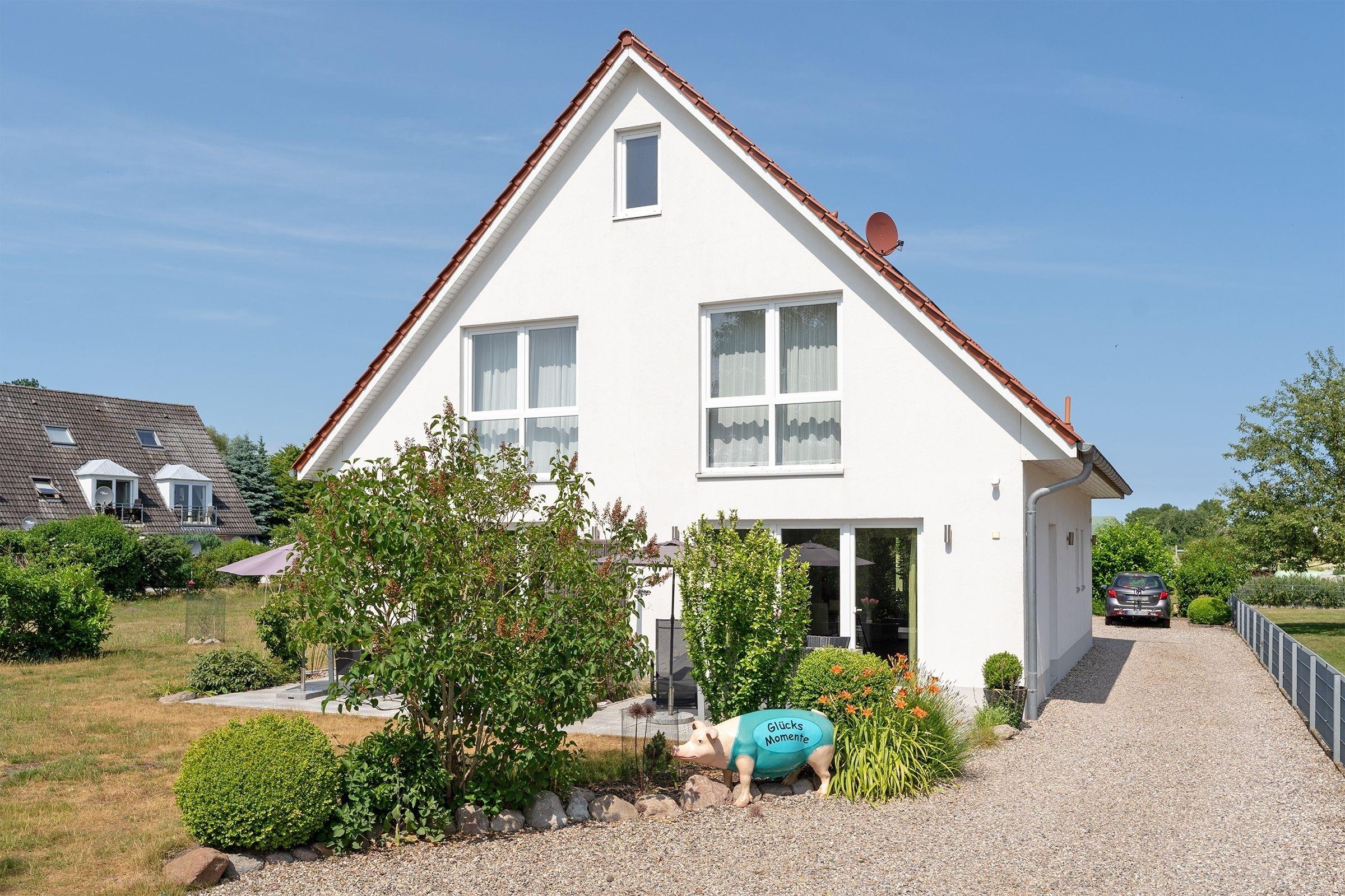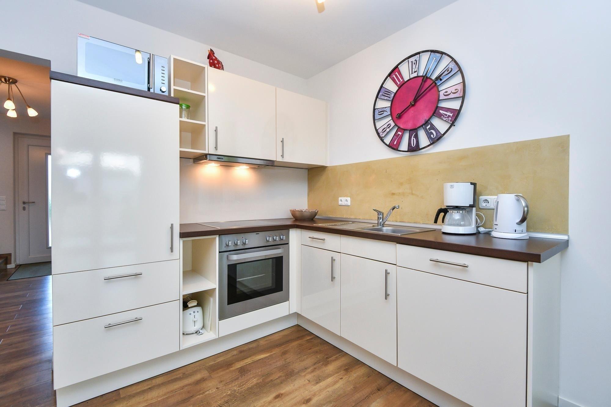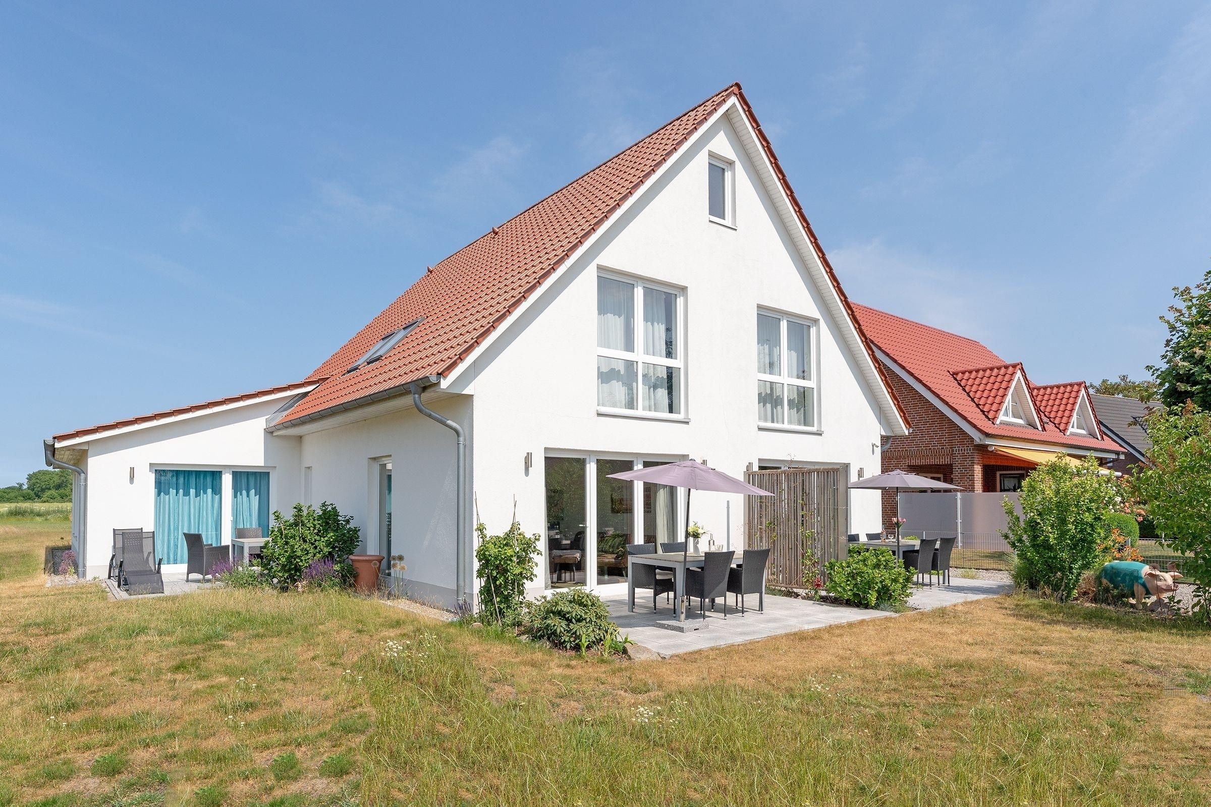 Ankommen und glücklich sein. Das Haus Glücksmomente, in dem sich die Doppelhaushälfte Jelena befindet, schenkt seinen Bewohnern eine Extra-Portion Glück für den Urlaub und lässt sicher keine Wünsche offen. Im hellen Wohnbereich im Erdgeschoss lädt Sie eine komfortable Sofa-Landschaft sowie ein Relaxsessel mit Hocker zum Träumen, Entspannen und Fernsehen ein. Direkt hier haben Sie auch Zugang auf die große möblierte Süd-Terrasse – das wird sicher Ihr Lieblingsplatz. Hier kann man auf der Liege herrlich die Sonne genießen oder auch im Gemeinschaftsgarten eine Runde Federball spielen. Abends sorgt ein Gemeinschaftsgrill für kulinarische Abwechslung. Zurück im Wohnbereich: Hier steht Ihnen eine stylische Ess-Ecke zu Verfügung. Wie wäre es hier mit lustigen Spiele-Abenden? In der offenen, hochwertigen Küche verbringen Hobby-Köche sicher gern ihre Zeit und testen neue Rezepte aus. Im Anschluss übernimmt ein Geschirrspüler den Abwasch. Ein modernes Gäste-WC mit Fenster finden Sie ebenfalls im Erdgeschoss. Das Obergeschoss verfügt über ein modernes Duschbad mit Dachfenster, Handtuchwärmer und Waschmaschine. Des Weiteren finden Sie hier 2 Schlafräume: ein Zimmer mit Doppelbett (2x 90x200 cm) und TV-Gerät und ein Zimmer mit 2 Einzelbetten (je 90x200 cm). Eine Fußbodenheizung im Wohnbereich und im Badezimmer sorgt für wohlige Wärme.