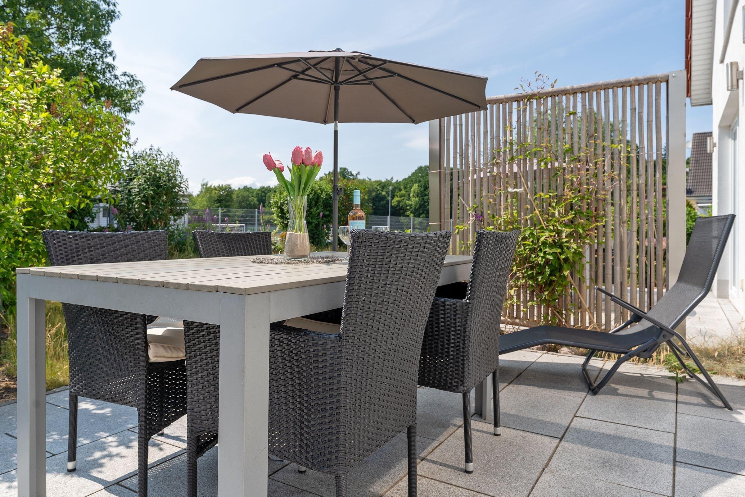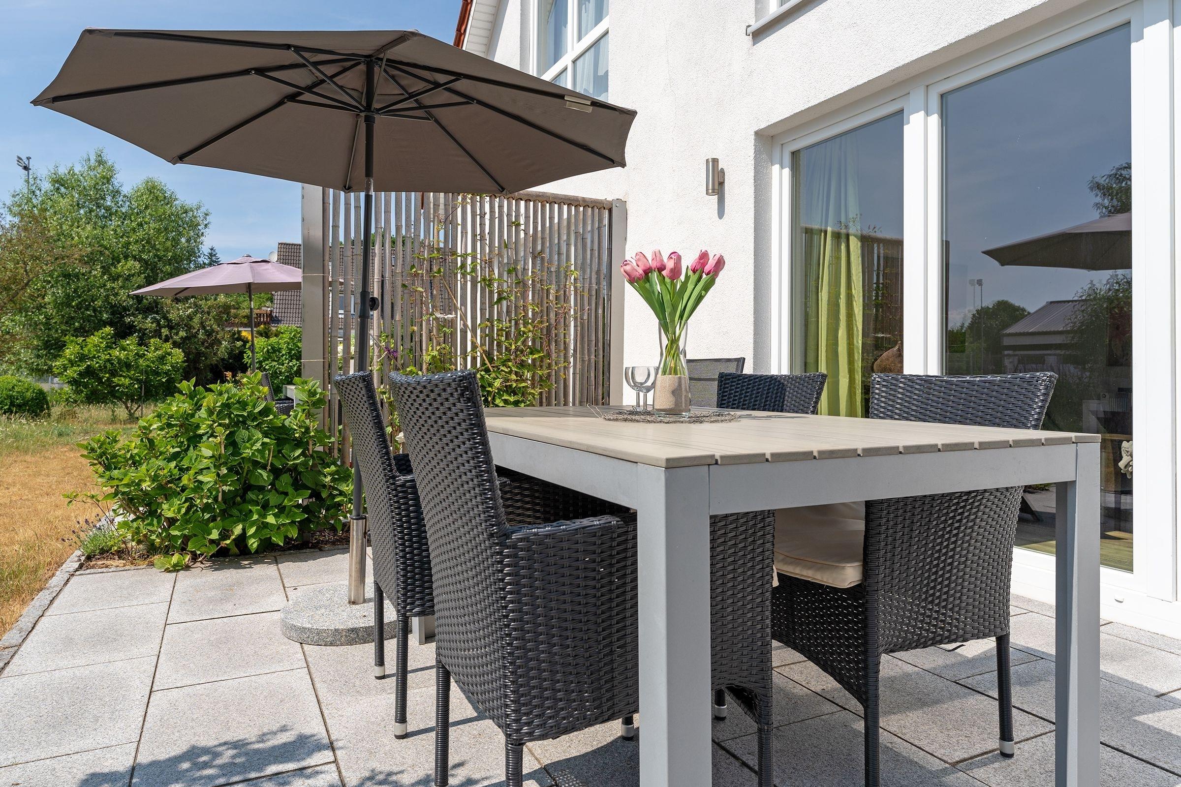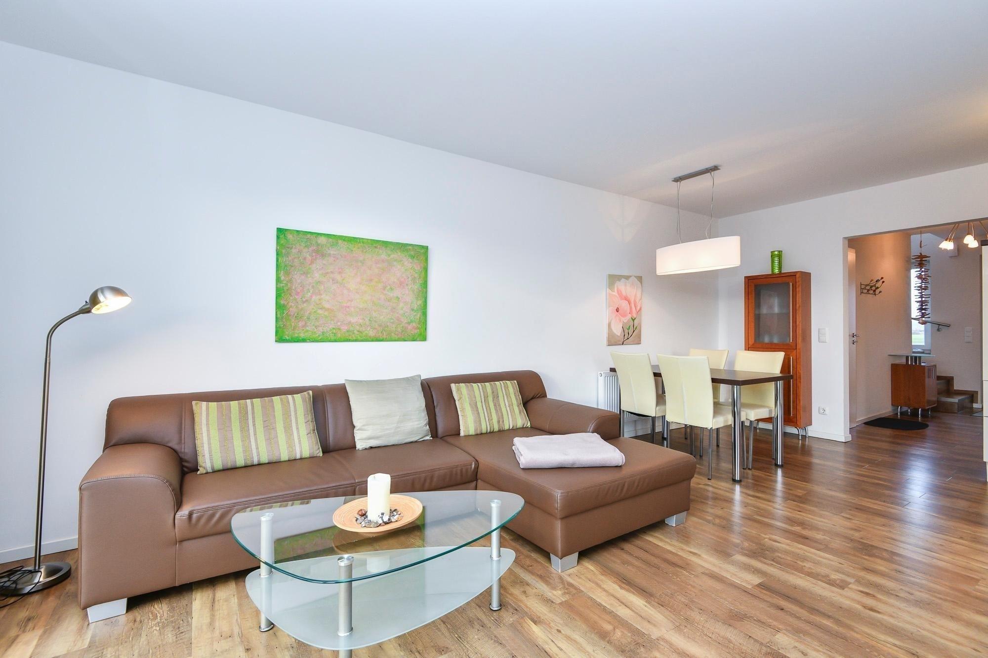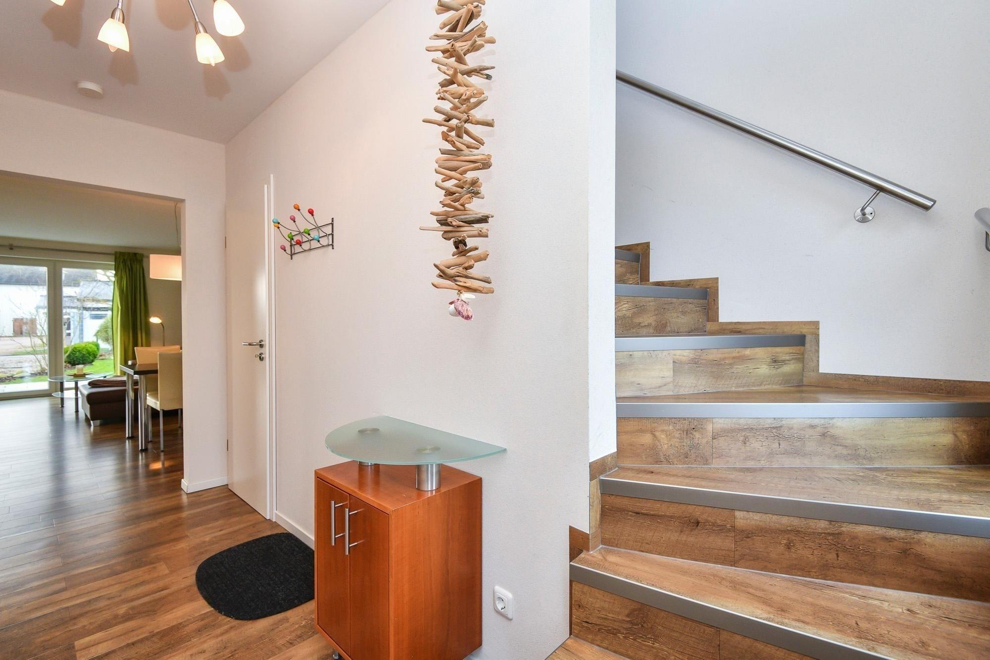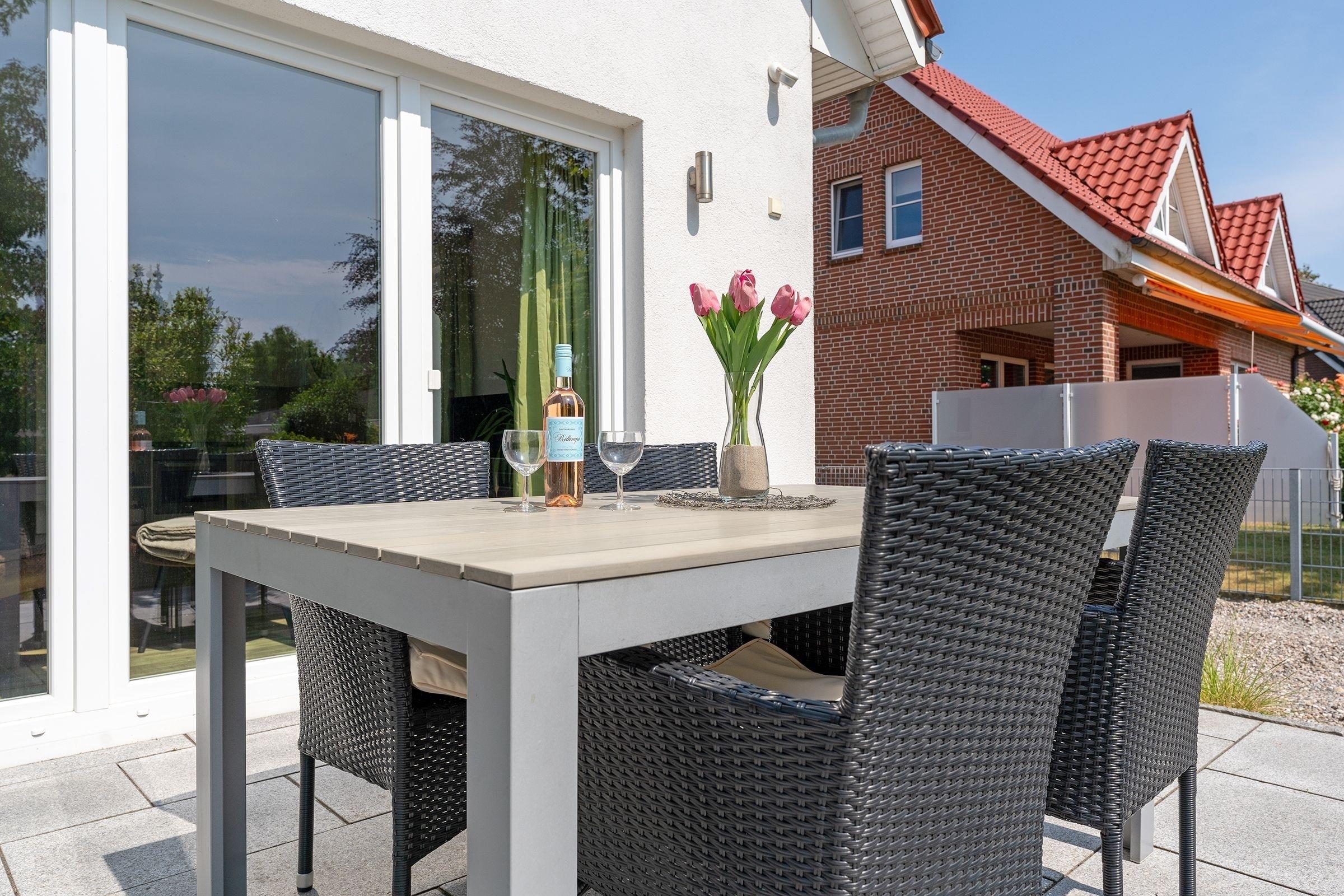 Ankommen und glücklich sein. Das Haus Glücksmomente, in dem sich die Doppelhaushälfte Jelena befindet, schenkt seinen Bewohnern eine Extra-Portion Glück für den Urlaub und lässt sicher keine Wünsche offen. Im hellen Wohnbereich im Erdgeschoss lädt Sie eine komfortable Sofa-Landschaft sowie ein Relaxsessel mit Hocker zum Träumen, Entspannen und Fernsehen ein. Direkt hier haben Sie auch Zugang auf die große möblierte Süd-Terrasse – das wird sicher Ihr Lieblingsplatz. Hier kann man auf der Liege herrlich die Sonne genießen oder auch im Gemeinschaftsgarten eine Runde Federball spielen. Abends sorgt ein Gemeinschaftsgrill für kulinarische Abwechslung. Zurück im Wohnbereich: Hier steht Ihnen eine stylische Ess-Ecke zu Verfügung. Wie wäre es hier mit lustigen Spiele-Abenden? In der offenen, hochwertigen Küche verbringen Hobby-Köche sicher gern ihre Zeit und testen neue Rezepte aus. Im Anschluss übernimmt ein Geschirrspüler den Abwasch. Ein modernes Gäste-WC mit Fenster finden Sie ebenfalls im Erdgeschoss. Das Obergeschoss verfügt über ein modernes Duschbad mit Dachfenster, Handtuchwärmer und Waschmaschine. Des Weiteren finden Sie hier 2 Schlafräume: ein Zimmer mit Doppelbett (2x 90x200 cm) und TV-Gerät und ein Zimmer mit 2 Einzelbetten (je 90x200 cm). Eine Fußbodenheizung im Wohnbereich und im Badezimmer sorgt für wohlige Wärme.