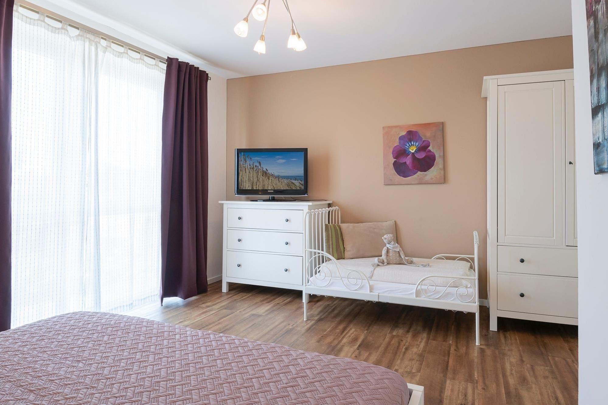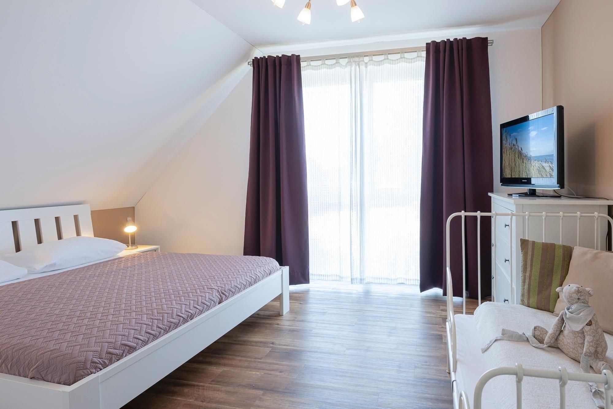 Schlafzimmer 1: im Dachgeschoss, 1 Doppelbett (2x 90x200 cm), TV, 1 Kinderbett (80x130 cm)