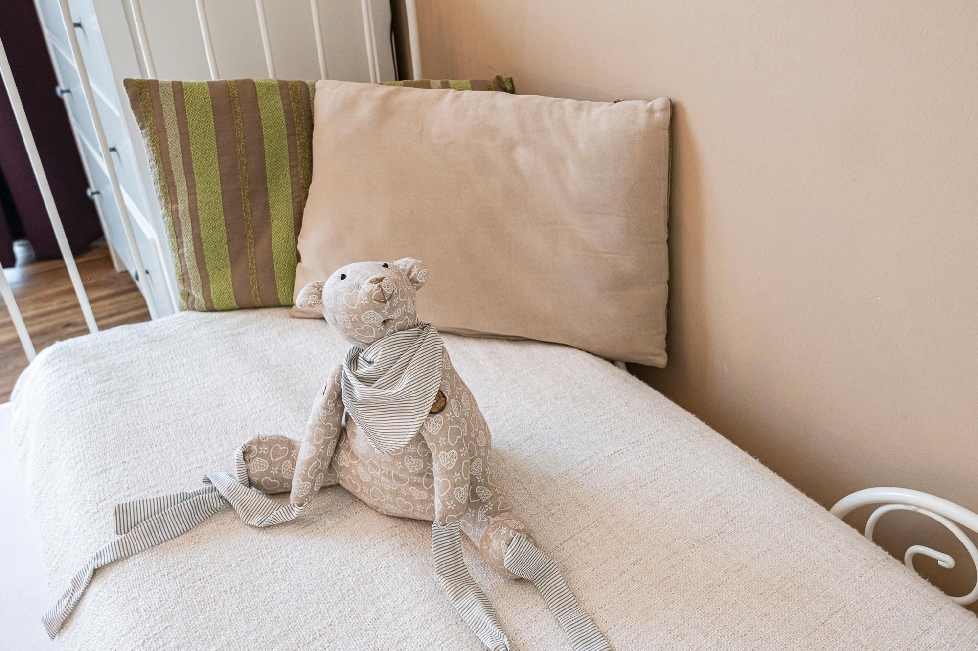 Ein Kinderbett für ein Kleinkind sowie ein Kinder-Reisebettchen und ein Hochstuhl runden das Angebot ab.