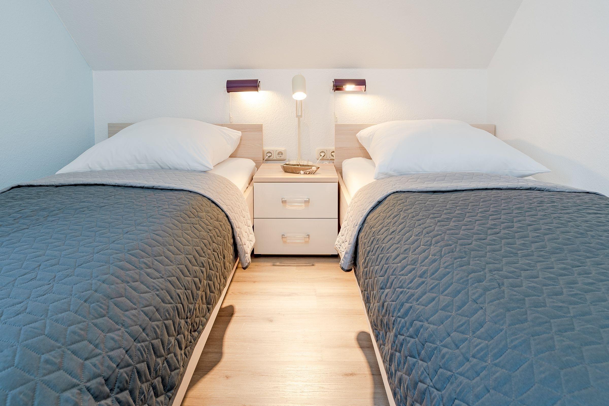 Schlafzimmer 2: 3 Einzelbetten (3x 90x200 cm), Kleiderschrank, Verdunkelung (Außenrollläden), Insektenschutz am Fenster.