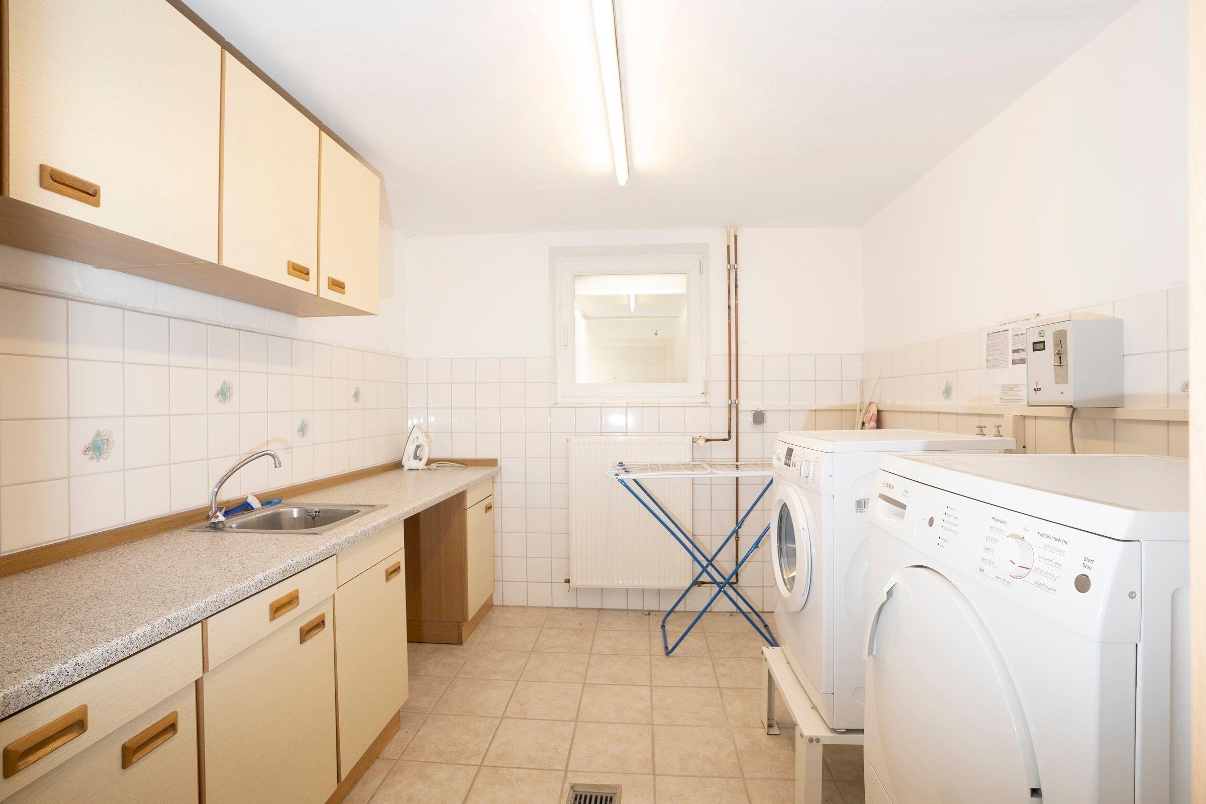 Auf dem Grundstück ist ein PKW-Außenstellplatz für Sie reserviert. Zur gemeinschaftlichen Nutzung befinden sich im Keller ein Fahrradraum sowie eine Waschmaschine mit Münz-Trockner.