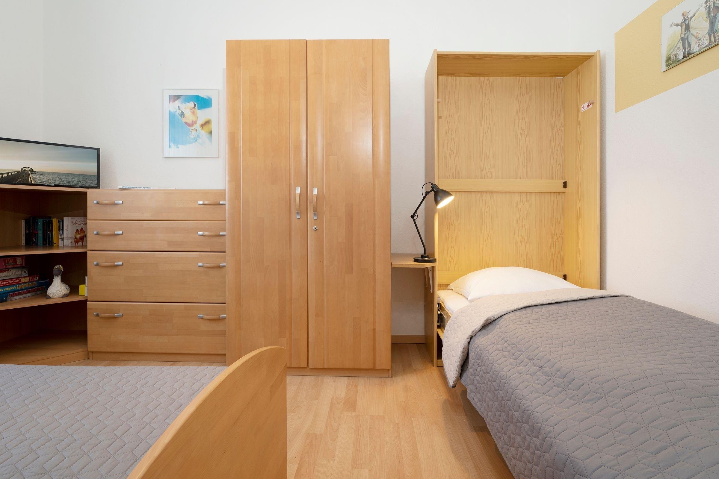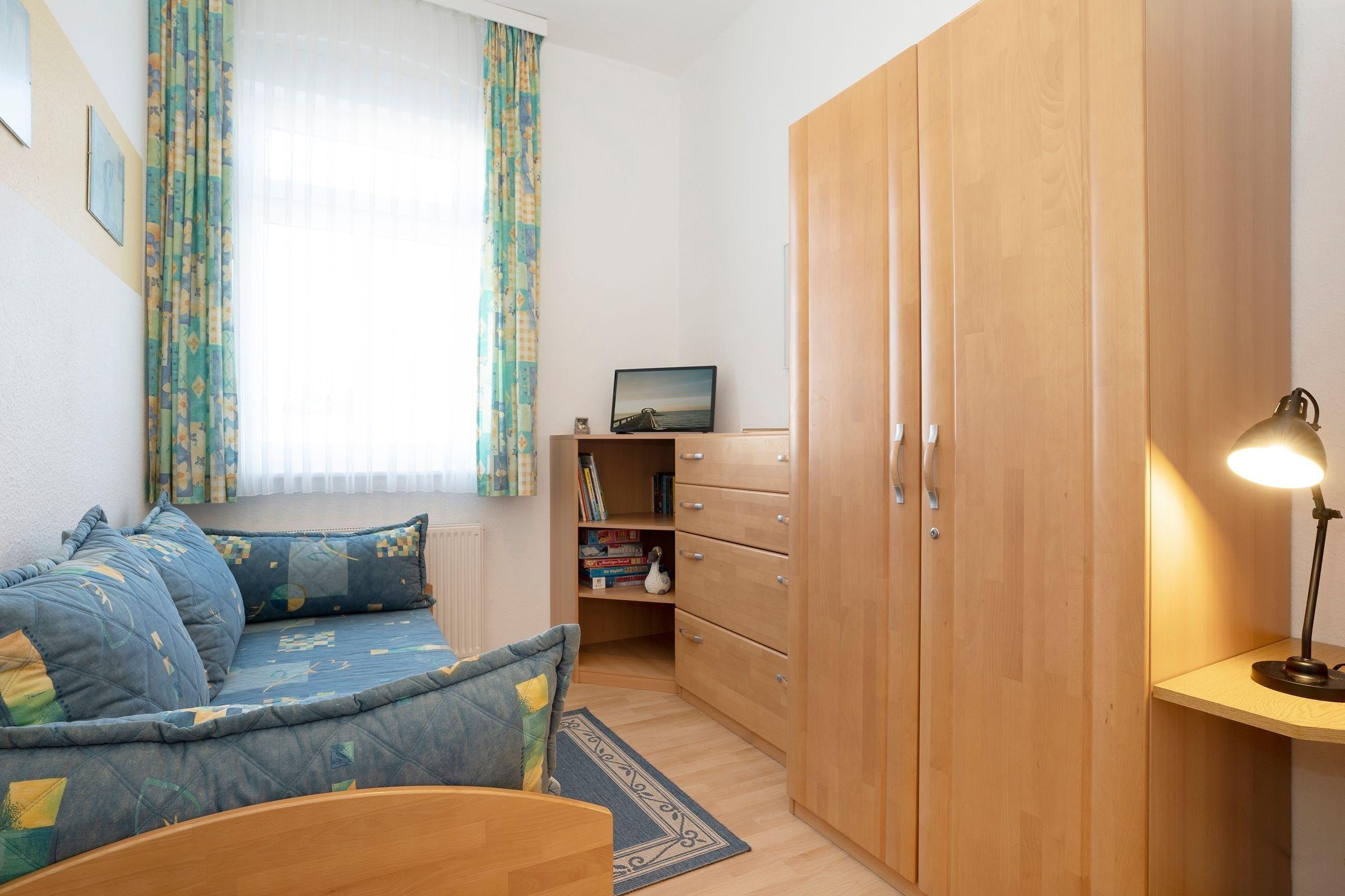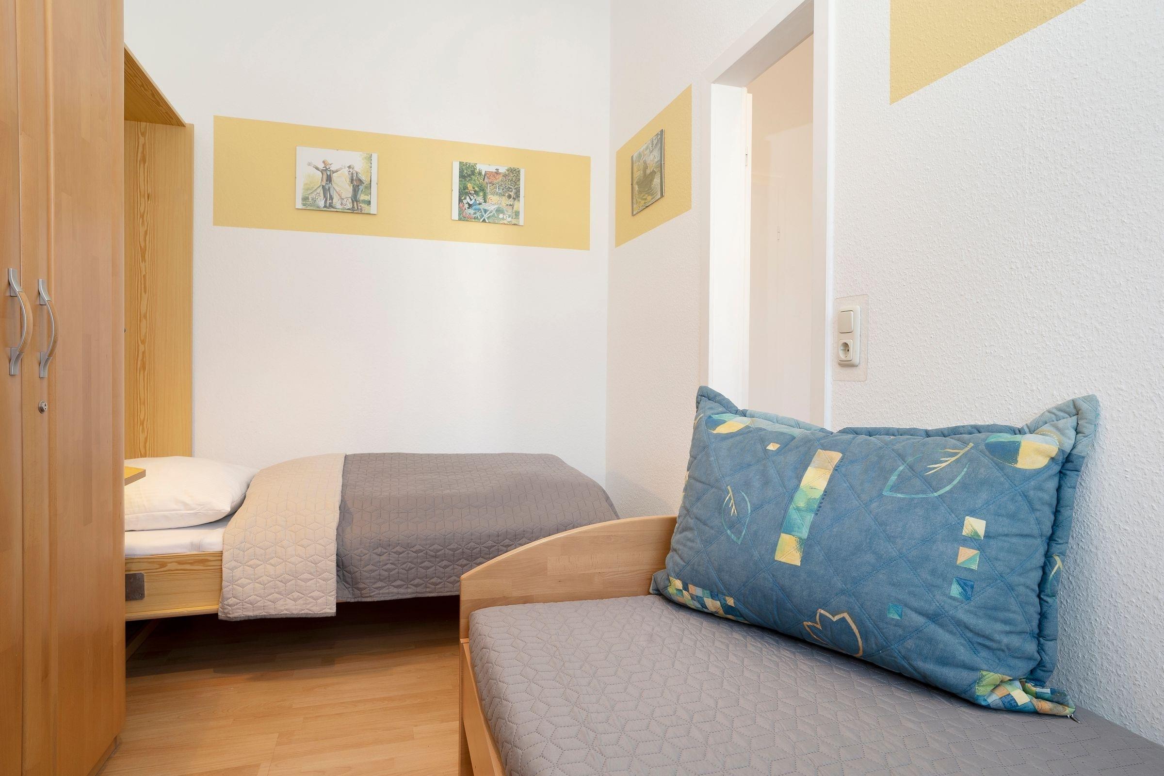 Schlafzimmer 2: 1 Einzelbett (ca. 90x190 cm), Kleiderschrank, Verdunkelung: Rollläden