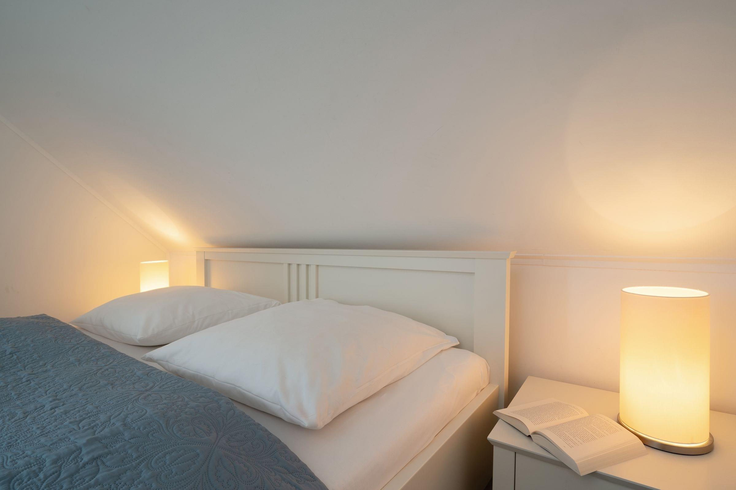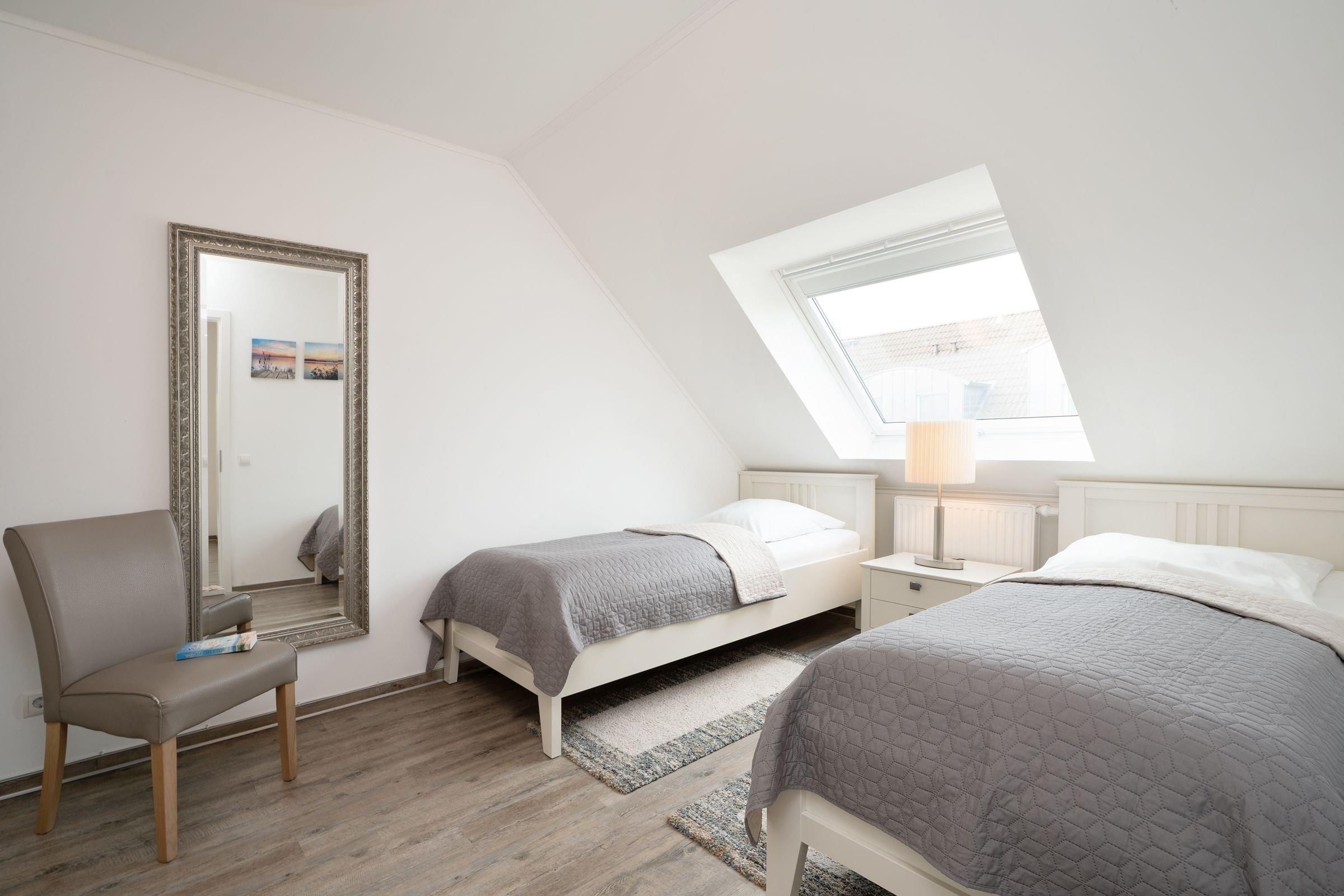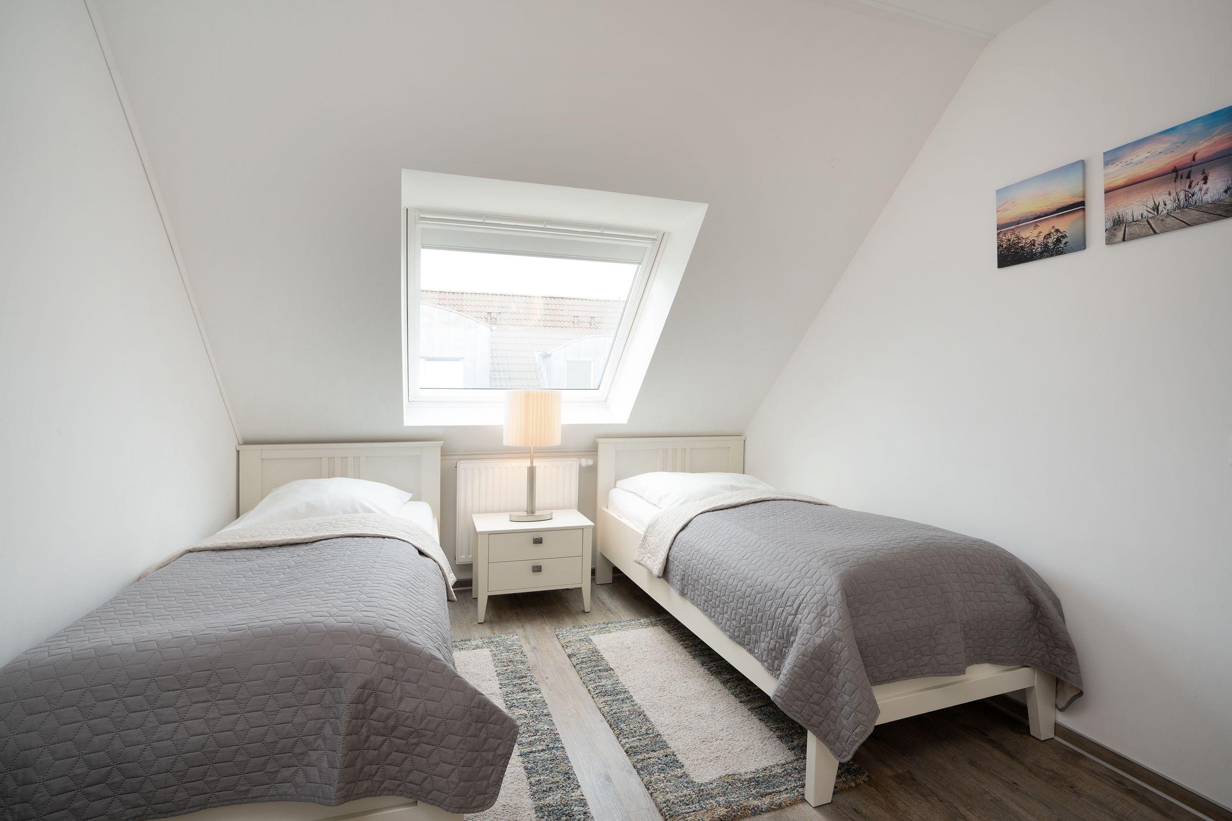Schlafzimmer 2: 2 Einzelbetten (2x 90x200 cm), Kleiderschrank, TV, Verdunkelung (Rollos)