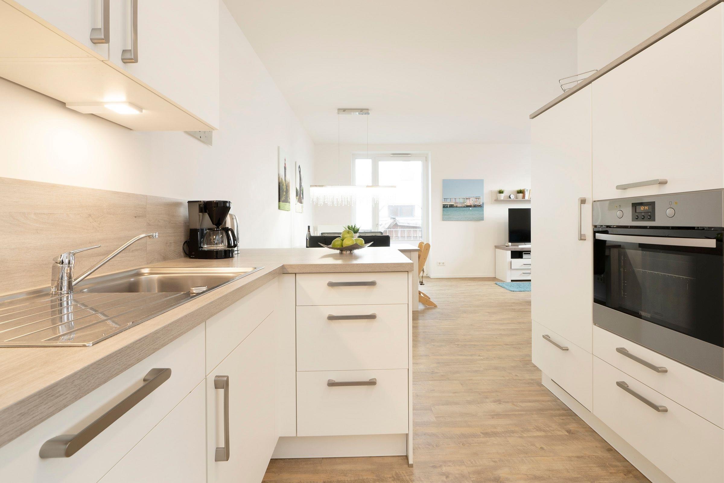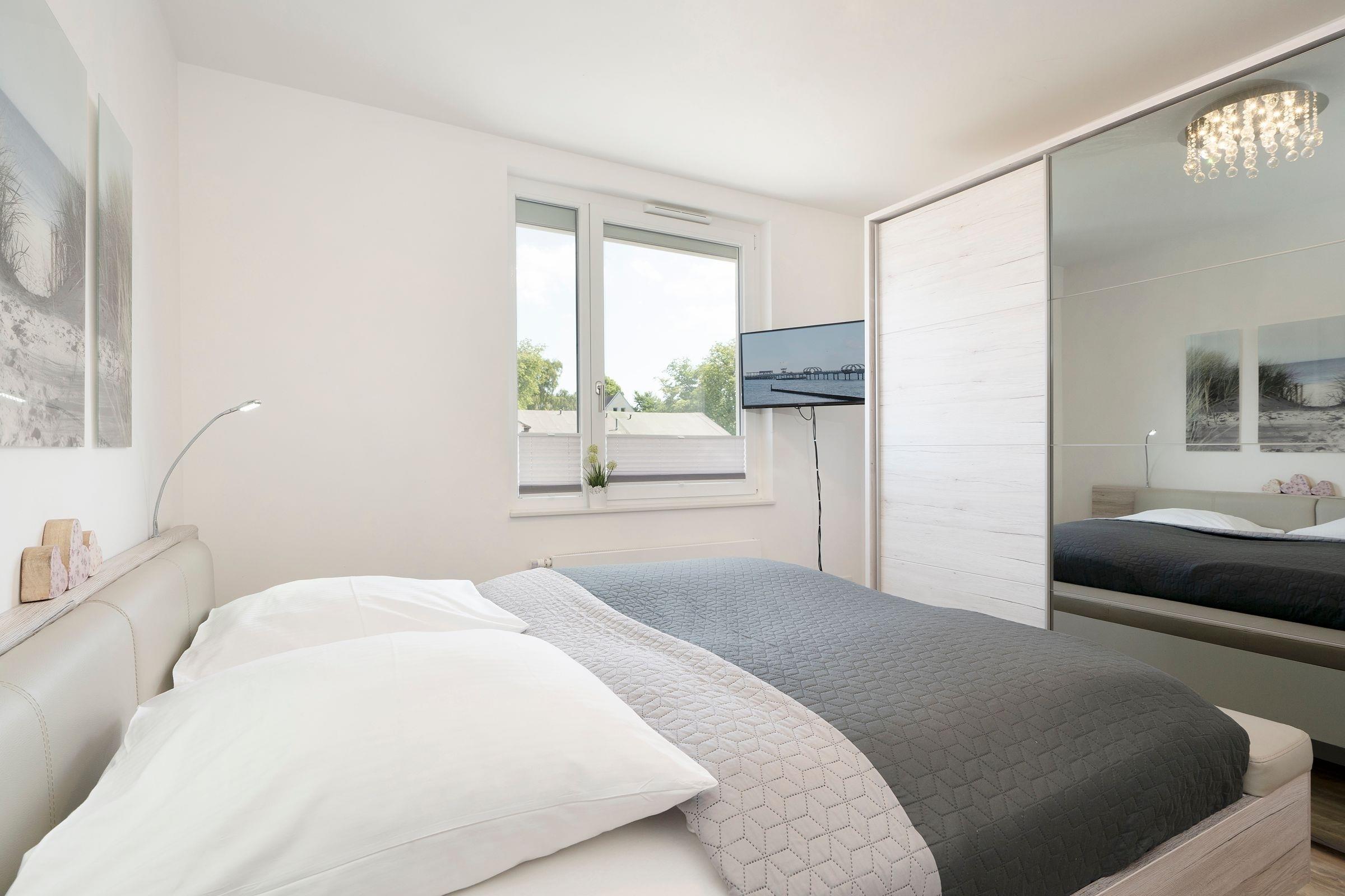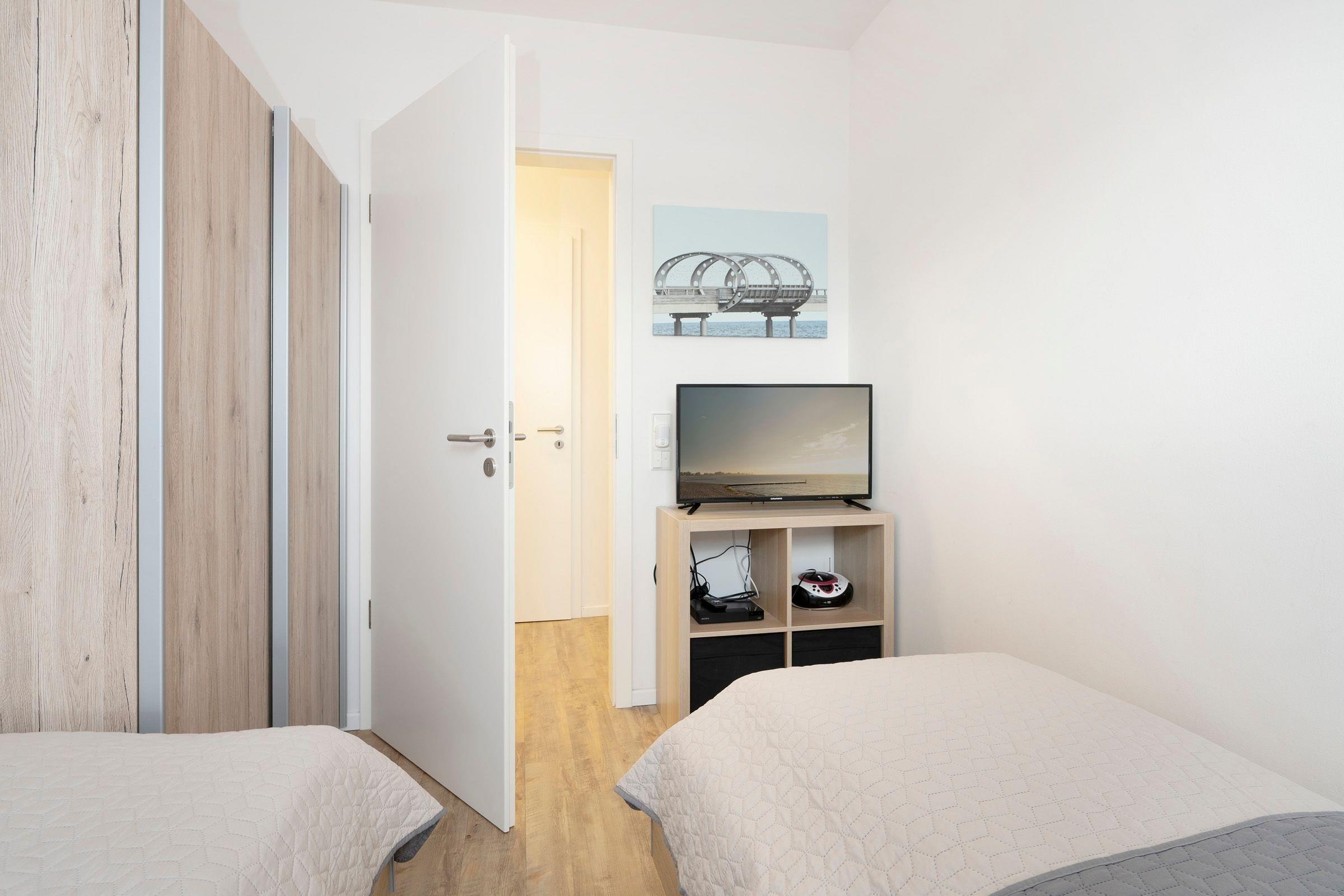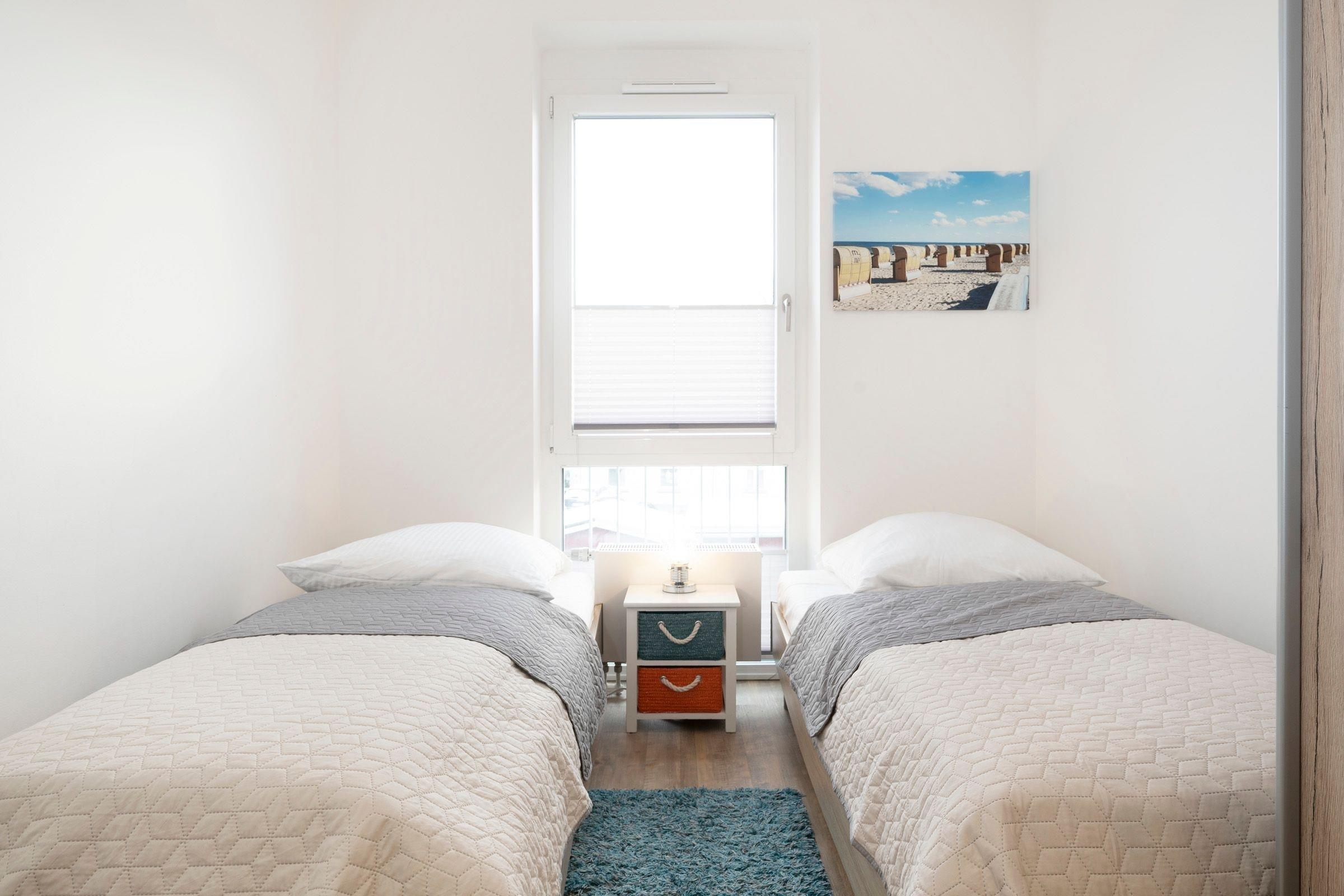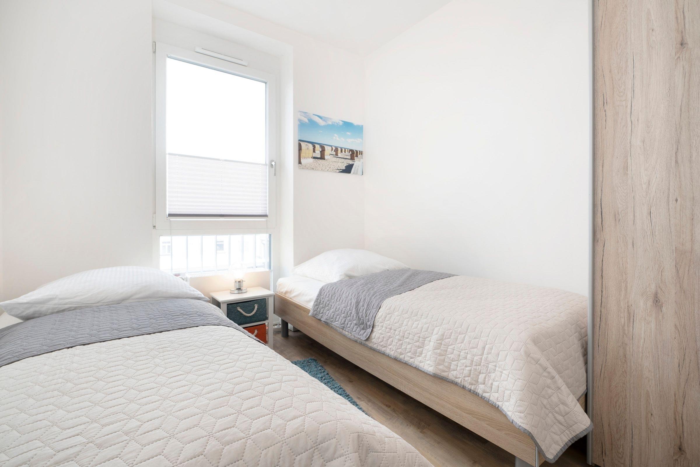 Herzlich Willkommen – in dieser maritim eingerichteten Wohnung fängt der Urlaub schon beim Reinkommen an. In der kuscheligen Sofa-Landschaft findet jeder seinen Platz und kann die Abende beim Fernsehschauen ausklingen lassen. Doch bevor es soweit ist, lockt der möblierte Balkon, der Richtung Ostsee zeigt. Hier können Sie herrlich sitzen und die Sonne genießen. Zurück im Wohn-/Essbereich wartet eine gemütliche Essecke auf Sie. Schlemmen Sie hier nach Herzenslust oder planen Sie hier Ihre Ausflüge entlang der Ostseeküste. In der Verlängerung des Tisches finden Sie die offen gestaltete Küche, die durch einen kleinen Tresen den Raum teilt und so eine angenehme Atmosphäre schafft. Die gute Ausstattung der Küche mit Espressomaschine und Geschirrspüler kann sich sehen lassen. Für die Nacht stehen Ihnen zwei Schlafräume zur Verfügung: In dem einen Zimmer befindet sich ein Doppelbett (2x 90x200 cm), in dem anderem sind zwei Einzelbetten (je 90x200 cm). Beide Schlafzimmer verfügen über ein TV-Gerät. Das Duschbad mit Tageslicht und einer Waschmaschine mit integriertem Trockner verspricht einen guten Start in den Tag. Optimal ist auch der Personenaufzug im Hause.