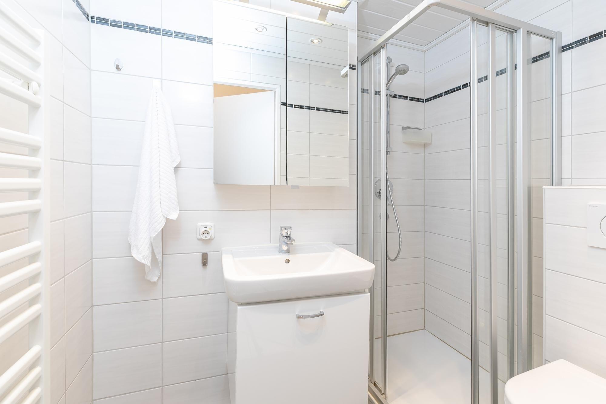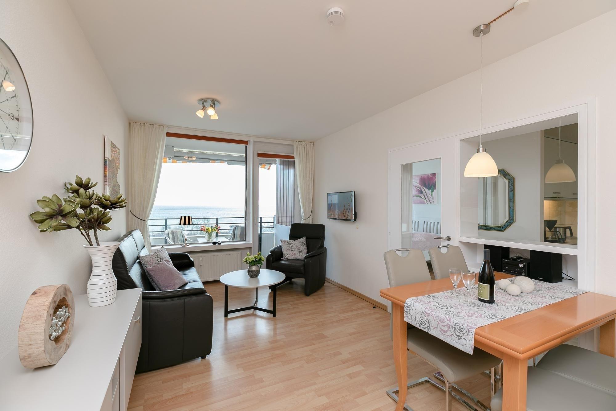Der lichtdurchflutete Wohn-/Schlafbereich begeistert mit bequemer Couchecke, internetfähigem Smart-TV, Essplatz für 4 Personen sowie direktem Balkonzugang und herrlichem Meerblick. Zwei hochwertige Schrankbetten (je 90 x 200 cm) liegen im hinteren Teil des offenen Wohnbereichs, gemütlich in einer Nische. Tagsüber ist somit reichlich Platz im Wohnzimmer und am Abend genießt man den traumhaften Ausblick vom Bett aus auf die funkelnde Ostsee. Die kleine, aber feine Küche ist separat, mit einer gläsernen Trennwand aber optisch mit dem Wohnraum verbunden – hier kocht man also nicht allein. Tolle Alltagshelfer wie Ceranherd, Backofen, Mikrowelle und Spülmaschine dürfen natürlich nicht fehlen. Im Spiegelschrank findet Ihre Urlaubsgarderobe Platz und die Ostsee leuchtet durch das Fenster. Im separaten Schlafzimmer mit Doppelbett (2x 90x200 cm) können Sie sich nach einem schönen Urlaubstag erholen. Das moderne Bad ist hell und geschmackvoll mit Eckdusche, beleuchtetem Spiegel, Waschbecken und WC ausgestattet.