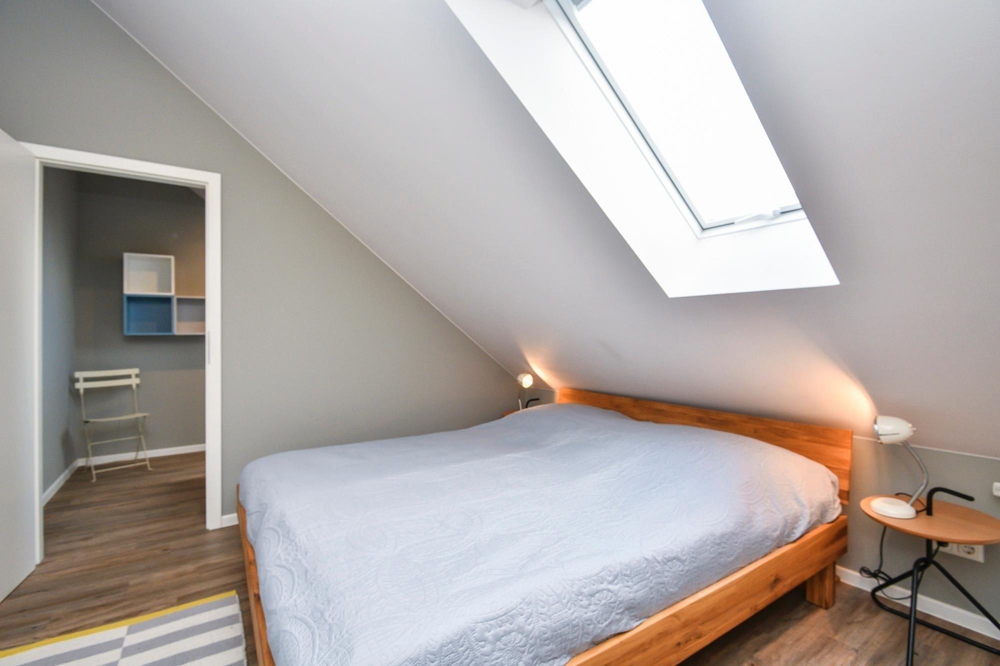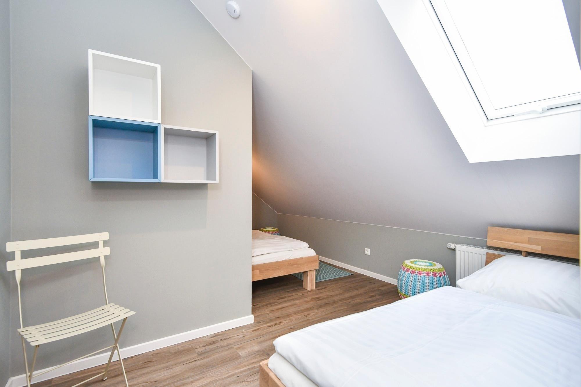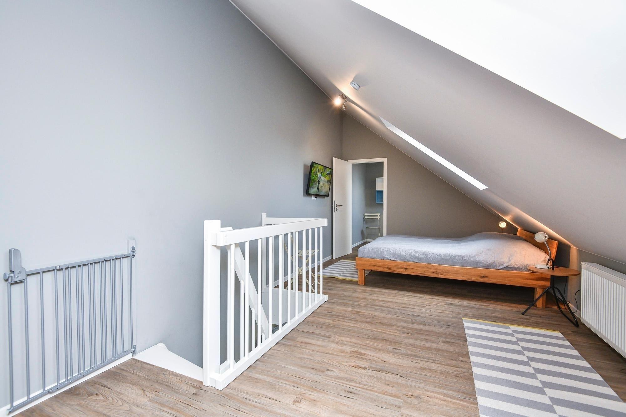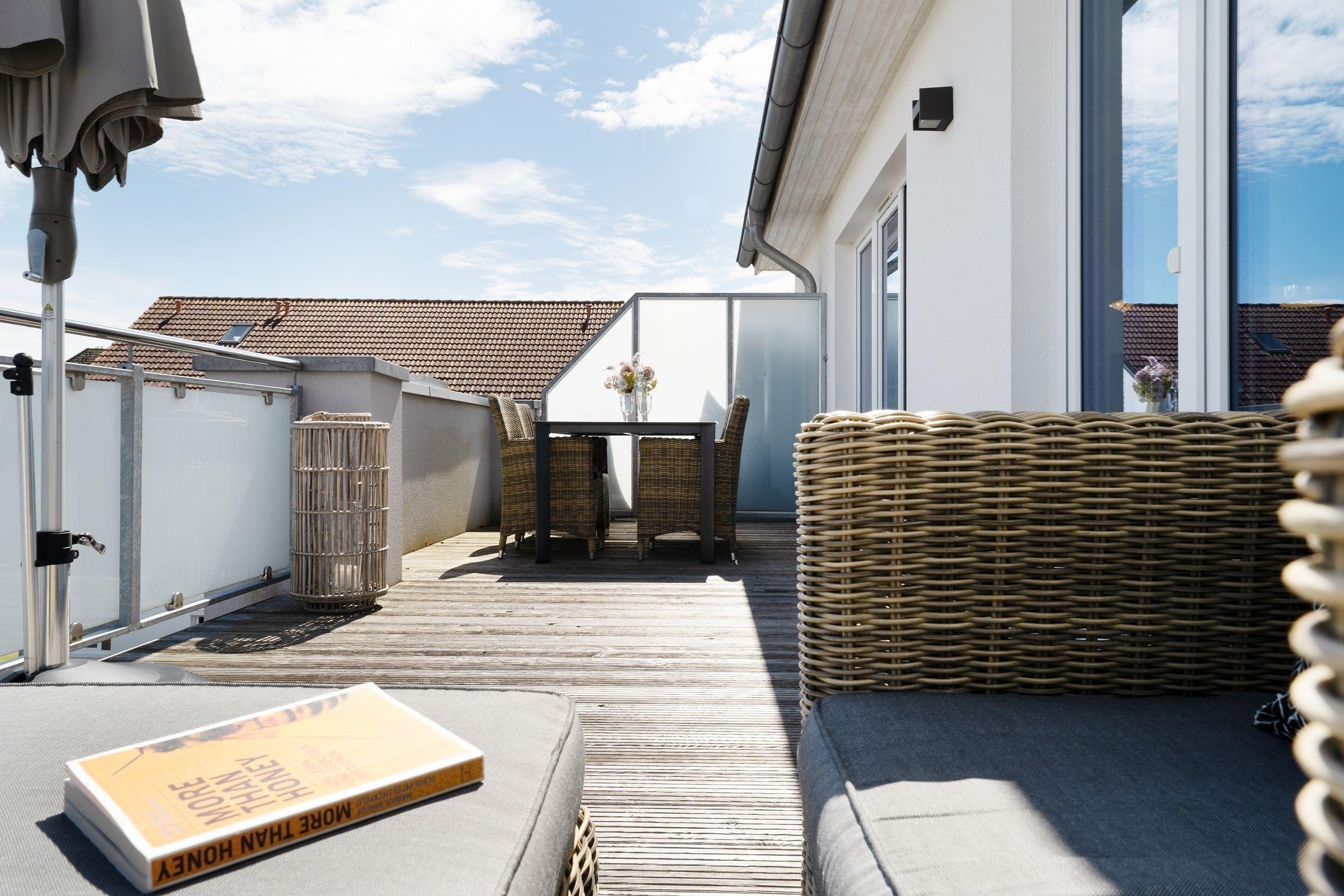 Das großzügige Wohlfühlbad ist mit einer Dusche mit tiefem Einstieg, großem Spiegel, einem Waschtrockner und praktischer Handtuchheizung ausgestattet. Vom Wohnzimmer führt ein direkter Zugang auf den 40 m² umfassenden Außenbereich mit saisonalem Teilmeerblick. Der Balkon erstreckt sich über eine Länge von 15m und bietet neben einem Outdoor-Essplatz zusätzlich eine großzügige Lounge-Ecke. Über eine steile Raumspartreppe inklusive Treppengitter und Kindersicherung erreichen Sie vom Wohnbereich die beiden Schlafzimmer im Spitzboden. Hier schläft es sich wunderbar unter gemütlichen Dachschrägen. Im offen gestalteten Galeriebereich befindet sich ein bequemes Doppelbett (180x200 cm), Kleiderschrank und TV. Direkt nebenan liegt das zweite Schlafzimmer, welches mit 2 Einzelbetten (je 90x190 cm), Leselampen und Wandregal möbliert ist. Plissees an allen Dachfenstern sorgen für angenehme Verdunklung für die Nacht.