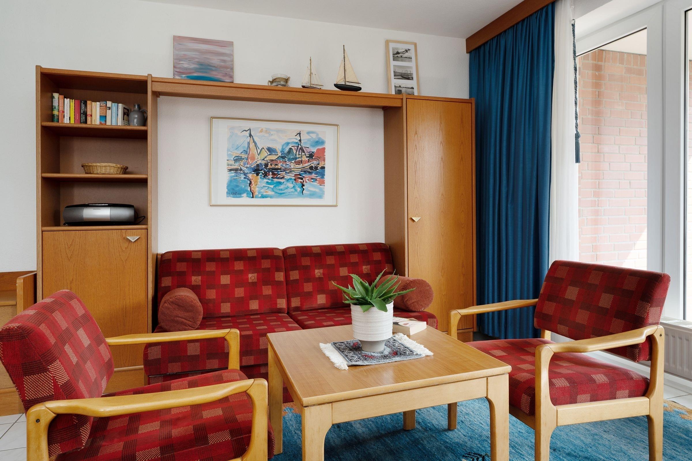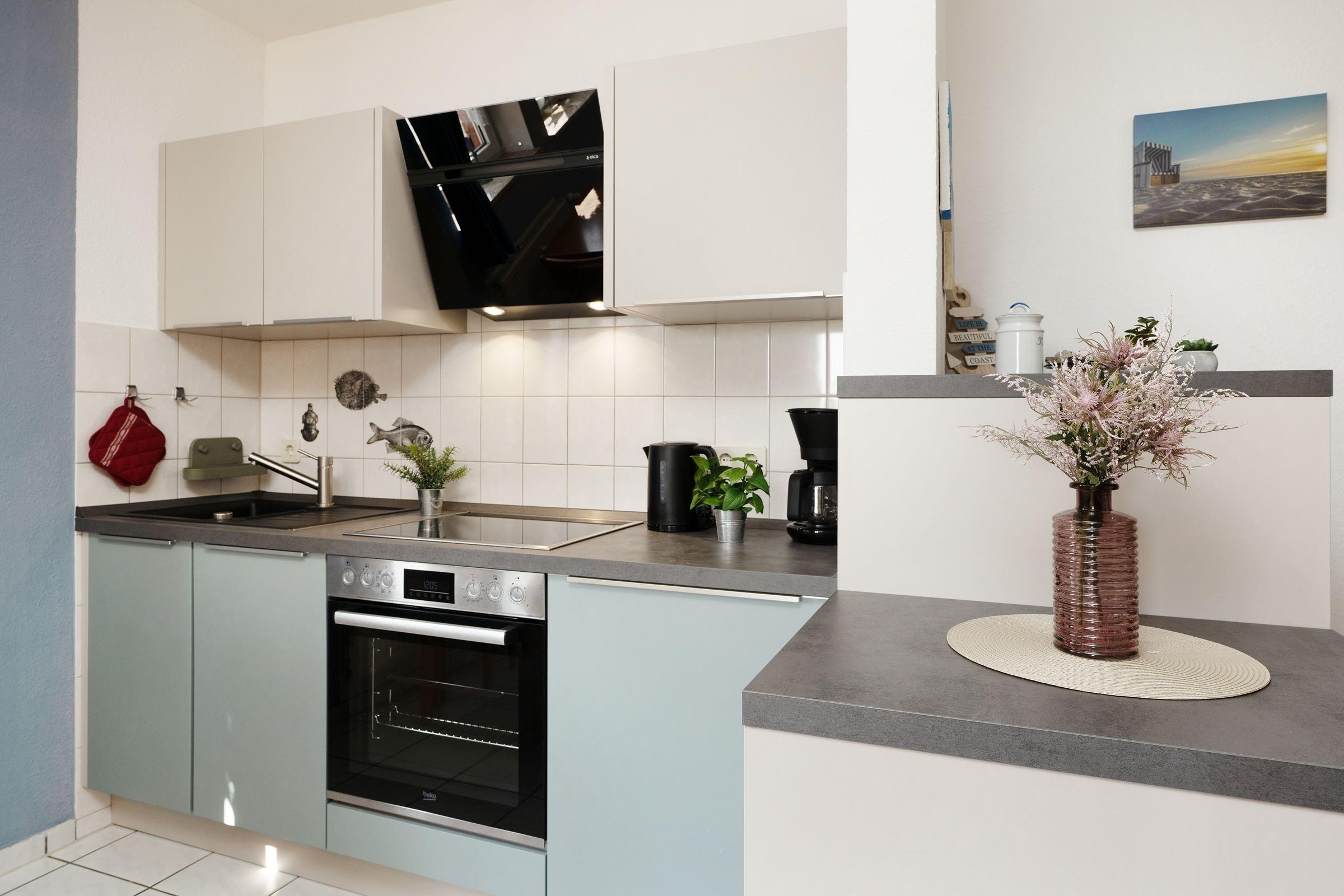 Herzlich willkommen in Ihrem wohlverdienten Urlaub. Die charmante Ferienwohnung Ostsee-Koje im gepflegten Ferien-Wohnpark Kaiserhof erwartet Sie schon. Das Besondere: Sie ist nur rund 100 Meter vom Strand entfernt. Die schönen Farbakzente in der geschmackvollen Einrichtung sorgen für gute Laune. Nehmen Sie Platz auf dem bequemen Sofa oder den beiden Sesseln. Hier können Sie wunderbar vor dem TV-Gerät entspannen. Direkt daneben betreten Sie die möblierte Terrasse – genießen Sie hier die Sonne gemütlich und geschützt. Vielleicht wird das Ihr neuer Lieblingsplatz? Die gut ausgestattete Küche ist zum Wohnraum hin offen – probieren Sie hier gemeinsam neue Rezepte aus der Region aus und genießen Sie diese in der schicken Ess-Ecke. Für die Nachtruhe haben Sie 2 Schlafplätze zur Auswahl: Das Sofa im Wohnzimmer lässt sich mit wenigen Handgriffen in ein komfortables Doppelbett (ca. 160x200 cm) umwandeln. Zudem steht im großzügigen Schlafzimmer ein schönes Doppelbett (2x 90x200 cm) für Sie bereit. Das hell geflieste Duschbad mit Fenster verspricht einen guten Start in den Tag.