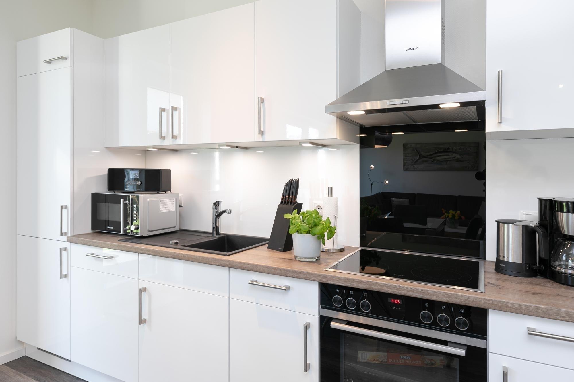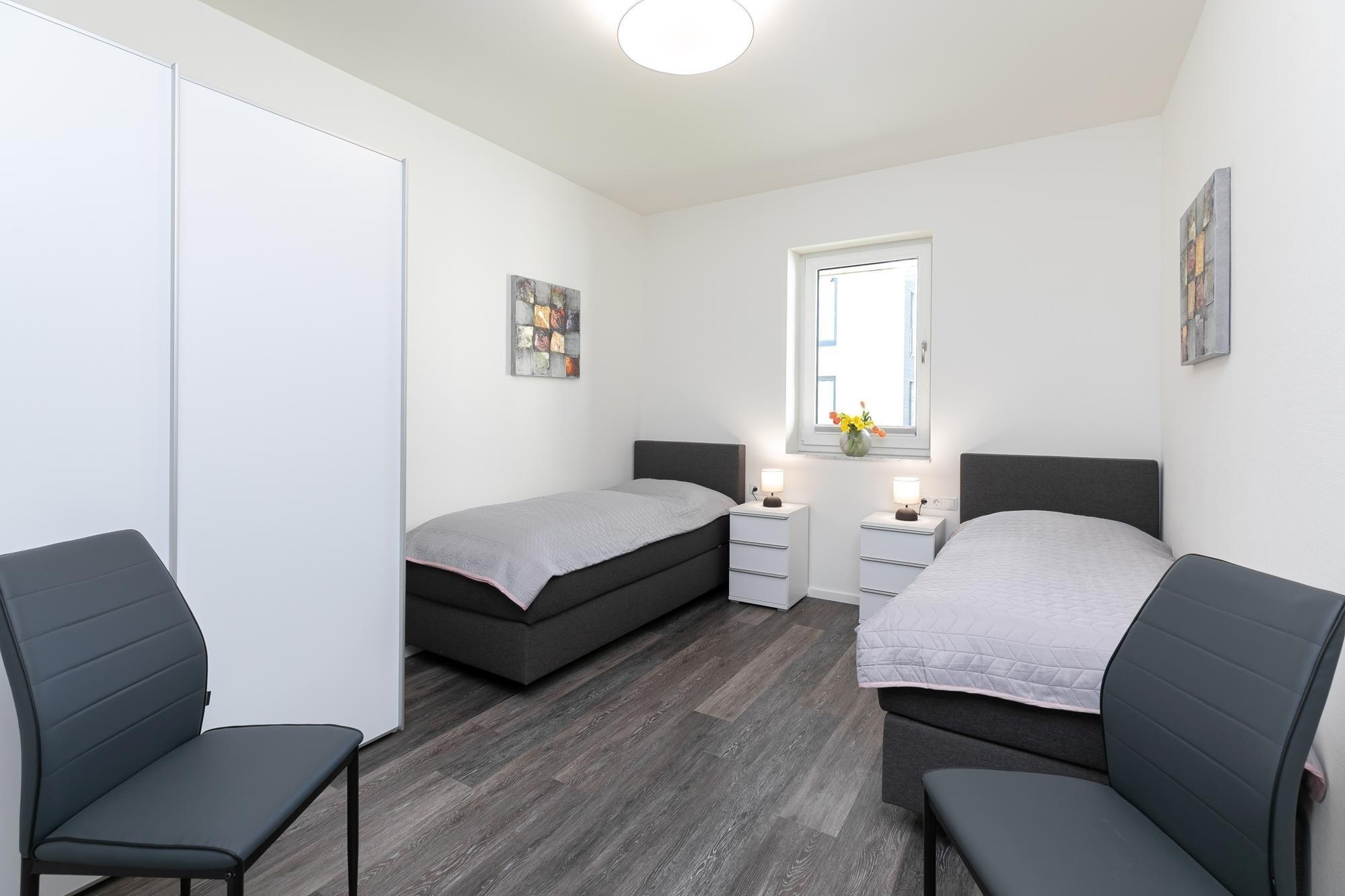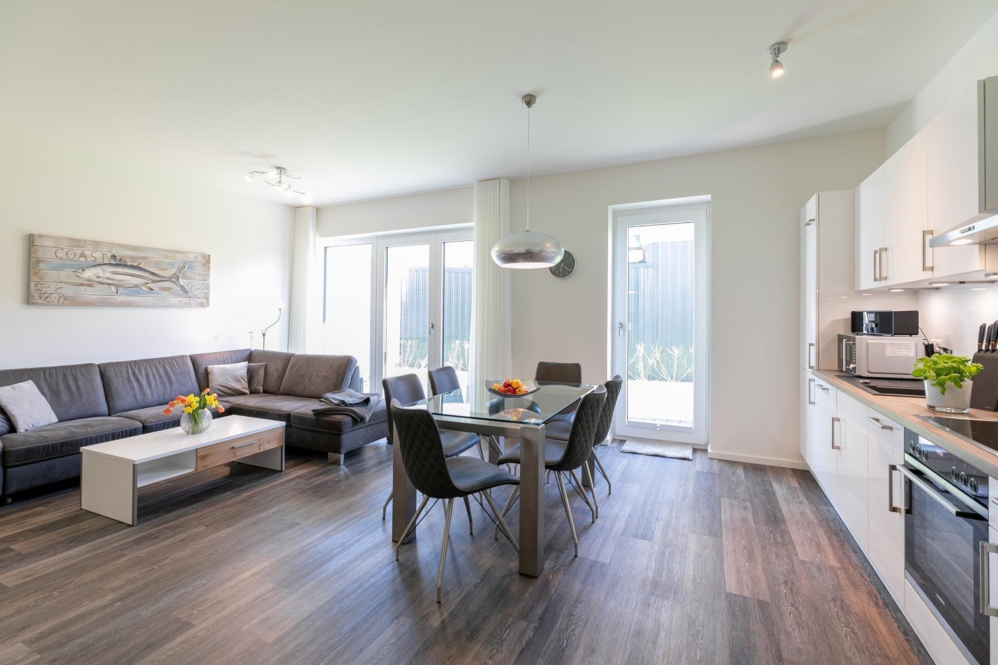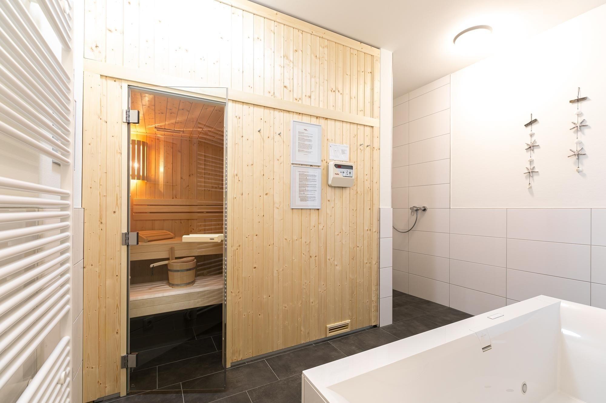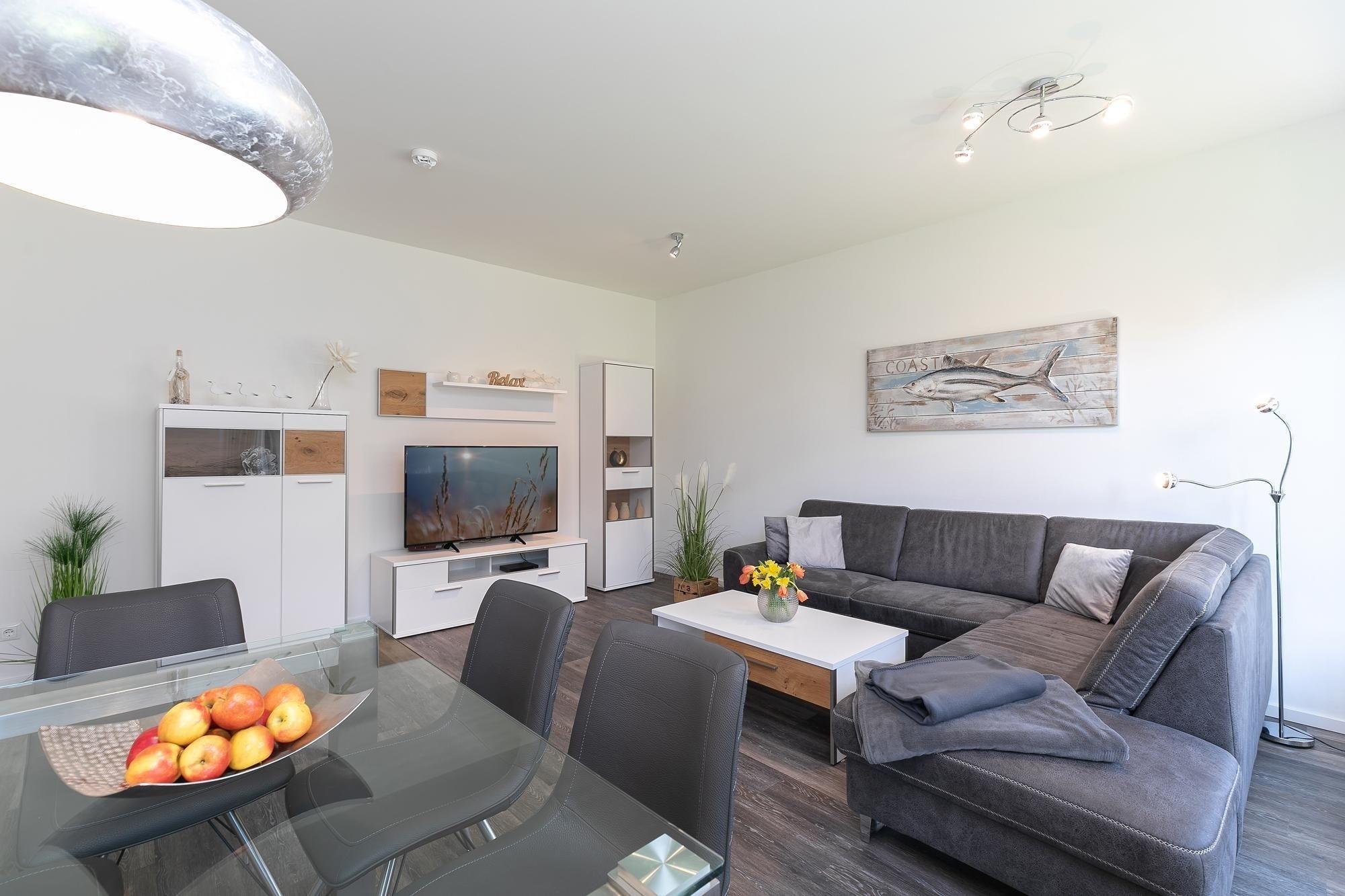 Ein perfekter Ort zum Erholen und Entspannen – die Ferienwohnung begrüßt Sie mit einer modernen Sofa-Landschaft mit TV-Gerät und einer schicken Ess-Ecke, die gleichzeitig als origineller Raumteiler fungiert. Die Küche mit Geschirrspüler ist offen gestaltet und gut ausgestattet, sodass Sie Ihre Lieblings-Gerichte auch im Urlaub wunderbar zubereiten können. Zum Speisen eignet sich natürlich gut die möblierte Terrasse. Hier können Sie gemütlich zusammensitzen und den Abend bei einem Glas Wein und guten Gesprächen ausklingen lassen. Für die Nacht stehen 2 Schlafräume bereit: Ein Zimmer verfügt über ein Boxspringbett (180x200 cm), das zweite über 2 Einzel-Boxspringbetten (je 90x200 cm). In beiden Schlafzimmern steht jeweils ein TV-Gerät. Das komfortable Badezimmer bietet Ihnen mit Sauna und Whirlwanne eine kleine eigene Wellness-Oase. Genießen Sie hier Ihre Auszeit vom Alltag. Zusätzlich verfügt die Wohnung über ein Gäste-WC und einen kleinen Abstellraum mit Waschmaschine. Ein bequemes Plus ist der Personenaufzug im Hause.