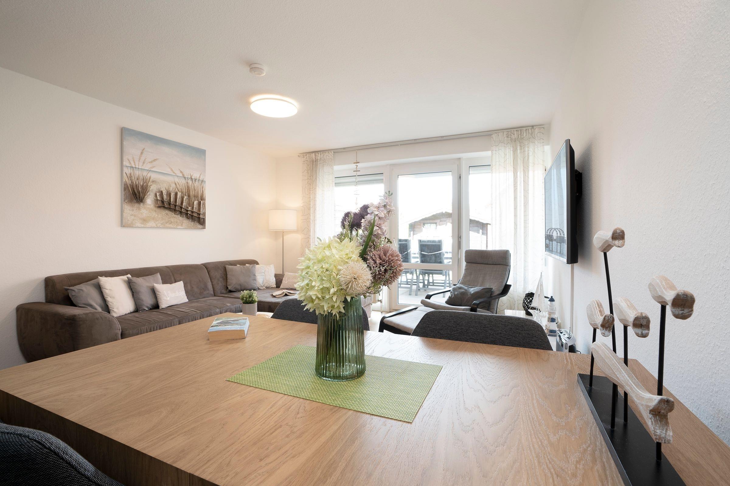 Das Besondere für die ganze Familie. Auf 2 Etagen bietet Ihnen dieses Reihenendhaus im Ferien-Wohnpark Amselweg viel Platz und Komfort. Im Erdgeschoss erwartet Sie ein geräumiger Wohn- und Essbereich mit einem bequemen Ecksofa, einem Sessel und einem großen Flachbildfernseher. Von hier aus gelangen Sie auch raus auf die möblierte Terrasse und haben Zugang zum Garten. Der Esstisch lädt zu gemeinsamen Mahlzeiten mit der Familie ein. Die moderne, geschlossene Küche überzeugt durch helle Fronten und eine gute Ausstattung. Sämtliche Annehmlichkeiten zum ausgiebigen Kochen sind vorhanden, im Anschluss erledigt der Geschirrspüler den Abwasch. Im hell gefliesten, innenliegenden Gäste-WC steht Ihnen ein Waschtrockner zur Verfügung. Beide Schlafzimmer sowie das moderne Duschbad befinden sich in der 1. Etage. Ein Schlafzimmer verfügt über ein komfortables Doppelbett (2x 90x200 cm), einen Kleiderschrank sowie über einen Fernseher. Im zweiten Schlafzimmer befinden sich 2 Einzelbetten (je 90x200 cm) und ein weiterer Kleiderschrank.