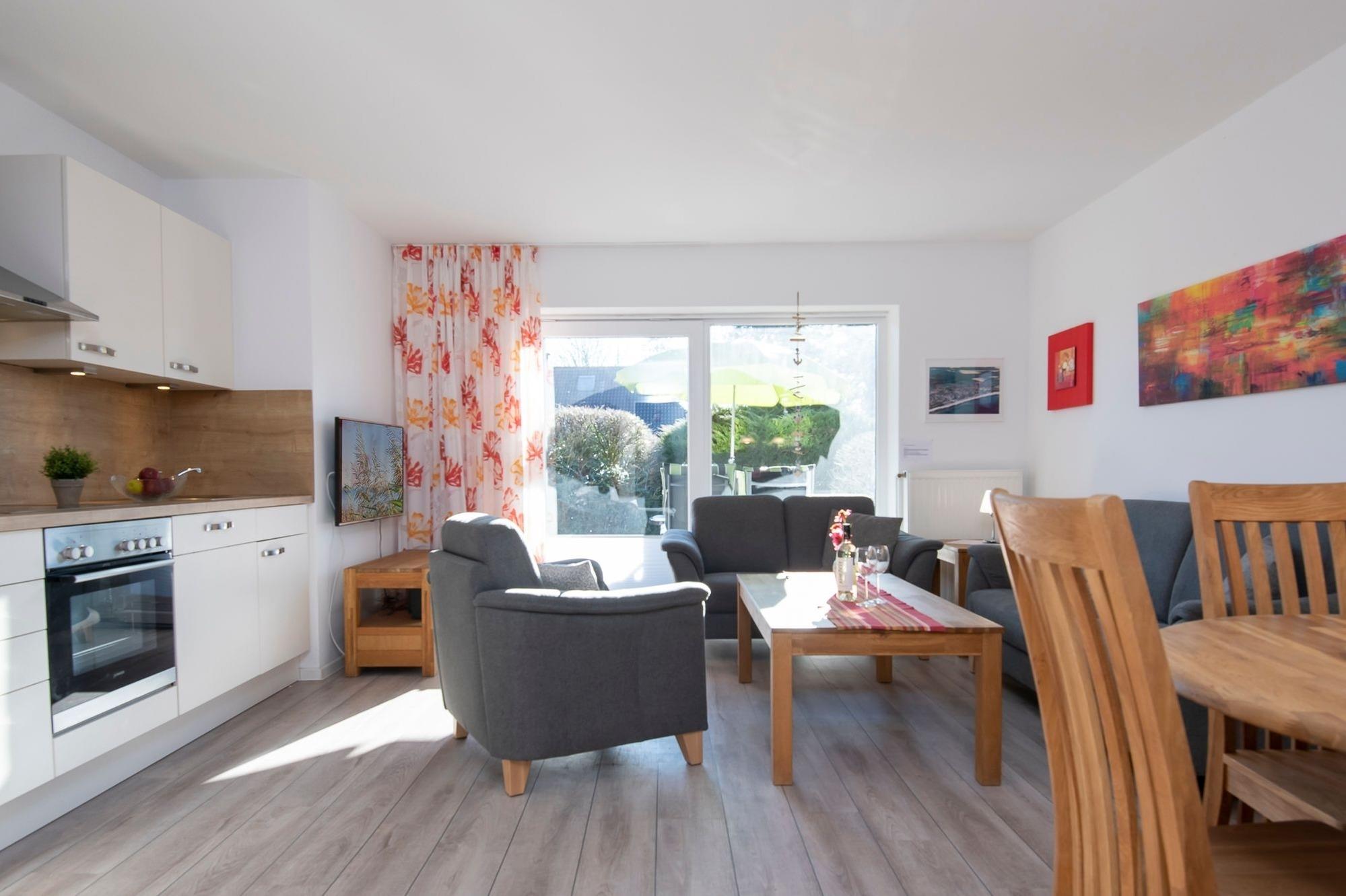 Treten Sie ein, der lichtdurchflutete Wohnbereich empfängt Sie mit einer liebevoll ausgesuchten Einrichtung. Die großzügige kuschelige Polstergarnitur lädt zum Entspannen ein, hier findet jeder seinen Lieblingsplatz. Natürlich können Sie auch die große Fensterfront öffnen und es sich auf der sonnigen, möblierten Terrasse gemütlich machen. Wie wäre es abends mit einem Glas Wein? Auch können Sie hier Ihre Lieblingsspeisen genießen, die Sie zuvor gemeinsam in der komfortablen Küchenzeile im Wohnbereich zubereitet haben. Neben einer Spülmaschine bietet die Küche eine gute Ausstattung, die eine Selbstversorgung im Urlaub angenehm macht. Wunderbar von der Ostsee träumen werden Sie sicher in den beiden Schlafräumen: In dem einen Zimmer steht ein bequemes Doppelbett (2x 90x200 cm) und in dem anderen Zimmer 2 getrennte Betten (je 90x200 cm) sowie ein Kinder-Gitterbett. Hier befindet sich auch ein zusätzliches TV-Gerät. Das helle, moderne Duschbad bietet viel Komfort und sorgt durch eine Waschmaschine (Münzautomat) für eine saubere Urlaubsgarderobe.