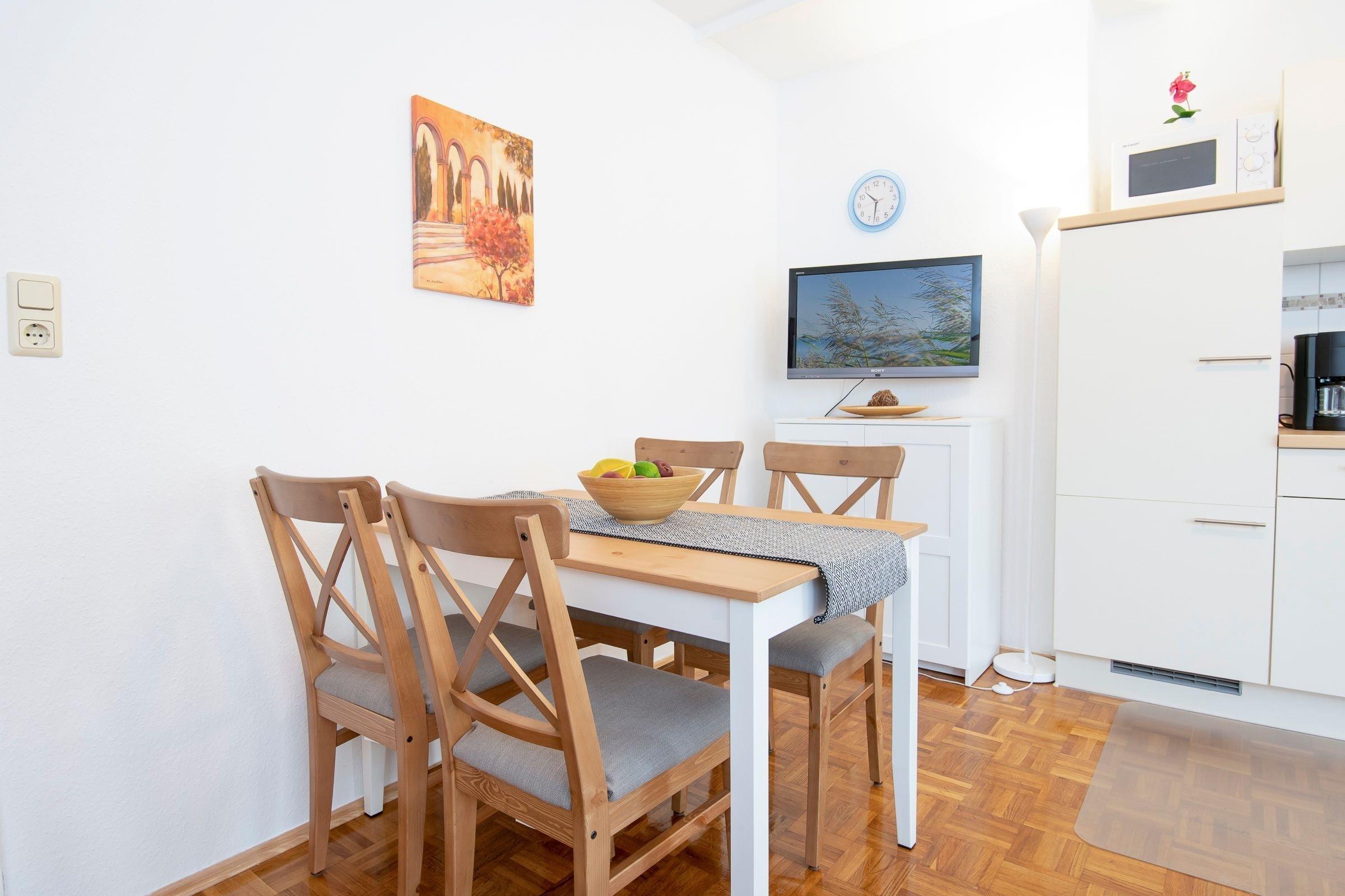 Für Ihr Fahrzeug gibt es einen PKW-Außenstellplatz am Haus. Mitgebrachte Fahrräder können im Fahrradkeller abgestellt werden. Der gemeinschaftliche Waschraum mit Waschmaschine und Trockner (gegen Gebühr) befindet sich im Keller. Außerdem ist ein kostenloser Hochstuhl für die kleinen Gäste vorhanden. WLAN ist inklusive.
