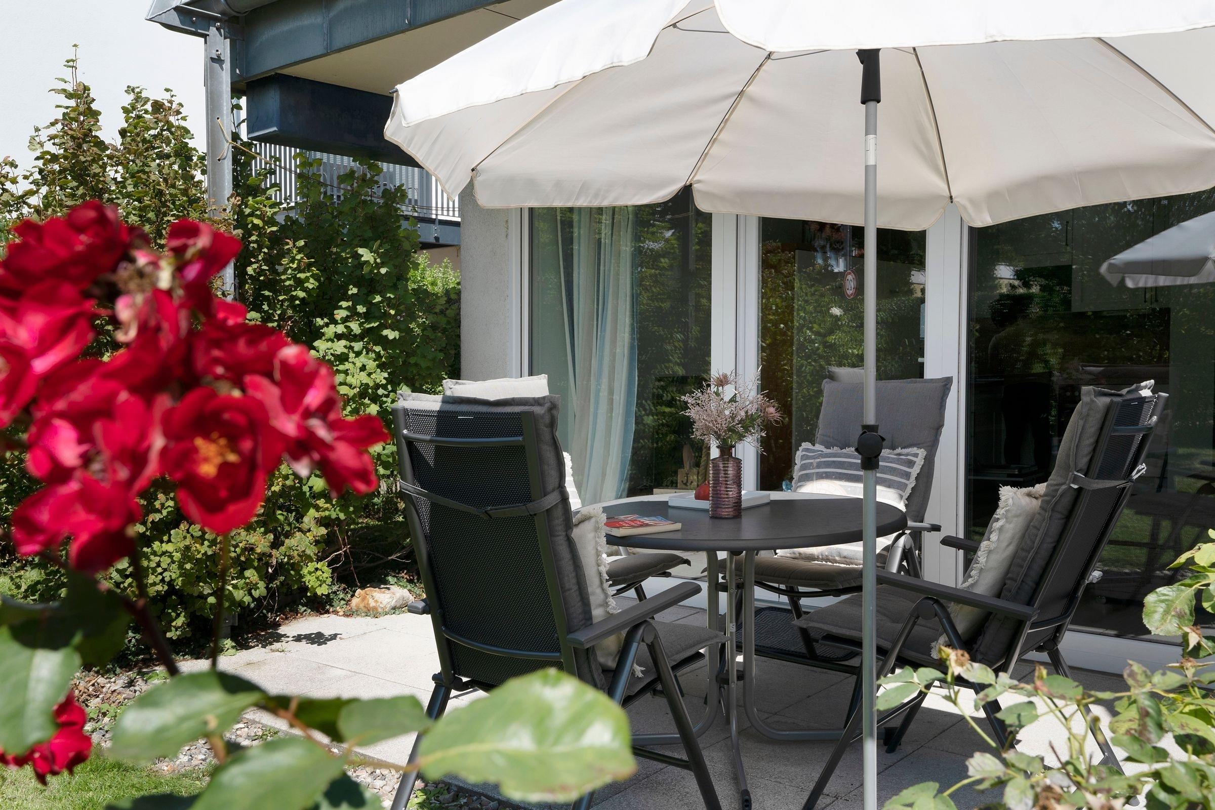 Herzlich Willkommen in Ihrem wohlverdienten Urlaub. Der modern gestaltete Wohnbereich empfängt Sie mit einer gemütlichen Couchecke, die ideal für gesellige Filmabende nach einem schönen Urlaubstag geeignet ist. Das Doppelschrankbett (ca. 160x190 cm) verwandelt diesen Raum im Handumdrehen in einen bequemen Schlafplatz für zwei Personen. Von hier aus gelangen Sie auf die möblierte Terrasse, auf der Sie viele Sonnenstunden genießen können. Die in den Wohnbereich integrierte Küche ist mit Backofen, Geschirrspüler, 4- Platten-Herd, usw. gut ausgestattet. Das separate Schlafzimmer ist mit einem komfortablen Boxspringbett (ca. 160x200cm) möbliert. Das tageslichthelle Badezimmer bietet Annehmlichkeiten wie eine Badewanne, einen beleuchteten Spiegel und eine praktische Handtuchheizung.