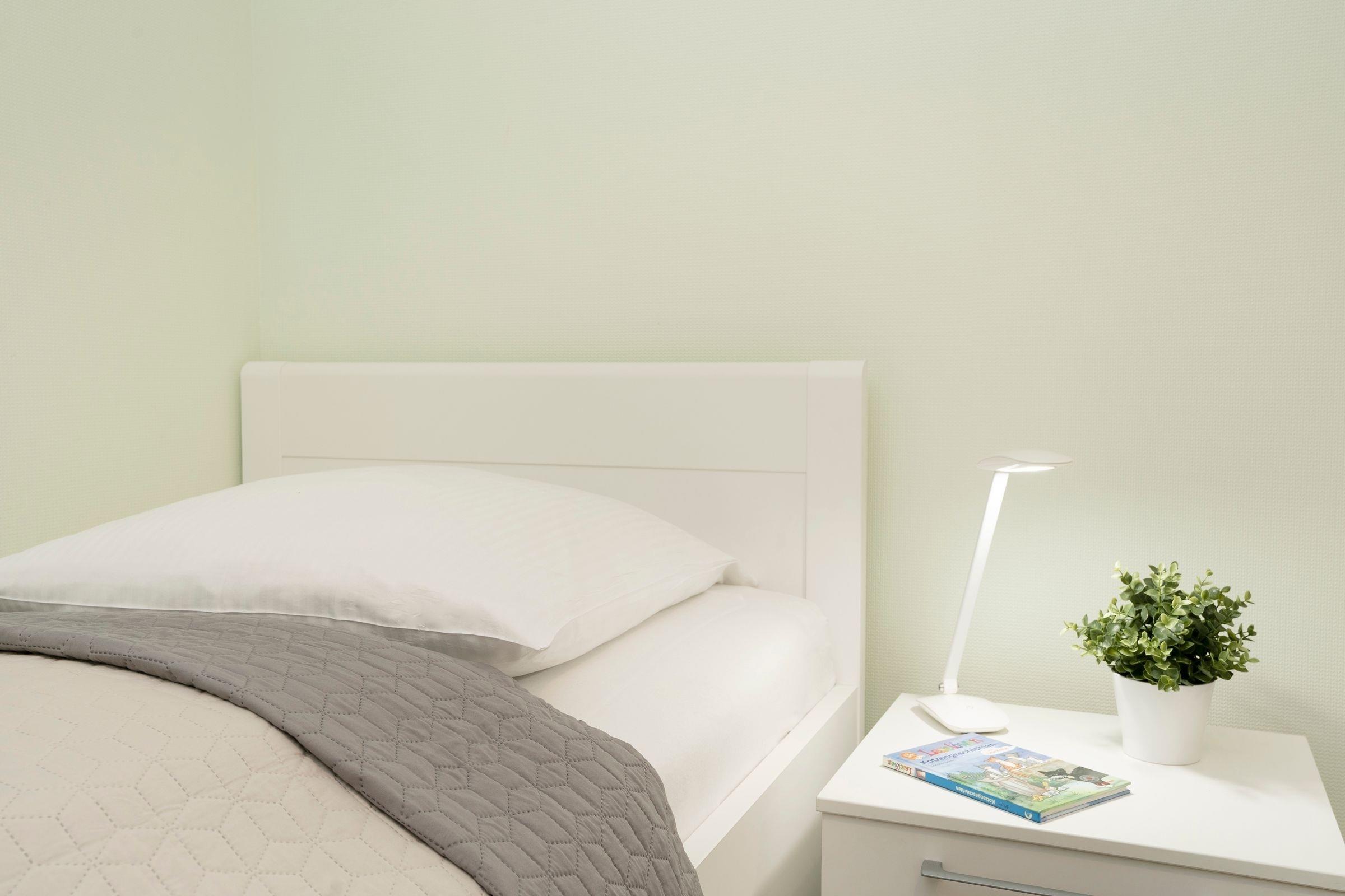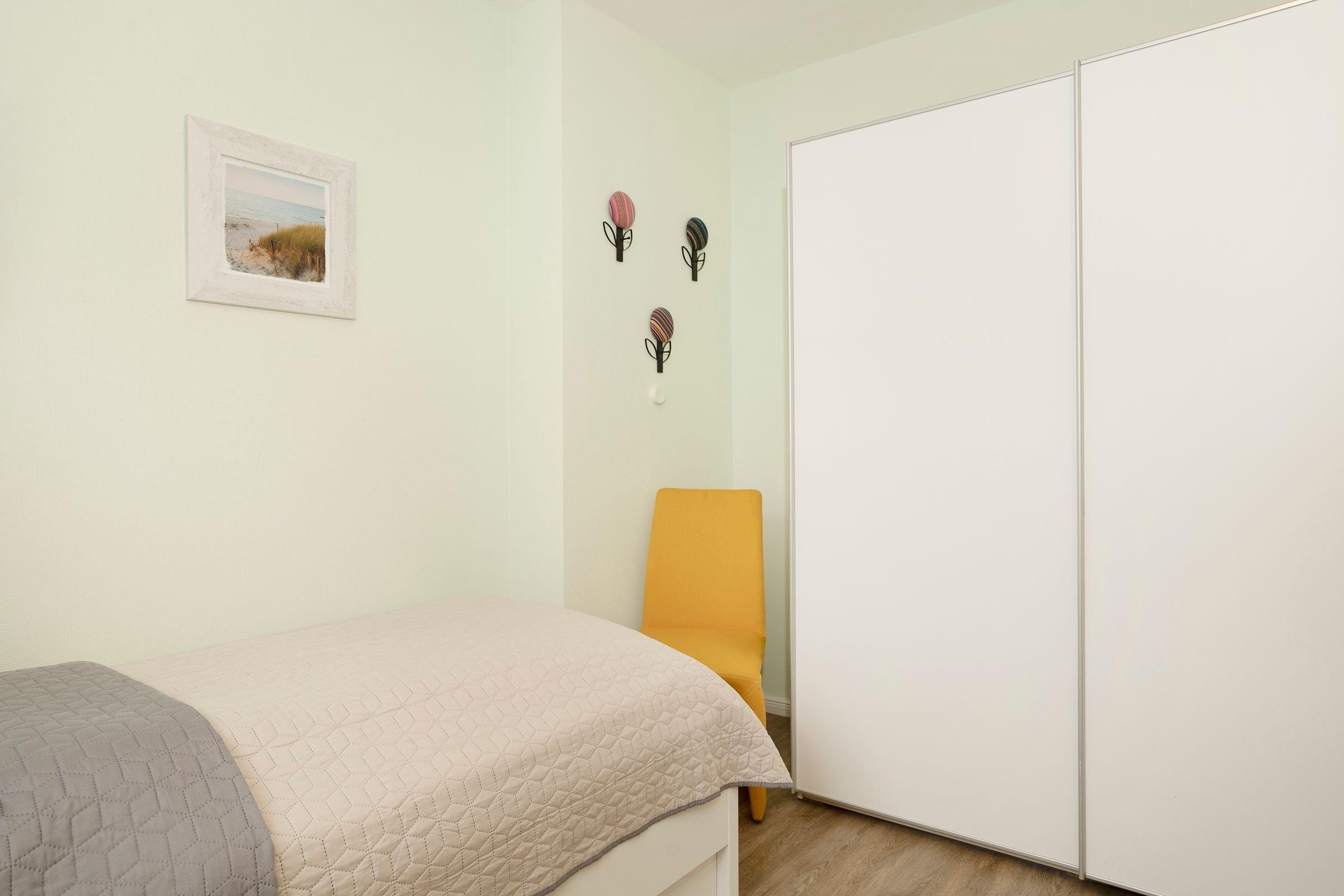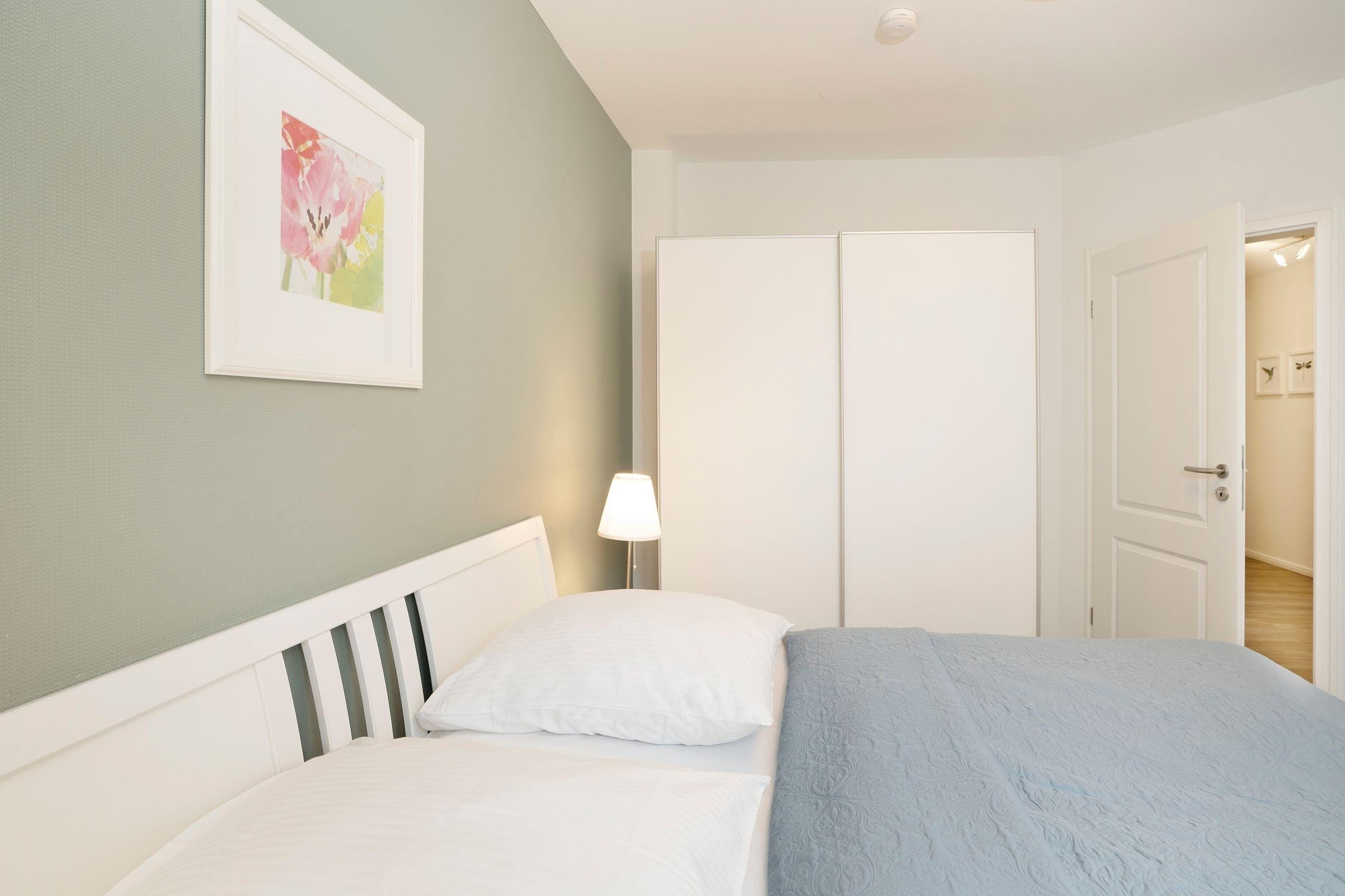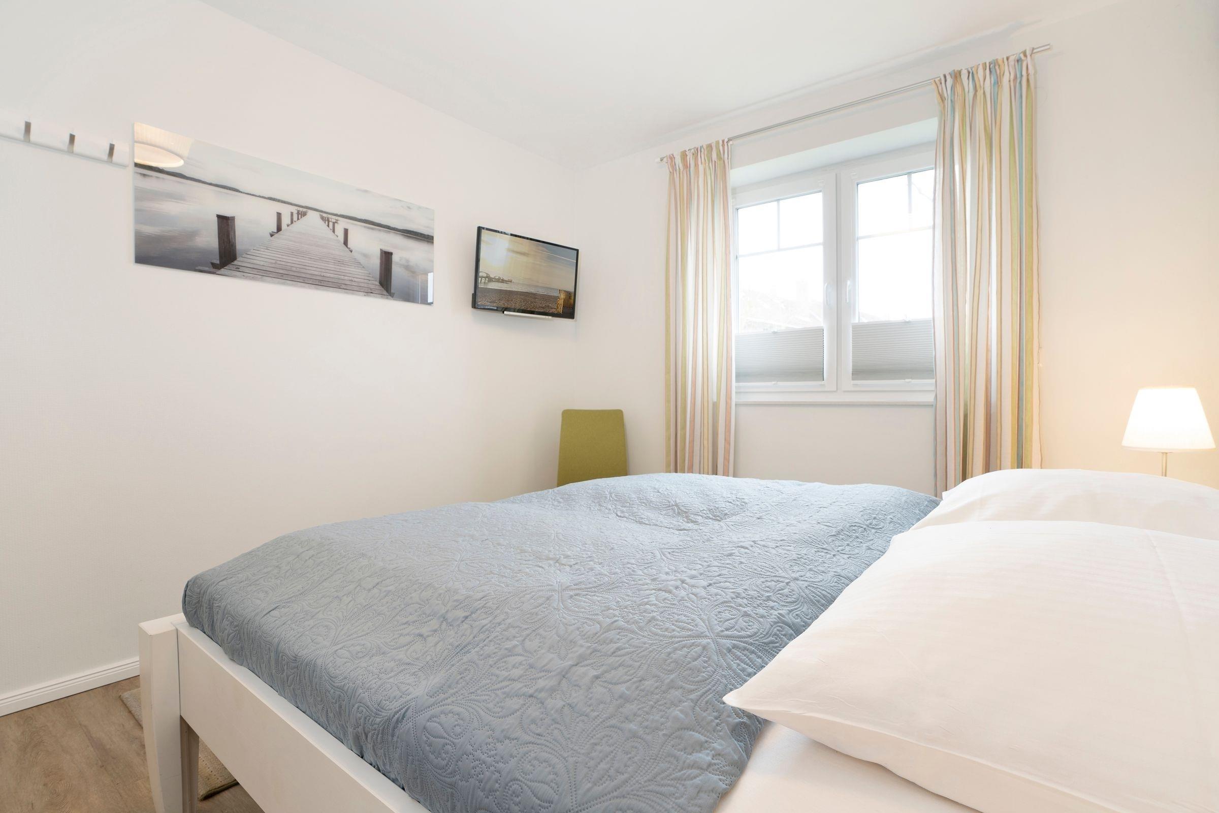 Schlafzimmer 2: 2 Einzelbetten (2x 90x200 cm), Verdunkelung (Plissees, Außenjalousien), verstellbare Lattenroste (Kopf- + Fußteil), TV