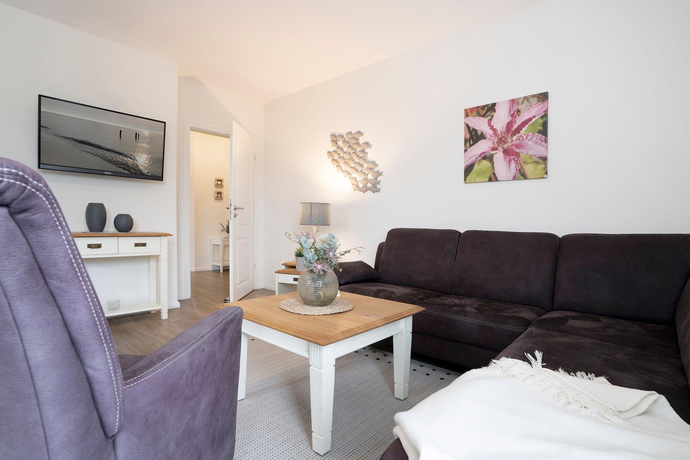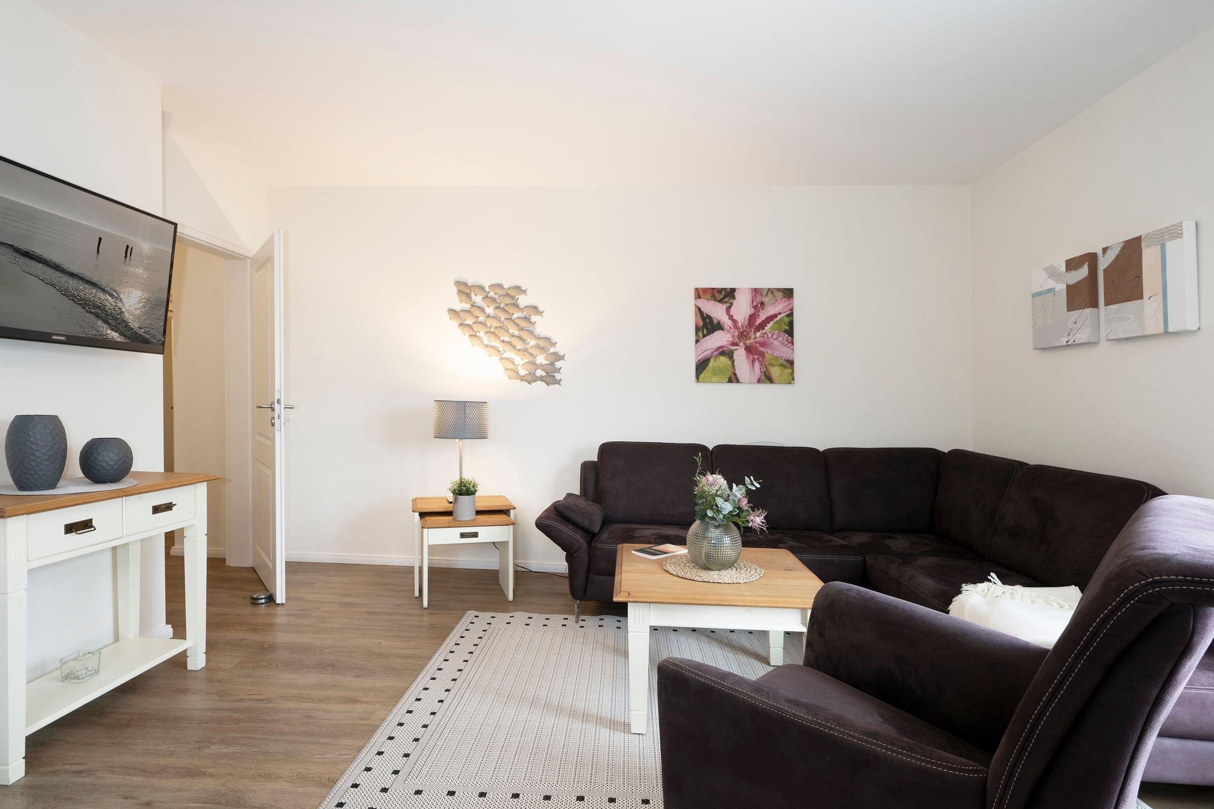 Diese schöne Ferienwohnung erwartet Sie mit einem großzügigem Wohnzimmer mit gemütlichem Ecksofa und integrierter Essecke sowie einem Flachbild-TV. Die integrierte Küche lässt keine Wünsche offen - sie ist mit Geschirrspüler, Mikrowelle, 4 -Platten-Ceranfeld, Backofen, Kaffeemaschine, Wasserkocher etc. ausgestattet. Von hier gelangen Sie auch auf den Balkon mit Süd-West-Ausrichtung. Genießen Sie die Meeresluft und die Sonne bis in die späten Abendstunden. Falls es doch einmal zu heiß werden sollte, spendet Ihnen die Markise ausreichend Schatten. Über den Flur gelangen Sie in das Hauptschlafzimmer mit einem Doppelbett (2x 90x200 cm) und in ein weiteres Schlafzimmer mit 2 getrennt stehenden Einzelbetten (je 90x200 cm) sowie zusätzlichem TV. An den Fenstern im Bad, Wohnzimmer und in beiden Schlafzimmern gibt es Außenjalousien, sodass erholsamer Schlaf garantiert ist. Das Duschbad mit Haarföhn, Waschmaschine und WC rundet das Angebot ab. Für die Kleinsten steht ein Kinder-Reisebettchen sowie ein Hochstuhl und Bollerwagen zur kostenlosen Verfügung.