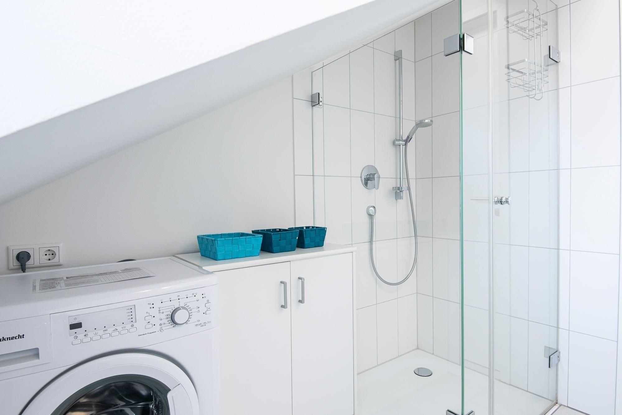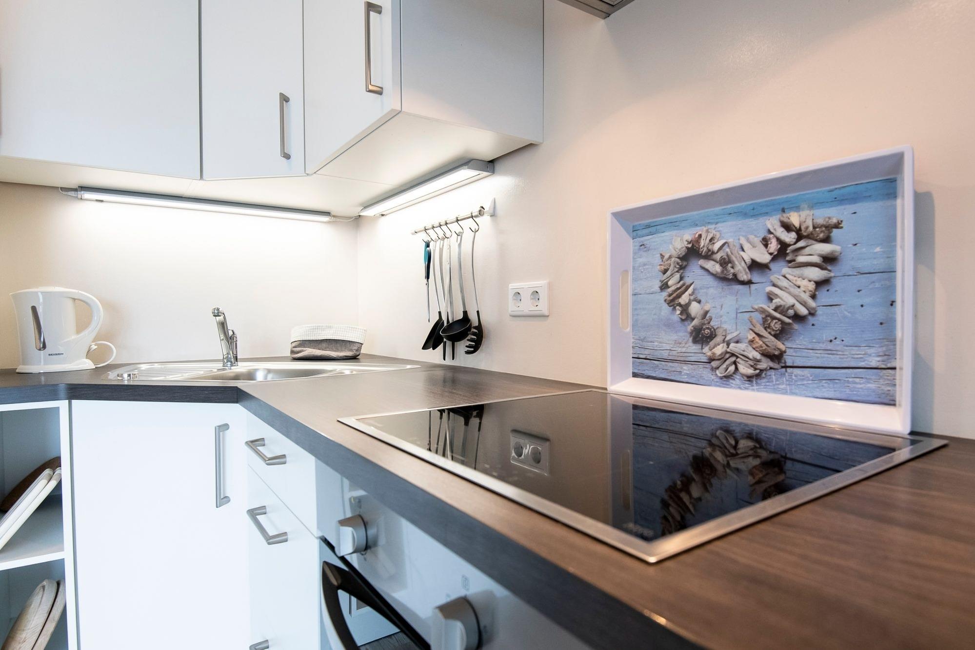 Die Ferienwohnung ist modern eingerichtet und begeistert mit ihrem offenen Raum, welcher Küche, Wohn- und Essbereich verbindet. Der sonnige Balkon in Süd-West Lage lädt zum Entspannten ein, sodass sie viele Sonnenstunden sowie den Sonnenuntergang genießen können. Die Küche ist großzügig angelegt und voll ausgestattet, sodass Sie sich problemlos Ihre Leibspeisen zubereiten können. Im ersten Schlafzimmer gibt es ein Doppelbett (180x200cm) sowie ein zusätzliches TV-Gerät. Im zweiten Schlafzimmer stehen zwei Einzelbetten (90x200cm). Ausreichend Stauraum für Ihre Urlaubsgarderobe ist im großen Kleiderschrank vorhanden. Das Badezimmer bietet eine bodentiefe Dusche sowie eine Waschmaschine zur freien Nutzung. Kinder-Reisebett, Hochstuhl und Bollerwagen runden das Angebot ab.