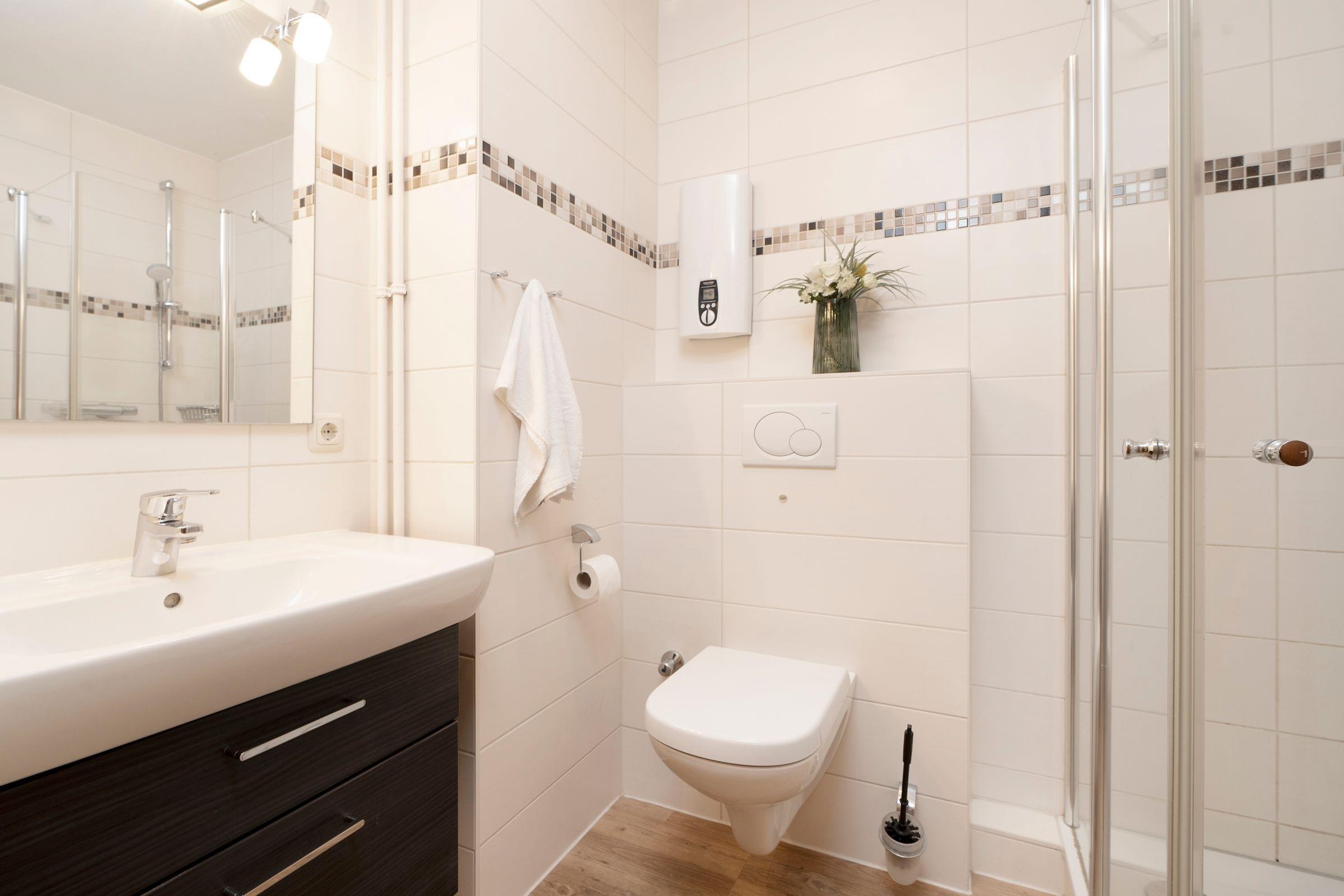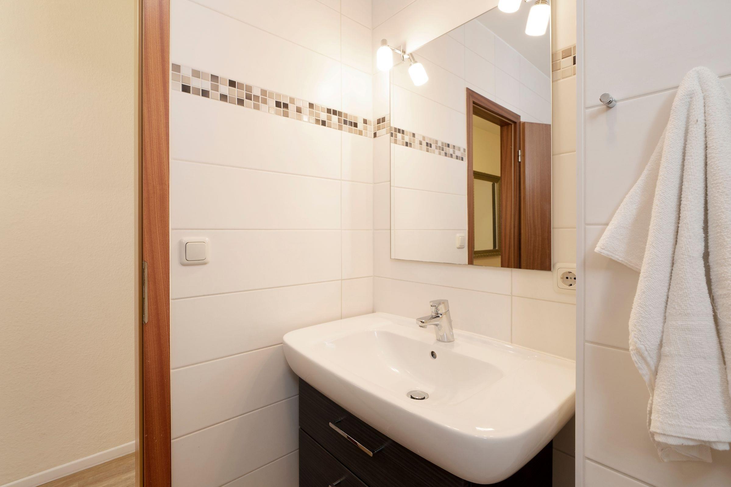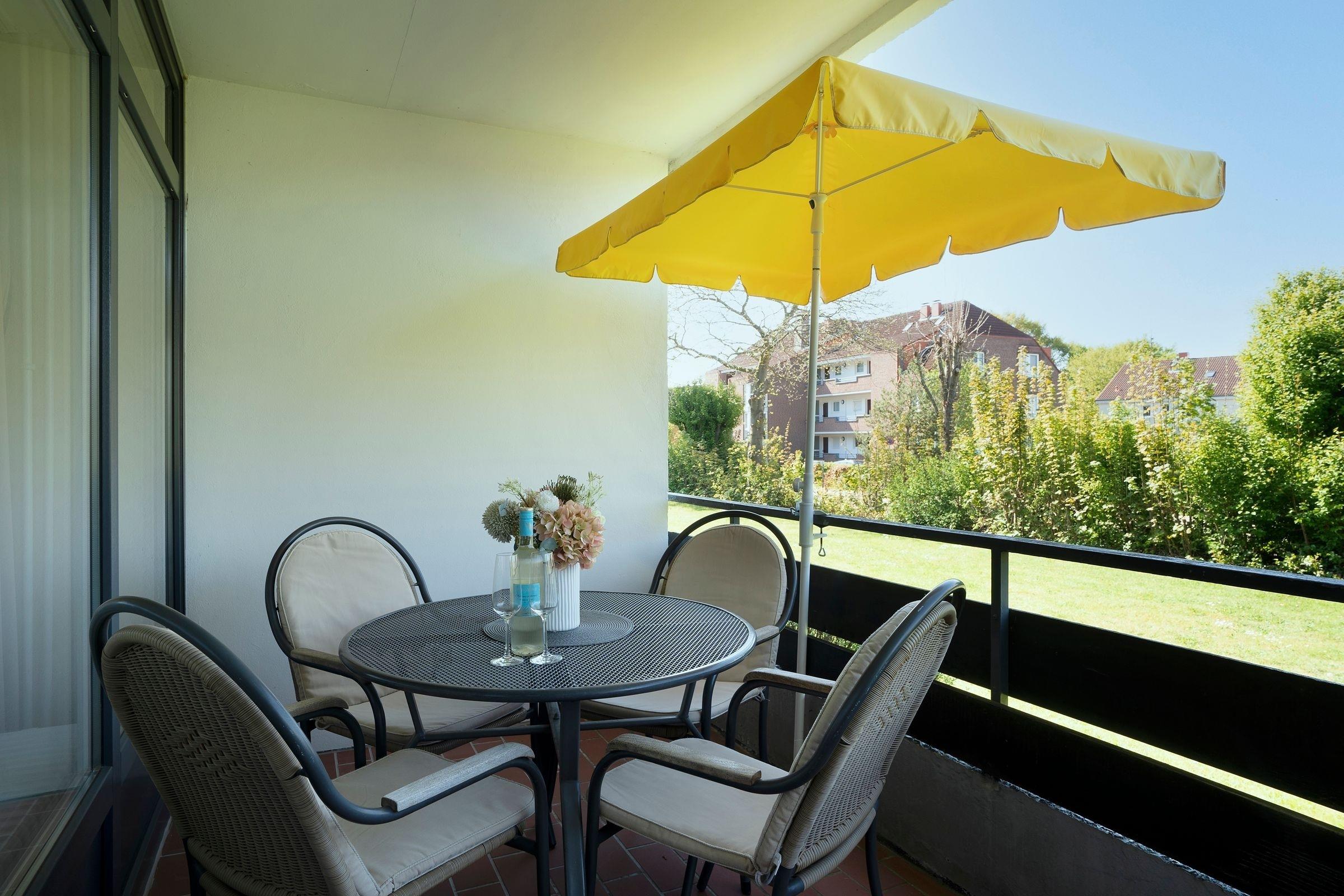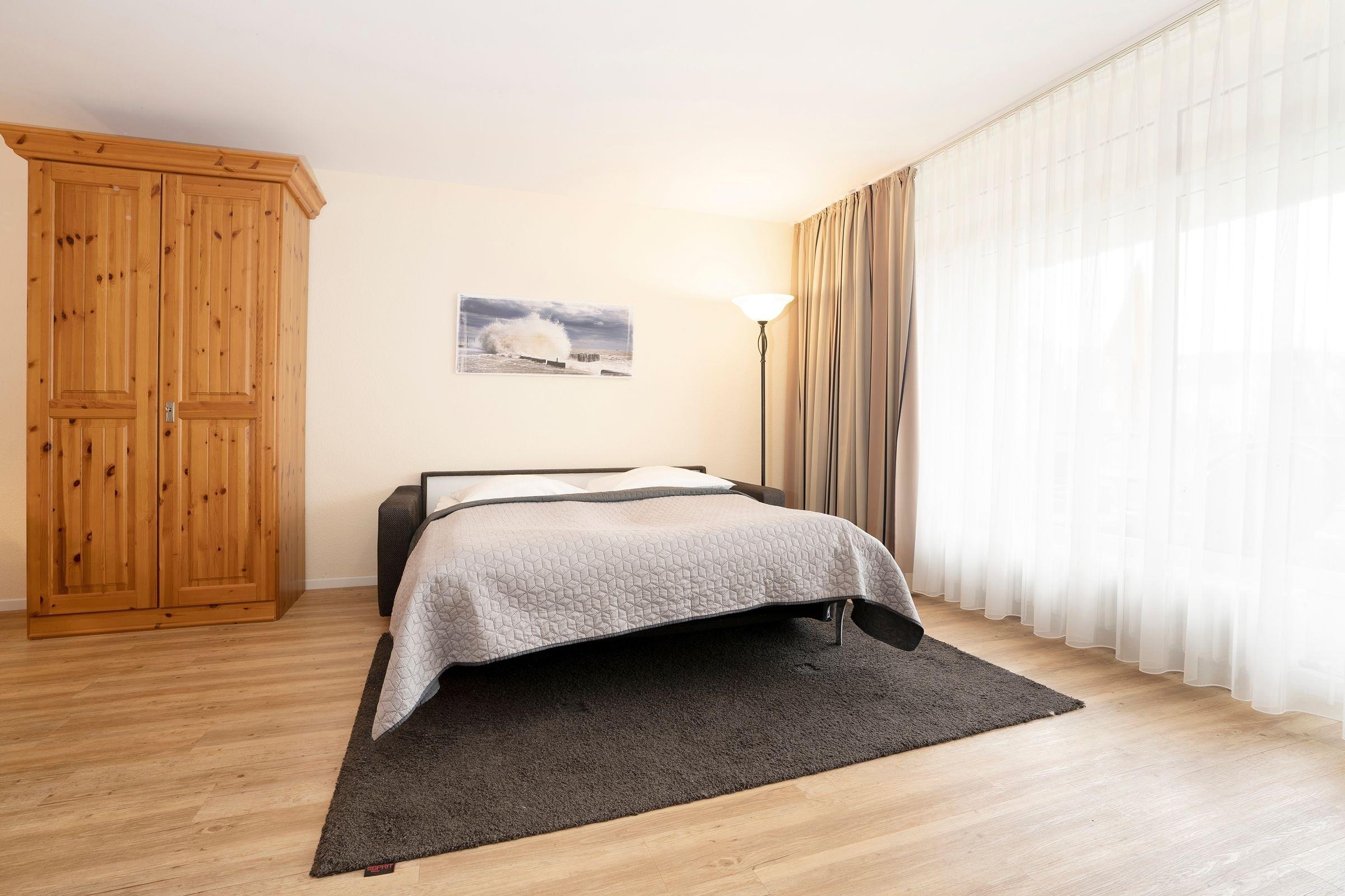 Sie werden von einem großzügig gestalteten Wohn- und Essbereich mit Wohlfühlcharakter empfangen. Die Sofaecke im Wohnzimmer bietet den perfekten Ort, um nach einem ereignisreichen Tag am Meer bei einem Film zu relaxen. Die Schlafcouch (ca. 160x200 cm) lässt sich mit nur wenigen Handgriffen zu einem gemütlichen Schlafplatz umwandeln. Wenn Sie noch nicht genug Meeresluft hatten, können Sie diese auf dem großzügigen Balkon mit Südlage auch ganz entspannt zuhause genießen. Lassen Sie ihren kulinarischen Ideen freien Lauf in der modernen Einbauküche mit Ceran-Kochfeld, Backofen, Mikrowelle, Geschirrspüler, Kaffeemaschine, Toaster etc. Außerdem verfügt dieses Feriendomizil über ein Schlafzimmer mit zwei getrennt stehenden Betten (je 90x200 cm) Das schöne Duschbad mit WC ist komfortabel und hell eingerichtet.