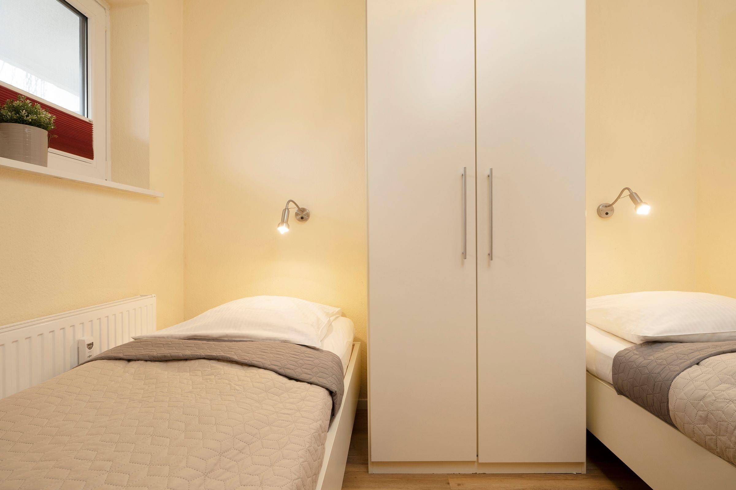 Schlafzimmer: 2 Einzelbetten (je 90x200 cm), Kleiderschrank, Verdunkelungsmöglichkeit