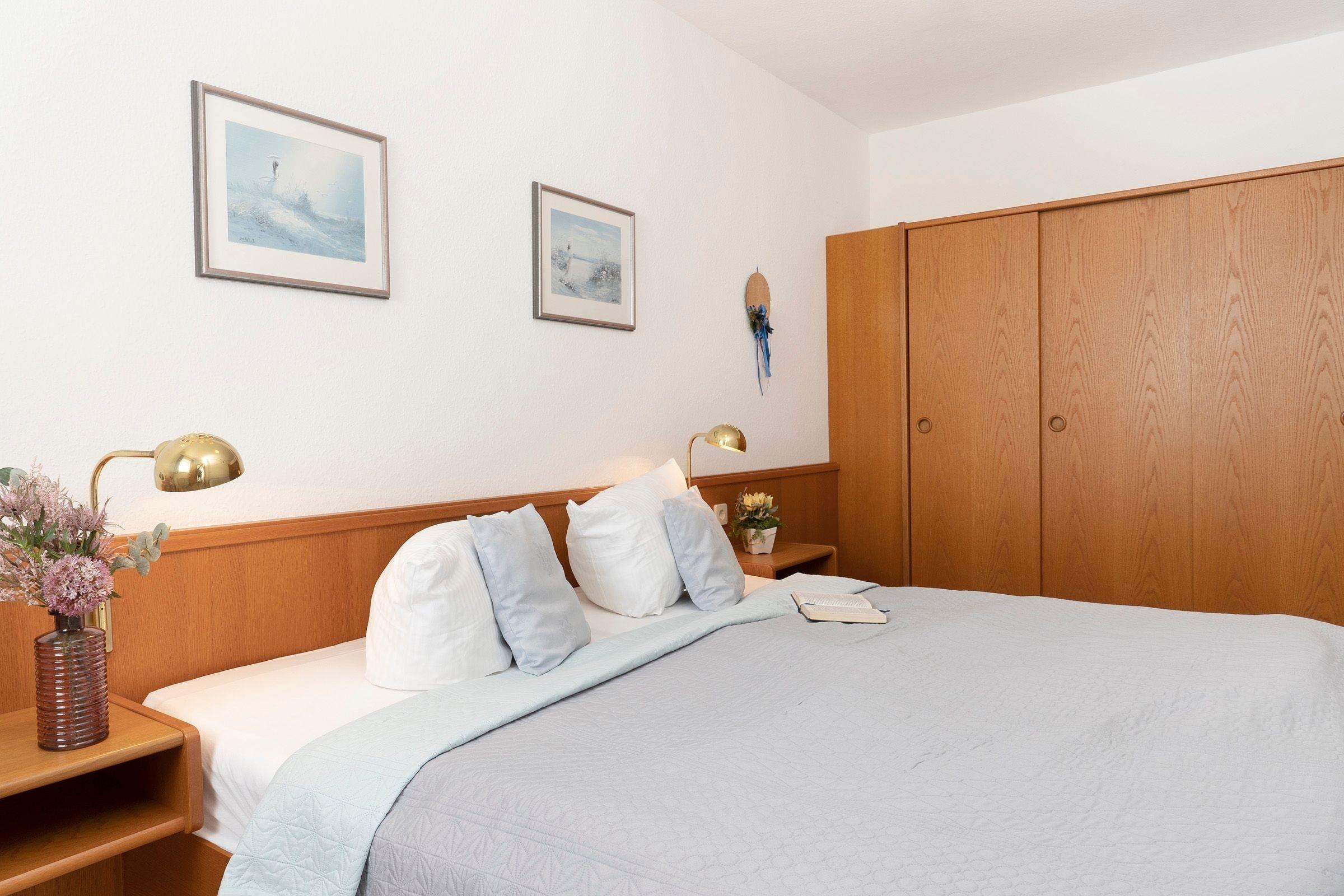 Schlafzimmer: 1 Doppelbett (2x 90x200 cm), Kleiderschrank, Verdunkelung (Gardinen)