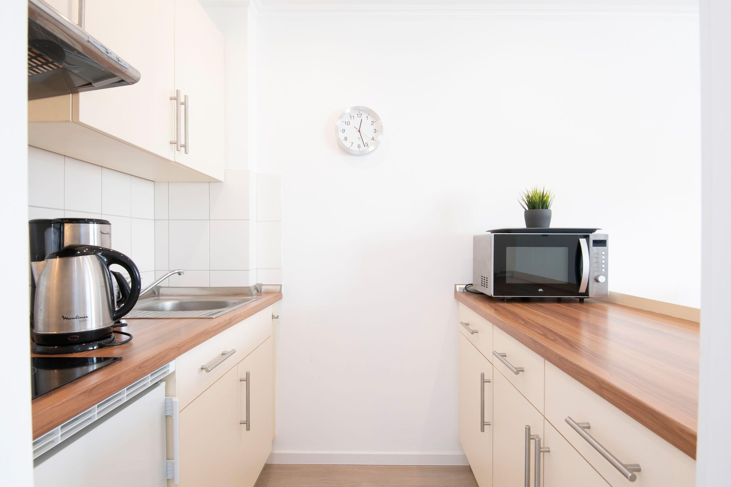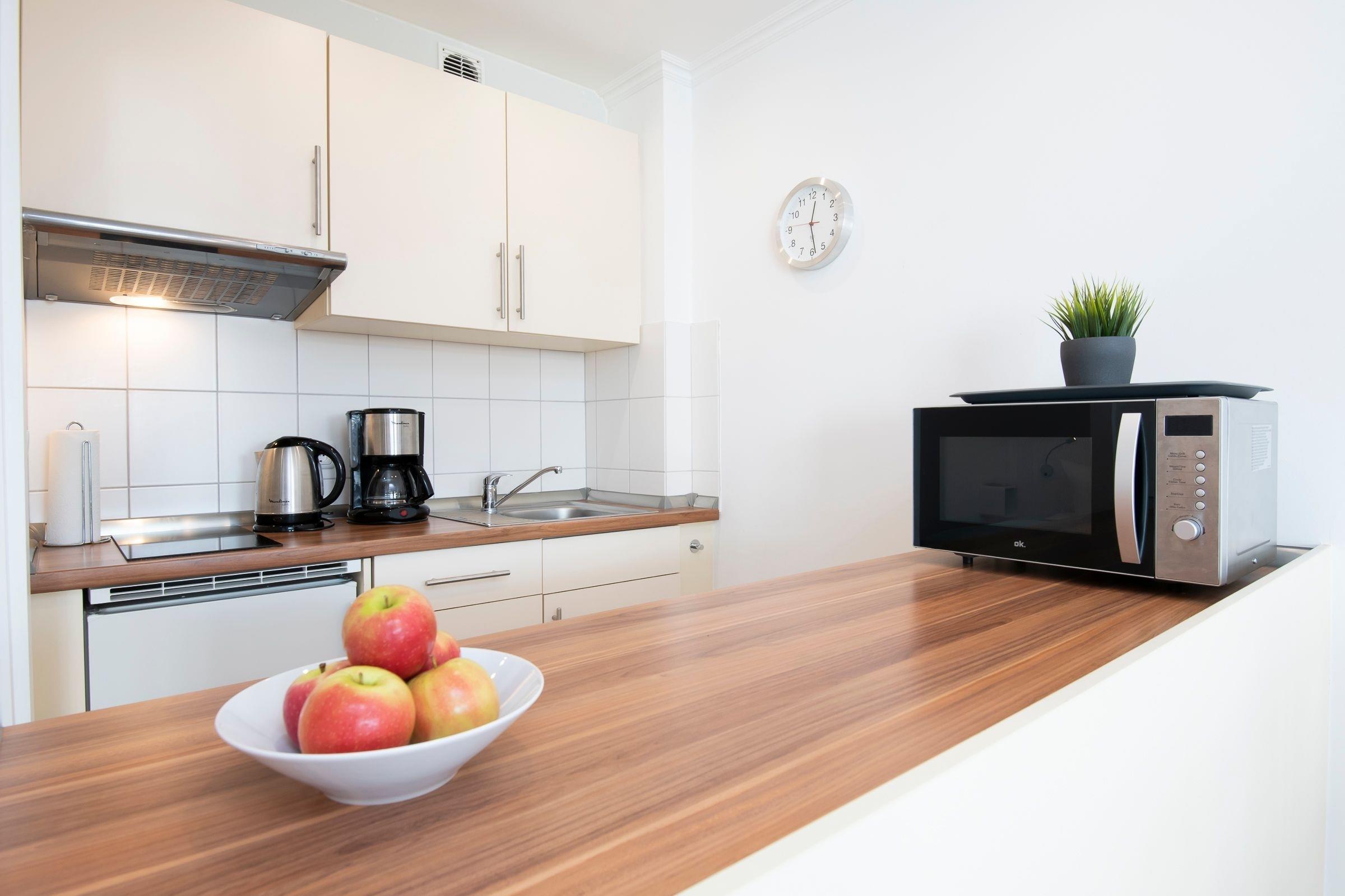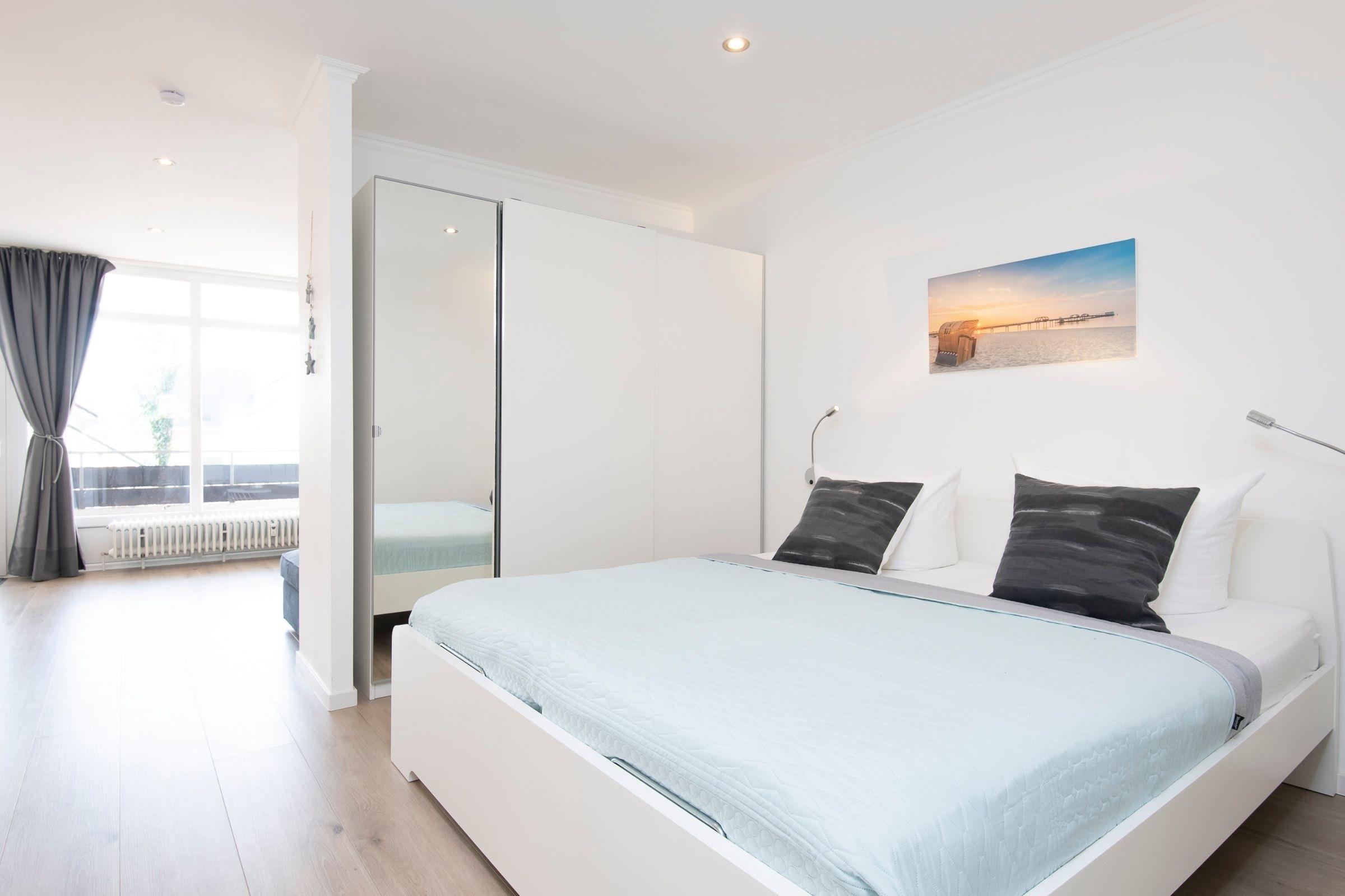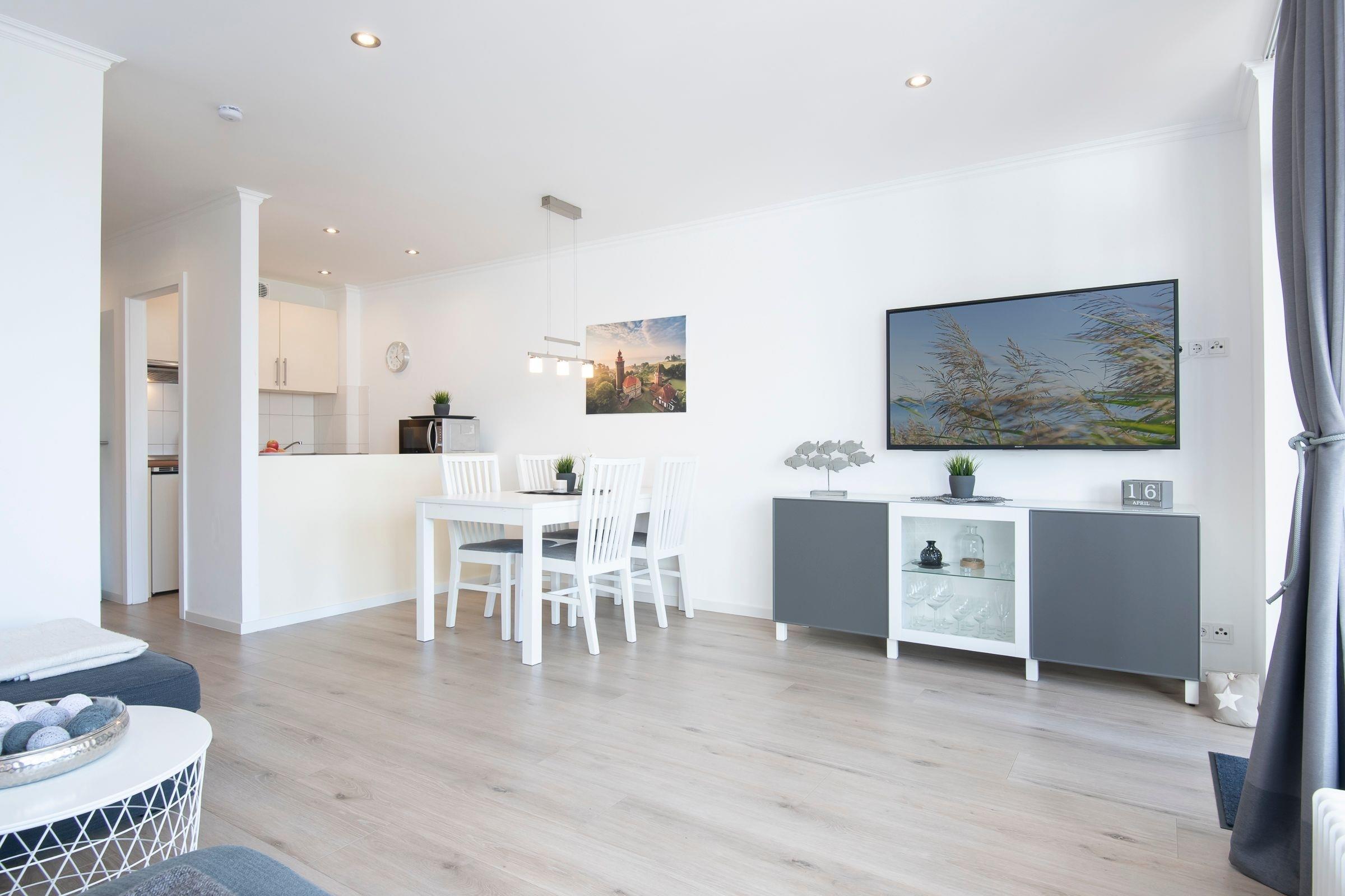 Ihr Urlaub beginnt bei Betreten dieser schicken Ferienwohnung mit offenem Raumkonzept. Es begrüßt Sie ein modern gestalteter Wohn- und Essbereich mit behaglicher Sofaecke, die zum erholen einlädt. Unterhaltung bietet Ihnen der 55 Zoll Flachbild-TV mit integriertem Radio. Außerdem erreichen Sie von hier auch den großzügigen Sonnen-Balkon, der den idealen Ort für ein entspanntes Frühstück oder einen lauen Sommerabend bietet. Die angrenzende, helle Küche ist u.a. mit einem 2 Platten-Cerankochfeld, Mikrowelle, Geschirrspüler, Kaffeemaschine, Toaster und Wasserkocher ausgestattet und lässt keine Wünsche offen. In dem im Wohnzimmer integrierten Schlafbereich finden zwei Urlaubsgäste im gemütlichen Doppelbett (180x200cm) Ihre Nachtruhe. Über den Flur gelangen Sie in das separate Schlafzimmer mit zwei Einzelbetten (jeweils 90x200 cm). Das innenliegende helle Duschbad mit Handtuchwärmer und Fön rundet das Angebot ab. Hier lässt es sich gut entspannen.