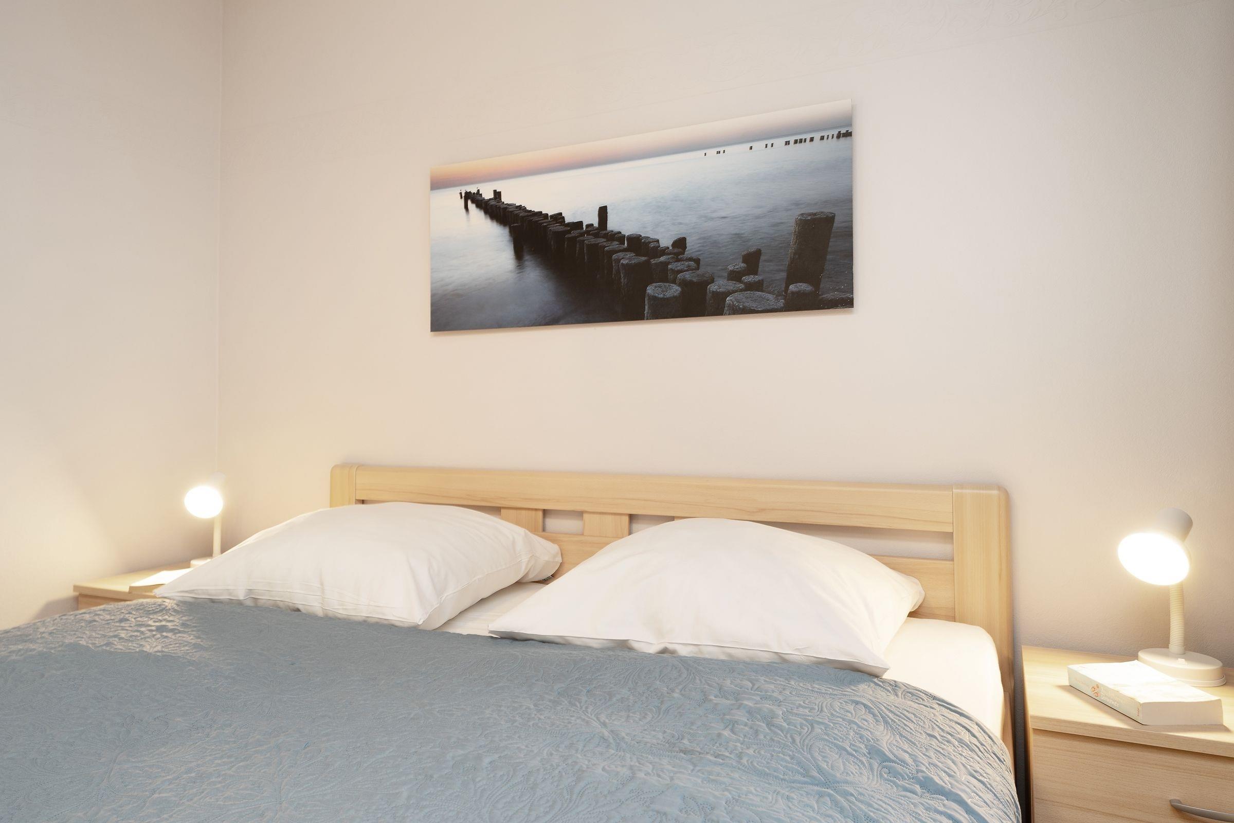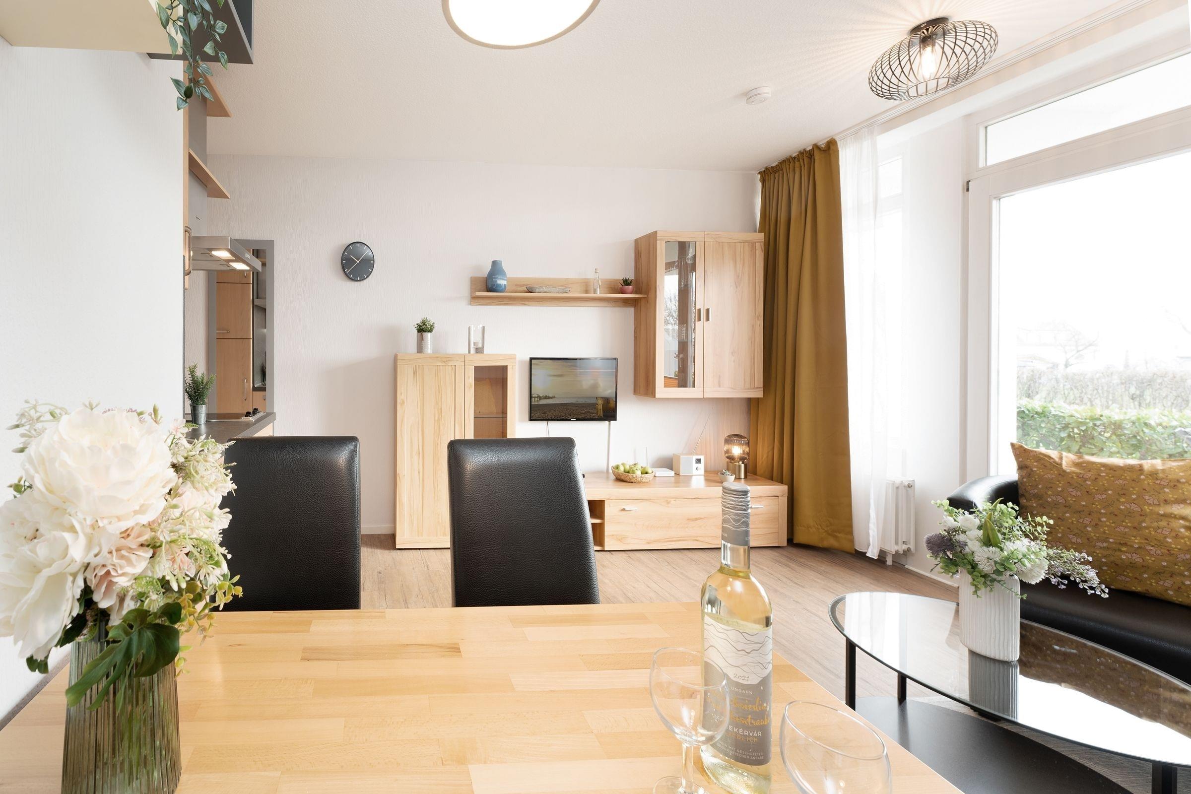 Der Ostsee so nah ... Treten Sie ein in Ihre modern eingerichtete Ferienwohnung. Sowohl gemütliche Filmabende als auch erholsame Nächte erwarten Sie im liebevoll gestalteten Wohnschlafzimmer mit einer Schlafcouch (150x180 cm). Für ausreichend Unterhaltung sorgen der Kabel-TV (Flachbild) mit DVD-Player und ein Radio. Ein Highlight dieser Ferienwohnung ist die Terrasse mit Meerblick und Morgensonne. Ideal, um die ersten warmen Sonnenstrahlen zu genießen und mit einem ausgiebigen Frühstück in den neuen Urlaubstag zu starten. In der hochwertig ausgestatteten Küche mit Ceranfeld, Kühl-Gefrier-Kombi, Mikrowelle, Toaster etc. finden Sie alle wichtigen Geräte und Utensilien, um Ihre Lieblingsgerichte auch im Urlaub problemlos zuzubereiten. Im hell eingerichteten Schlafzimmer erwartet Sie ein komfortables Doppelbett (2x 90x200 cm), das für süße Träume und einen erholsamen Schlaf sorgt. Abgerundet wird das Angebot durch das moderne Duschbad mit komfortabler bodentiefer Dusche.