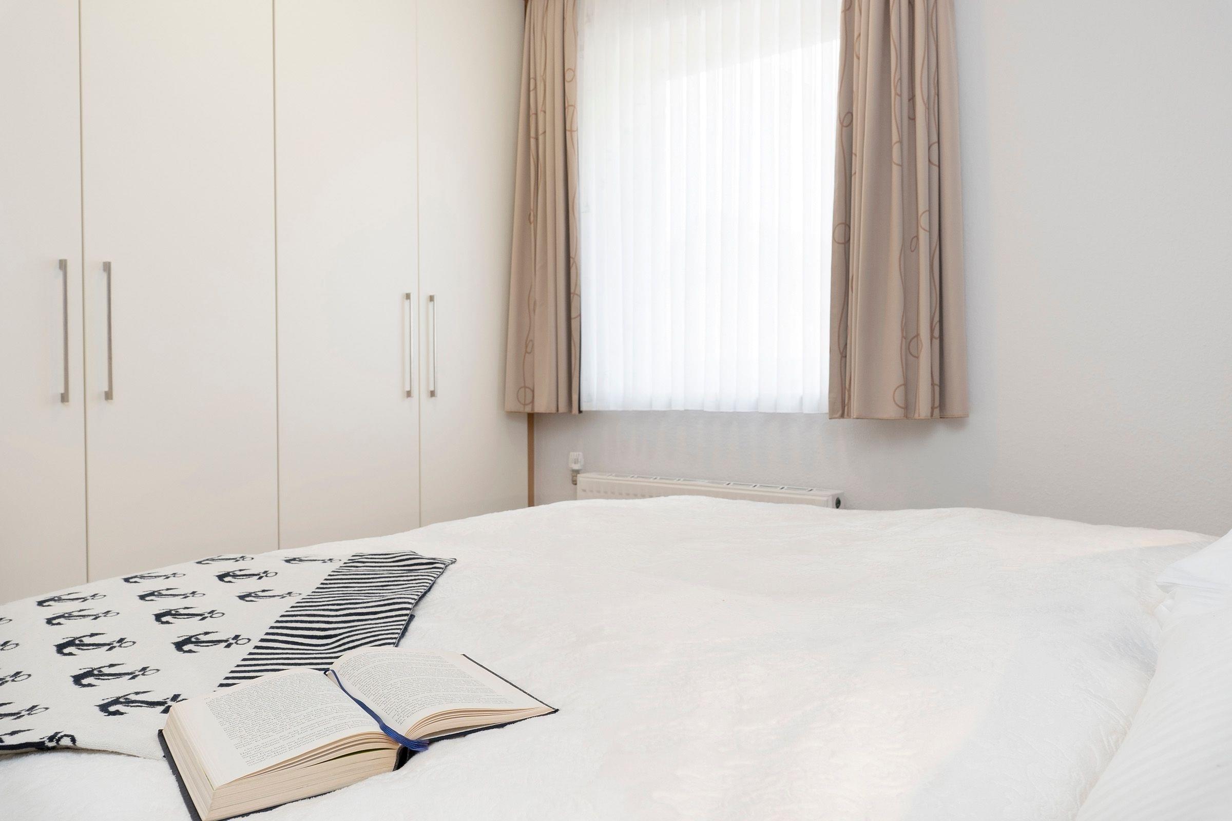 Schlafzimmer: 1 Doppelbett (2x 90x200 cm), Kleiderschrank, Verdunkelung (Gardine)