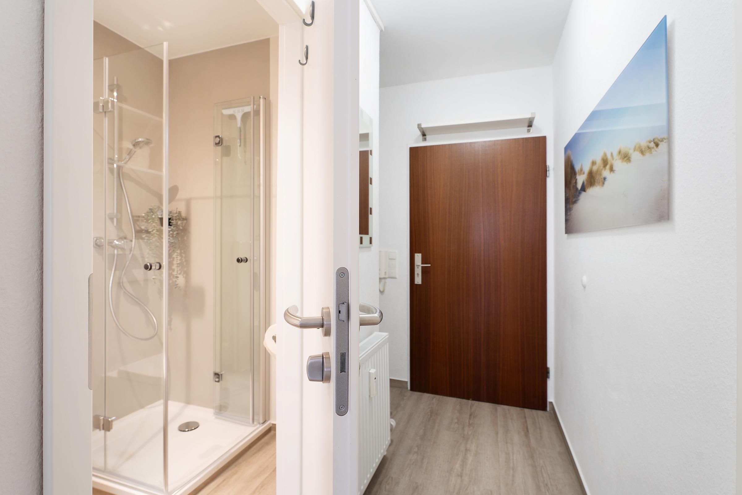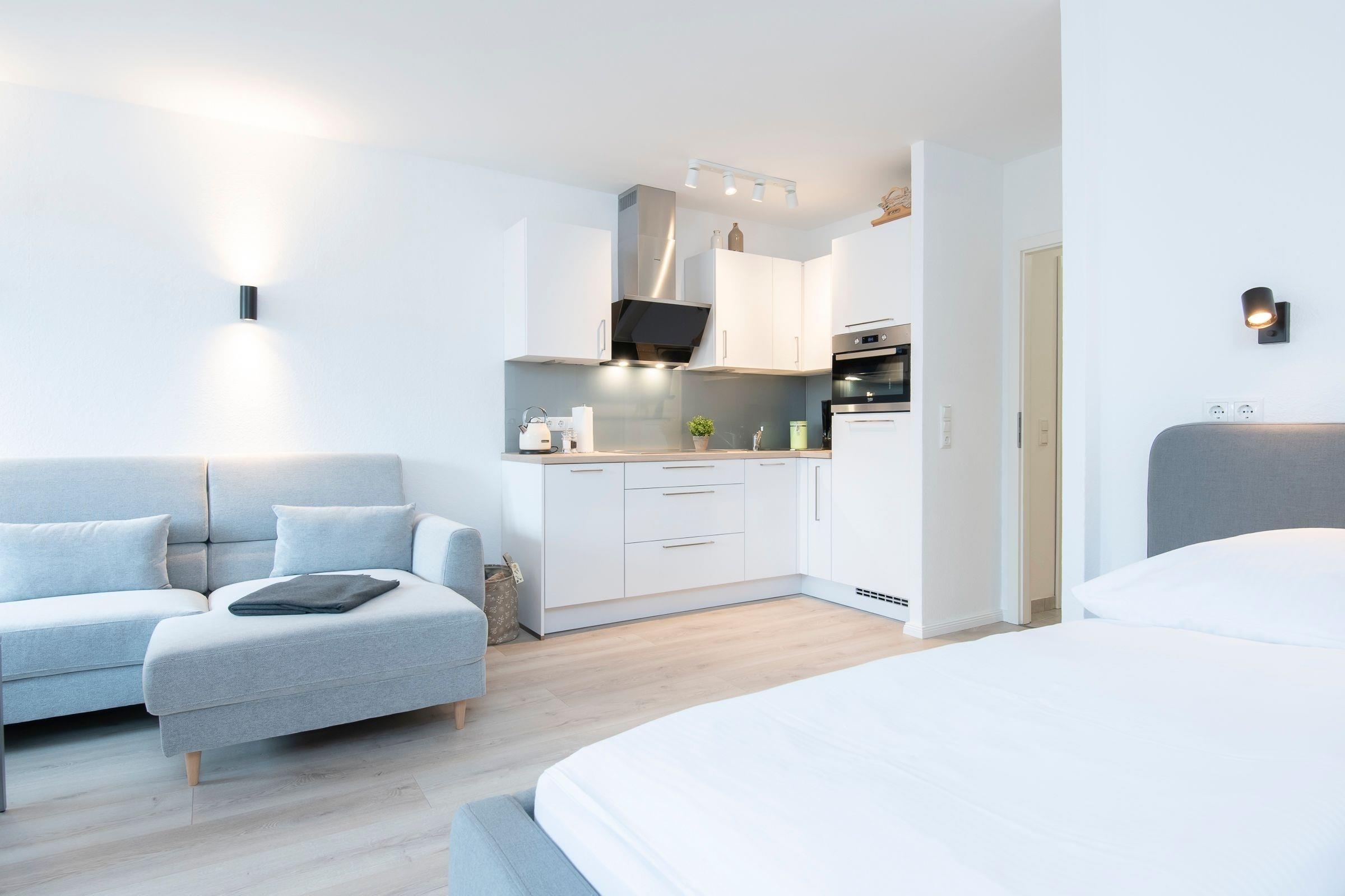 Das Herzstück der Ferienwohnung ist der offene Wohn-, Ess- und auch Schlafbereich. Eine gemütliche Couch mit TV-Gerät sowie ein Essbereich mit Platz für 4 Personen garantieren gesellige Urlaubsstunden. Ein komfortables Doppelbett (160x200 cm) lädt nach einem ereignisreichen Urlaubstag zum Träumen und Entspannen ein. Die offene, gut ausgestattete Küche ist klein aber fein und verspricht Komfort bei der Zubereitung schmackhafter Köstlichkeiten. Vom Wohnbereich aus haben Sie Zugang auf den möblierten Balkon, auf dem Sie unbeschwert mit einem Glas Wein auf Ihren Urlaub anstoßen können. In einem separaten, innenliegenden Schlafzimmer laden zwei Einzelbetten (2x 90x200 cm) zum Träumen ein. Ein hell gefliestes Duschbad mit großem beleuchteten Spiegel rundet die Ausstattung dieser schönen Ferienwohnung ab.