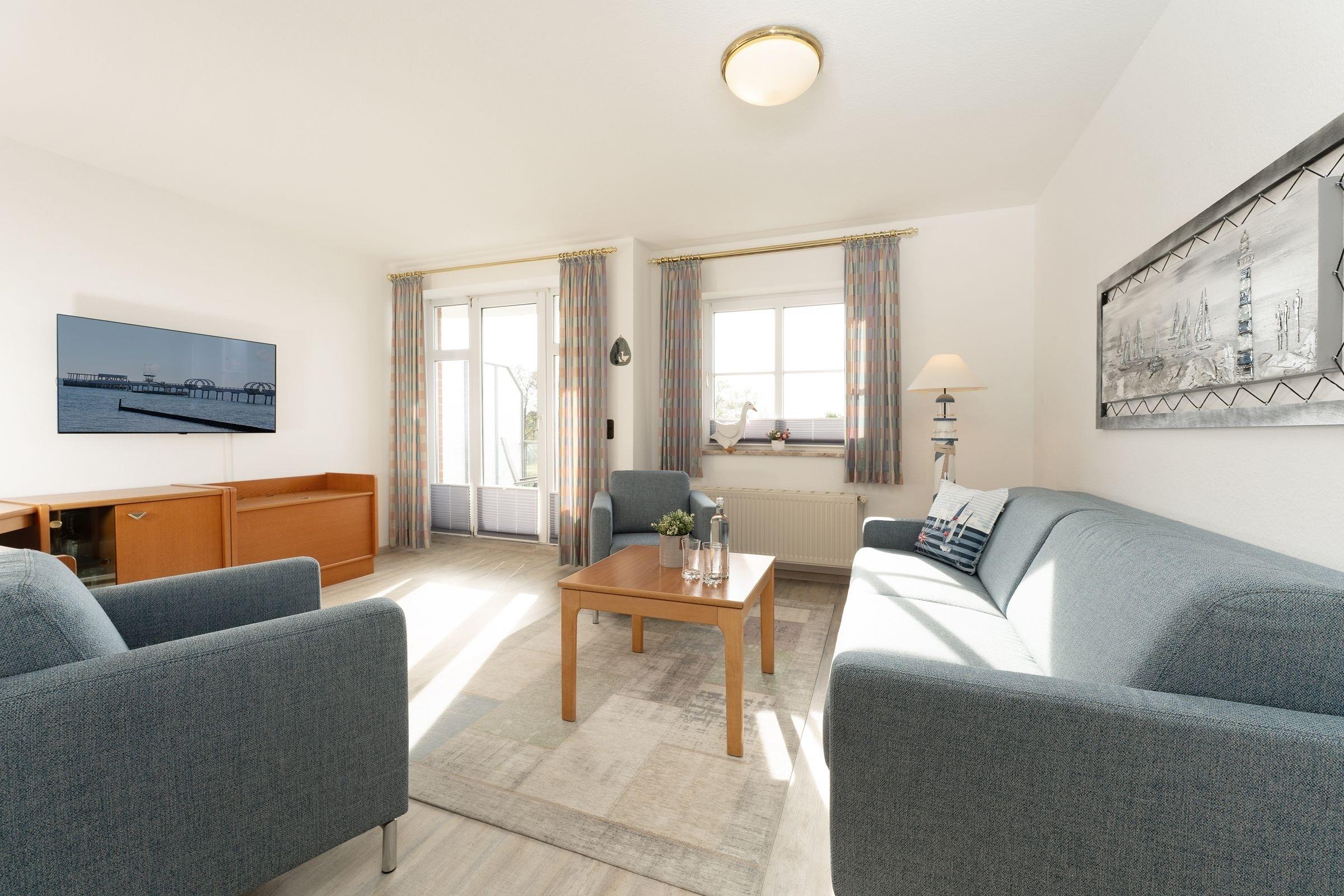 Stellen Sie sich vor, Sie können vom Balkon aus die Ostsee sehen, hören, riechen ... die Ferienwohnung Muschelkiste im gepflegten Ferien-Wohnpark Kaiserhof macht dies möglich. Der Wohnbereich empfängt Sie mit einer gemütlichen Polster-Garnitur und TV-Gerät. Hier können Sie prima ausspannen – noch etwas besser geht dies wohl nur auf dem möblierten Balkon. Ist das nicht ein grandioser Blick auf die Ostsee? Der perfekte Ort, um auf einen schönen Urlaub anzustoßen. Die helle, offene Küchenzeile und die komfortable Ess-Ecke befinden sich vom Wohnbereich etwas abgetrennt in einer Nische. Zaubern Sie hier gemeinsam Ihre Urlaubs-Menüs. Die Spülmaschine erledigt anschließend den Abwasch. Für die Nacht steht Ihnen einerseits die Doppelbettcouch (ca. 160x200 cm) im Wohnzimmer zur Verfügung. Wie wäre es hier noch mit einem guten Buch vor dem Einschlafen? Zum anderen verfügt das separate Schlafzimmer über ein Doppelbett (2x 90x200 cm). Hier werden Sie sicher himmlisch träumen. Das Duschbad hat einen beleuchteten Spiegel und verspricht einen guten Start in den Tag.