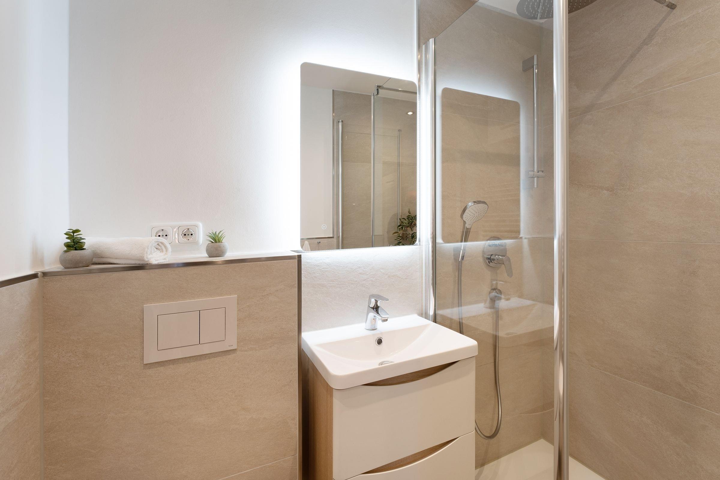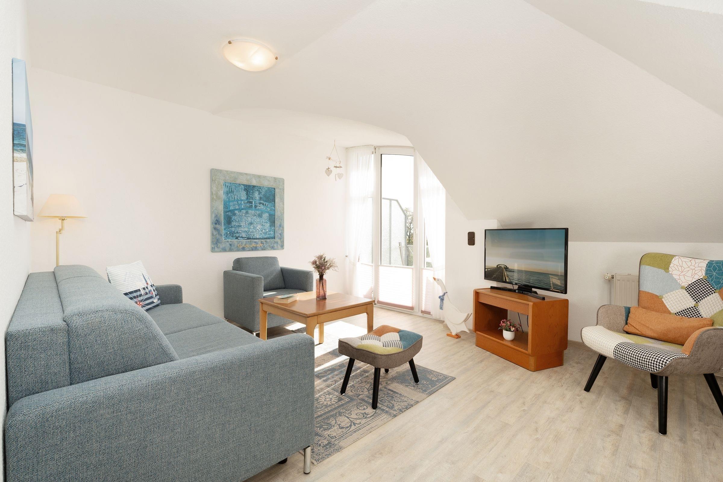 Sie träumen davon, im Urlaub der Ostsee ganz nah zu sein? Dann schauen Sie sich die gemütliche Ferienwohnung Muschelfischer im gepflegten Ferien-Wohnpark Kaiserhof einmal genauer an: Sie ist nur rund 120 Meter vom Strand entfernt und bietet zudem einen traumhaften Meerblick. Die Dachschrägen zaubern im Wohnbereich eine besondere Atmosphäre. Machen Sie es sich auf den Polstermöbeln bequem und freuen Sie sich über Ihre Auszeit. Am besten geht es gleich raus auf den möblieren Balkon – ein traumhaftes Panorama erwartet Sie hier. Genießen Sie die Sonne und die wunderbare Aussicht und stoßen Sie auf Ihren wohlverdienten Urlaub an. Die offene Küchenzeile sowie einen Ess-Platz finden Sie im Wohnbereich um die Ecke, wo Sie in Ruhe neue Rezepte aus der Region testen können. Nach einem tollen Tag an der Ostseeküste stehen Ihnen 2 Schlafmöglichkeiten zur Verfügung: Die Couch im Wohnzimmer lässt sich mühelos in ein Doppelbett (ca. 160x200 cm) verwandeln. Im separaten Schlafzimmer wartet zudem ein Doppelbett (2x 80x200 cm). Wir wünschen angenehme Träume. Das helle Duschbad ist mit einem beleuchteten Spiegel ausgestattet.